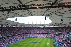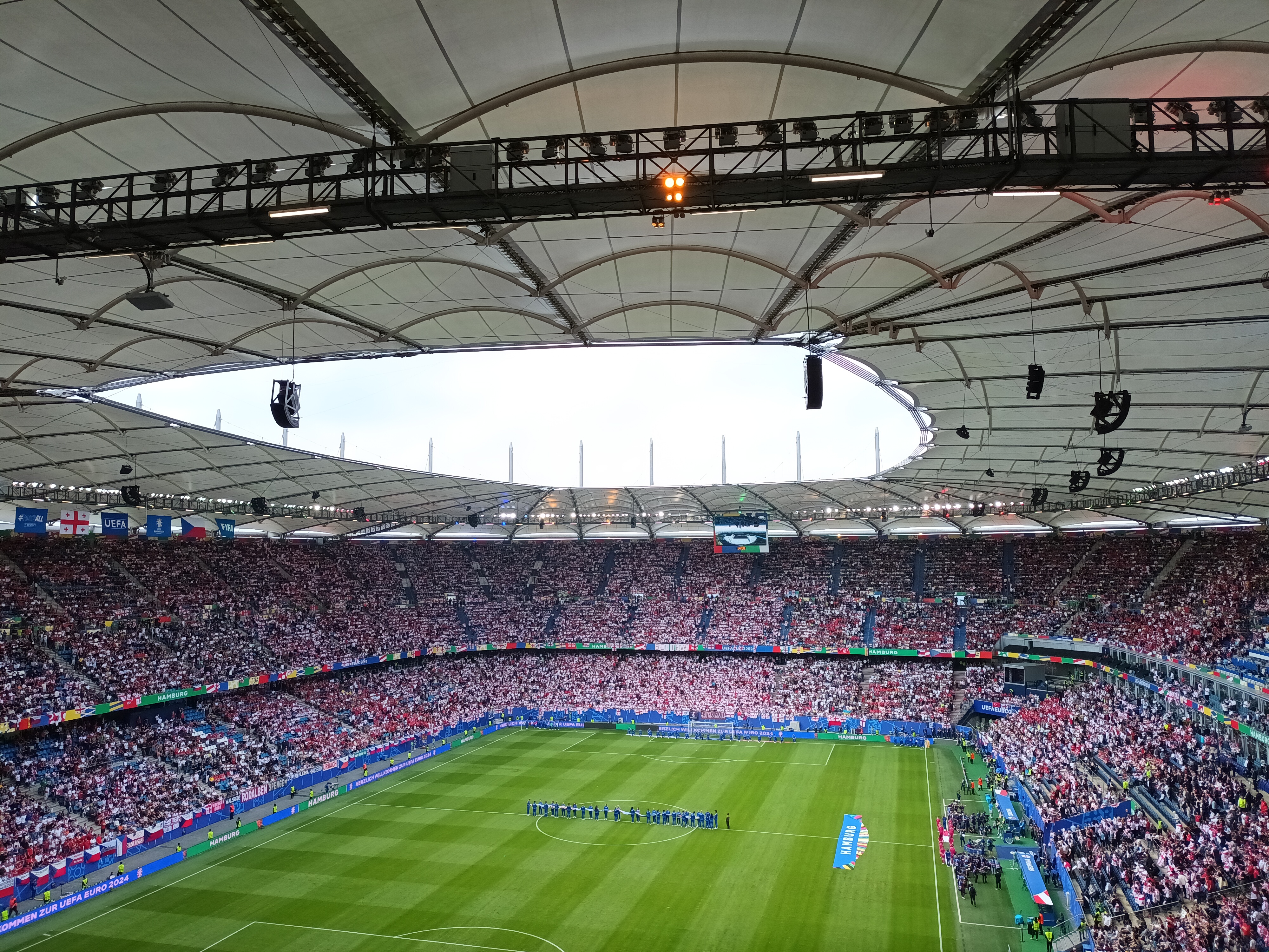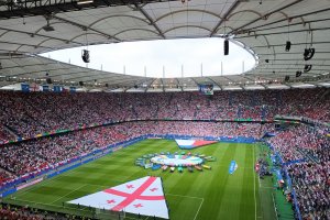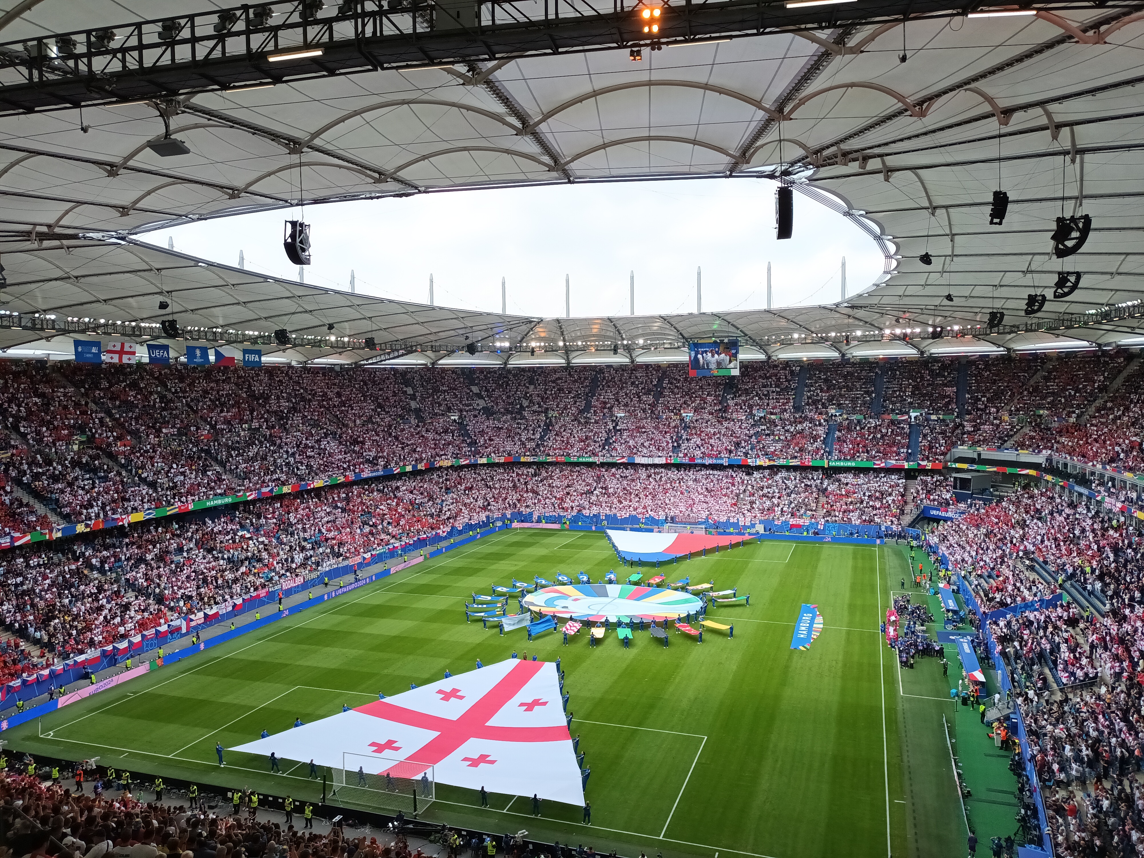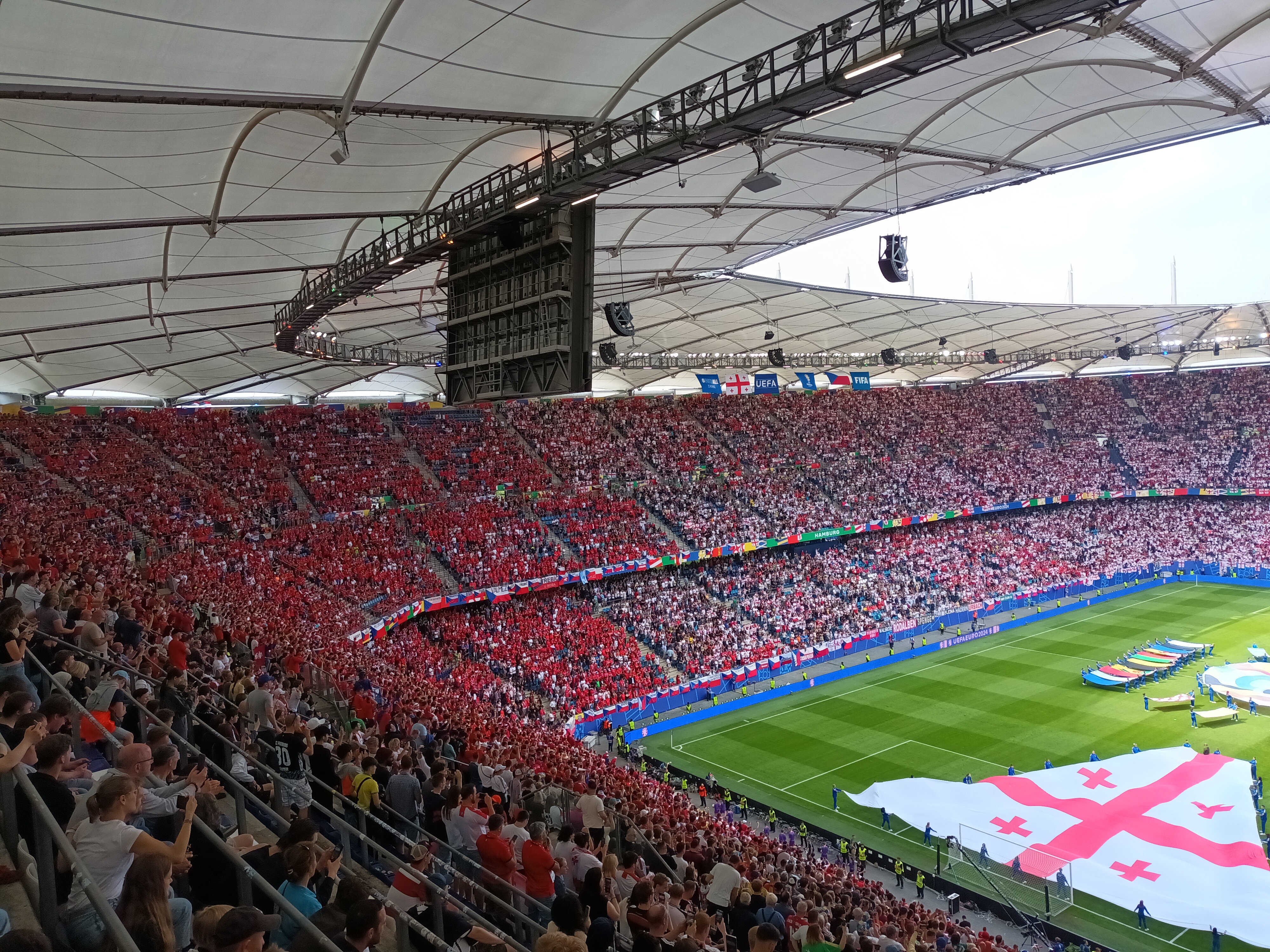 Samstag, 22. Juni 2024, 15 Uhr, Hamburg, Volksparkstadion - unter der Leitung des deutschen Schiedsrichters Daniel Siebert beginnt die Partie des zweiten Spieltages von Gruppe F der Fußball- Europameisterschaft 2024, Endrundenneuling Georgien gegen den Sieger von 1976 Tschechien.