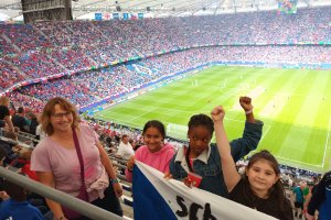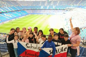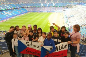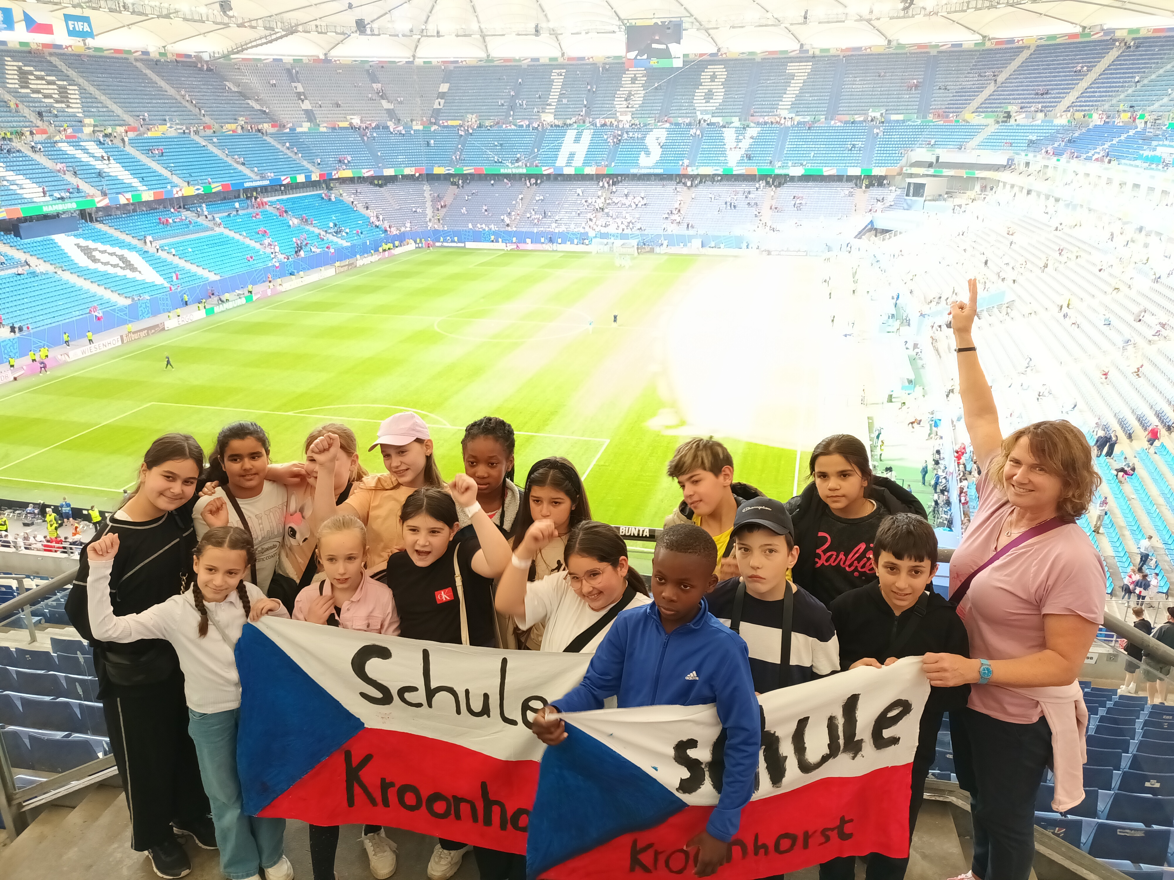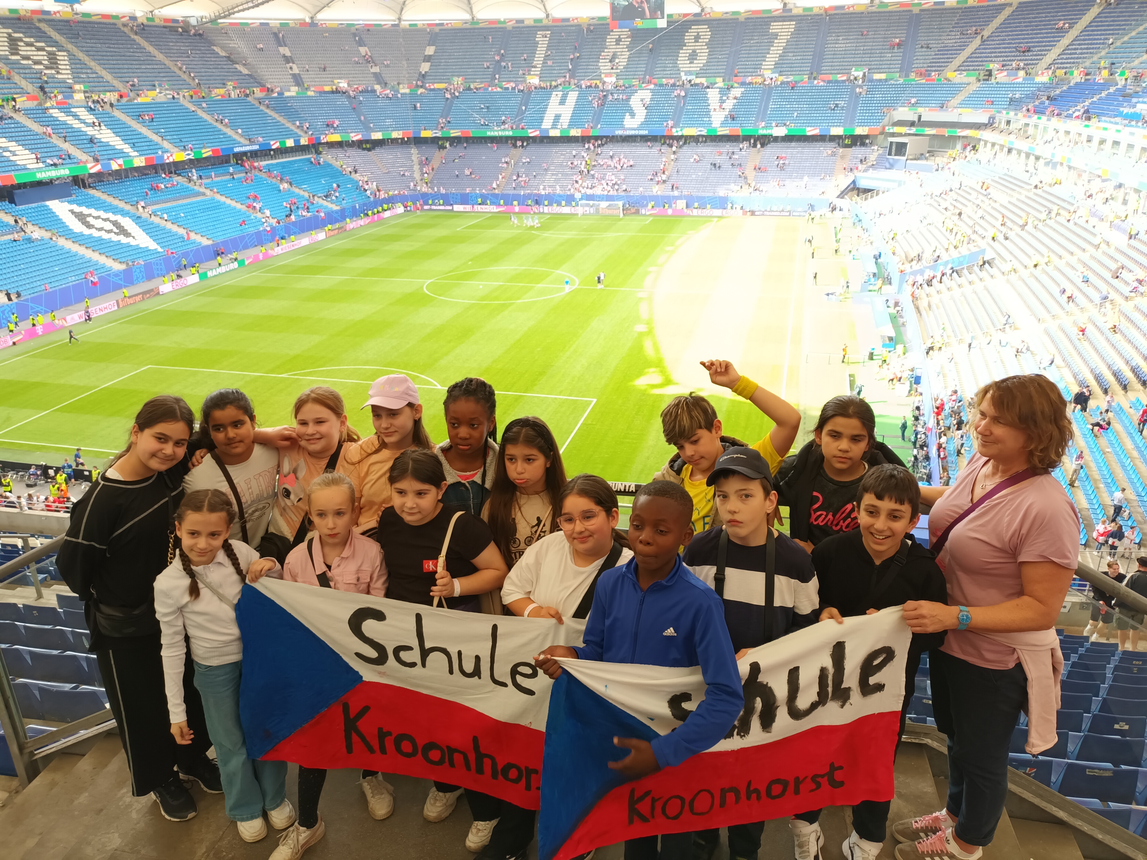 Auf Einladung der UEFA-Stiftung erhielten wir im Vorfeld Freikarten für das Spiel, die wir an die komplette Klasse 4a sowie an fußballbegeisterte Mädchen unserer Schule verteilten. Gemeinsam mit Frau Hegener, Herrn Rennhack und Herrn Röseler machte sich unser Fantross mittags auf den Weg vom Osdorfer Born in den Volkspark.
