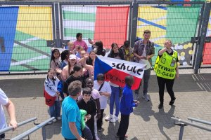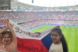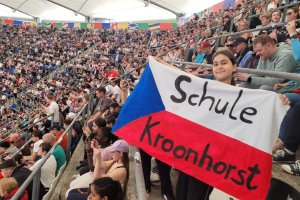 Wir marschieren gemeinsam mit den zahlreichen Anhängern zum Stadion, nehmen oberhalb des tschechischen Fanblocks unsere Plätze mit bester Sicht auf das Spielfeld ein, platzieren unsere selbgestalteten Fahnen und beobachten gespannt das Zeremoniell samt Nationalhymnen vor dem Spiel.