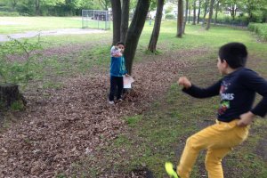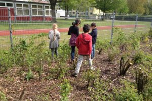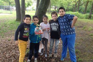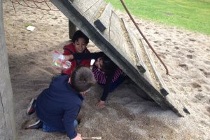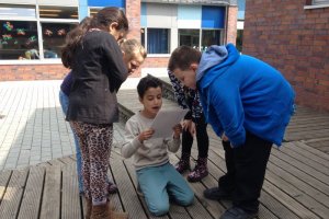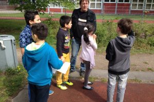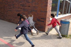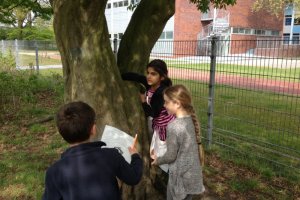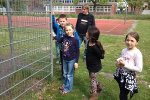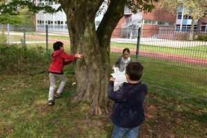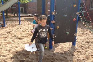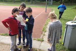 Dann führte uns der erste Brief zum neuen Spielgerät. Dort fanden wir einen zweiten Umschlag. Mit Hilfe des zweiten Briefes kamen wir an der Turnhalle an. Dort befand sich ein weiterer Hinweis. Nur die Gruppen, die sich mit den Himmelsrichtungen gut auskannten, fanden dann am Basketballplatz auch noch den vierten und letzten Brief. War hier der S C H A T Z ? Irgendwo in der Nähe musste er vergraben sein. Nochmal genau lesen. Was stand noch im letzten Brief? Erstmal zum östlichen Basketballkorb, dann 16 Meter nach Süden, 25 Meter nach Westen und nochmal 10 Meter nach Süden. Hurra! Der Schatz war gefunden.