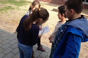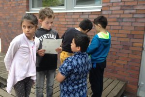 Start war unser Unterichtsgebäude. Im Abstand von 10 Minuten bekam jede Gruppe von Herrn Rennhack eine Schatzkarte und einen geheimnisvollen Umschlag. Ganz aufgeregt öffneten wir den Umschlag und jeder von uns durfte einen Satz vorlesen. Viele Fragen zu den Himmelsrichtungen mussten erstmal beantwortet werden.