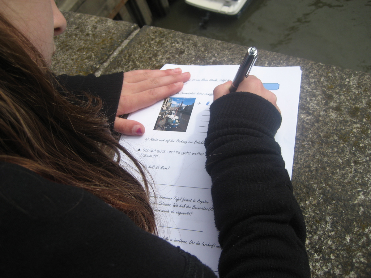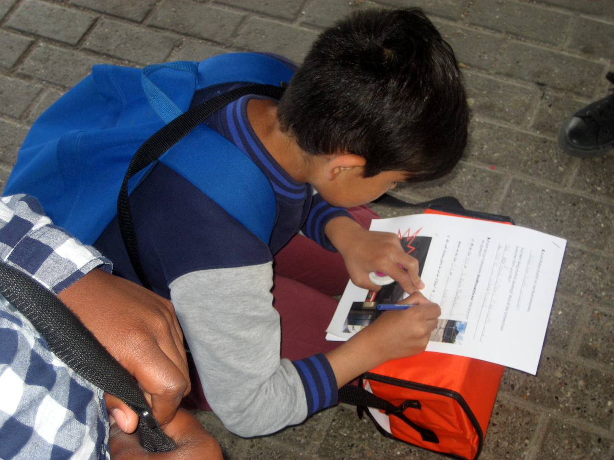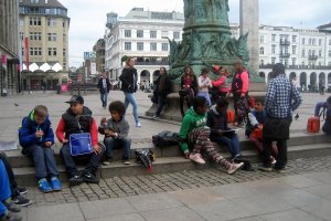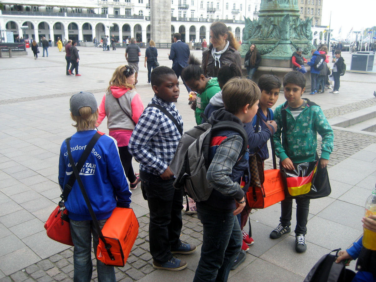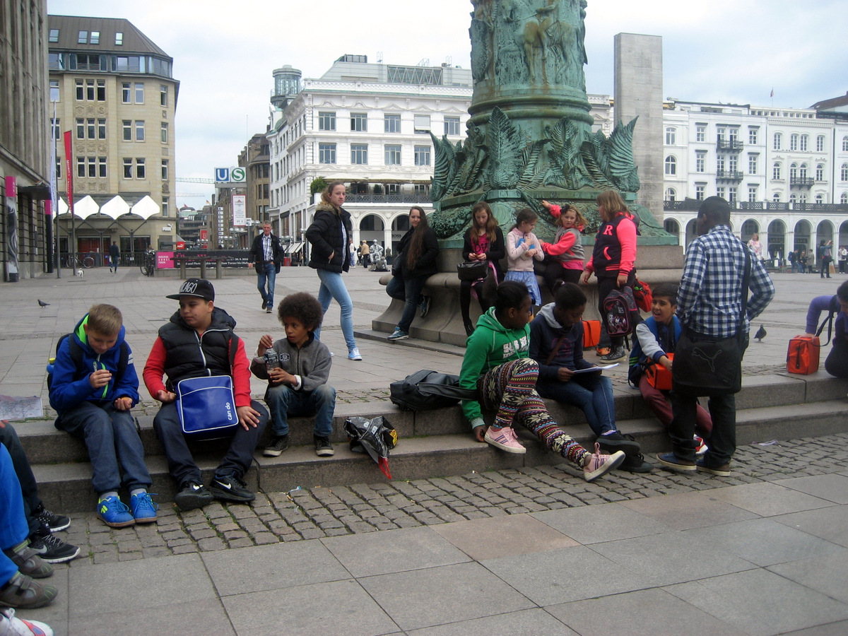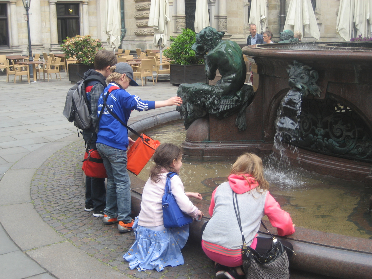 Von dort schwirrten wir in 4 Gruppen mit jeweils 5 Kindern und einem Erwachsenen im Abstand von 10 Minuten aus und versuchten in den nächsten 2 Stunden, unsere Rallye-Bögen mit den unterschiedlichsten Aufgaben und Fragen zu Hamburger Menschen, Figuren, Gebäuden und Gewässern mit möglichst richtigen Antworten und Infos auszufüllen.