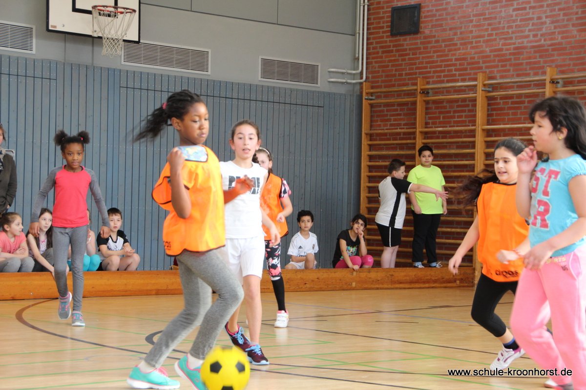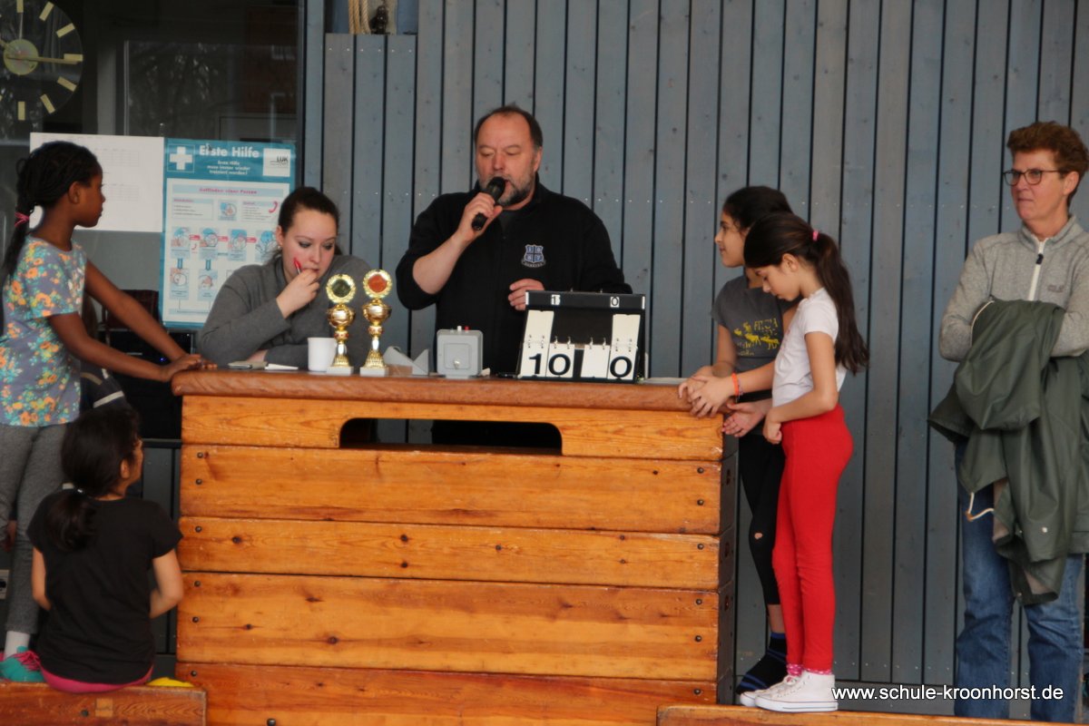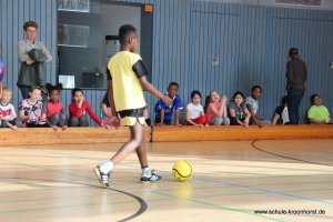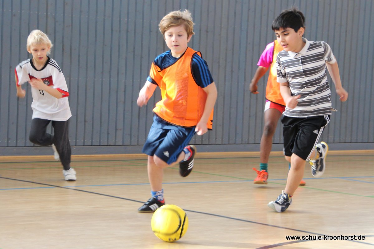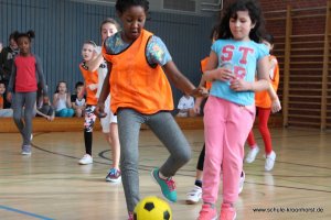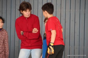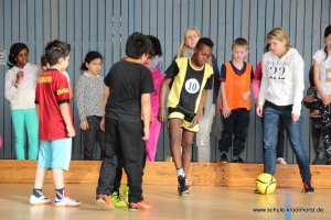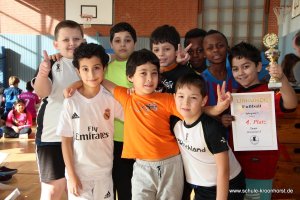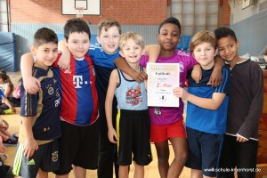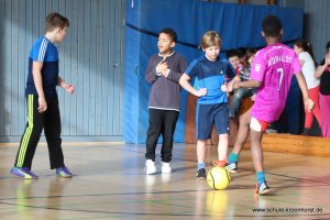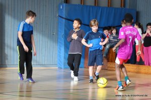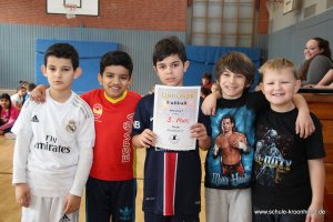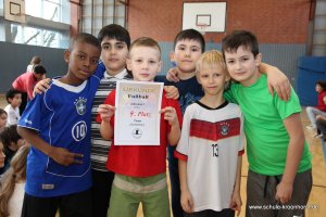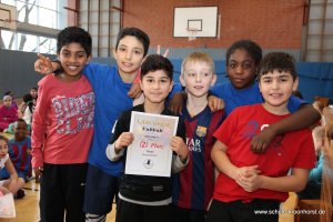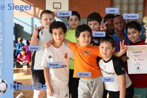Aber was wären die Sporttage ohne Fußball. Die 3. Klassen spielten in einem spannenden und fairen Turnier den Kroonhorster Fußballmeister aus. Bei den Jungen gewann das Team "Die gruseligen 8" aus der Klasse 3a. Die jungen Kicker überzeugten in allen Spielen mit Spielwitz und Torgefährlichkeit. Sieger bei den Mädchen wurden die Fußballcracks der Klasse 3b. Bei der Pokalübergabe durch den Schulleiter Herr Ernst war die Freude besonders groß.