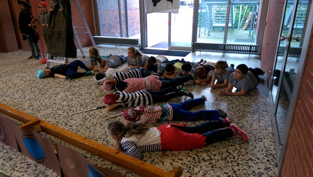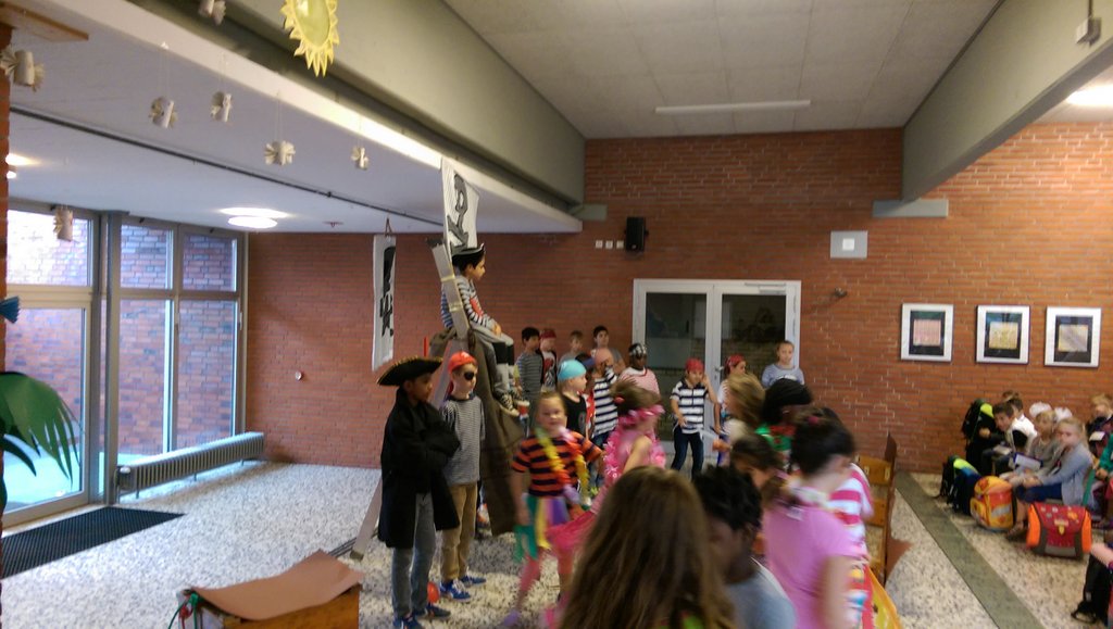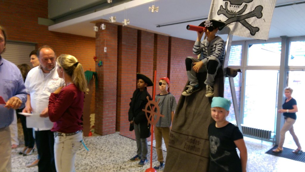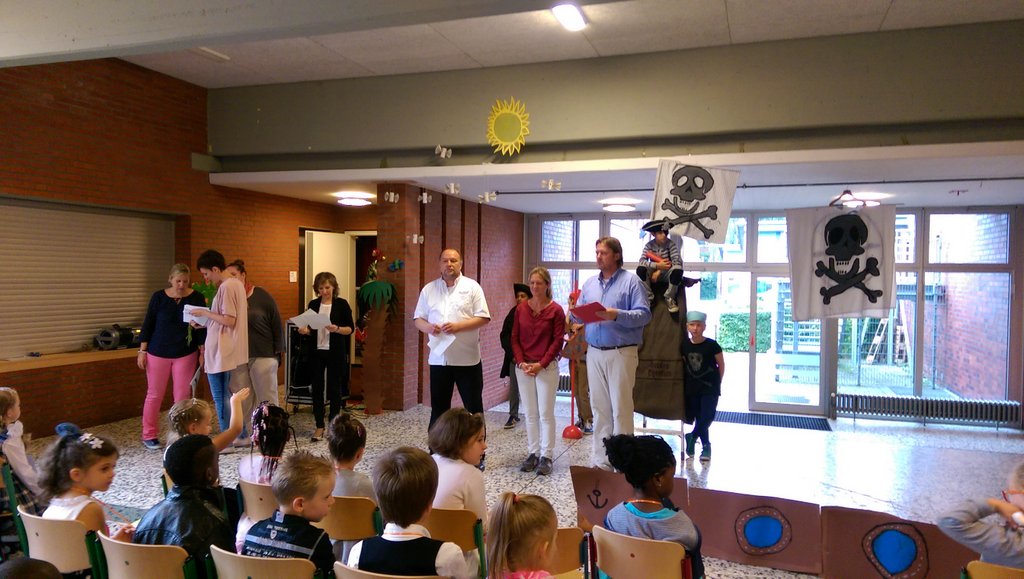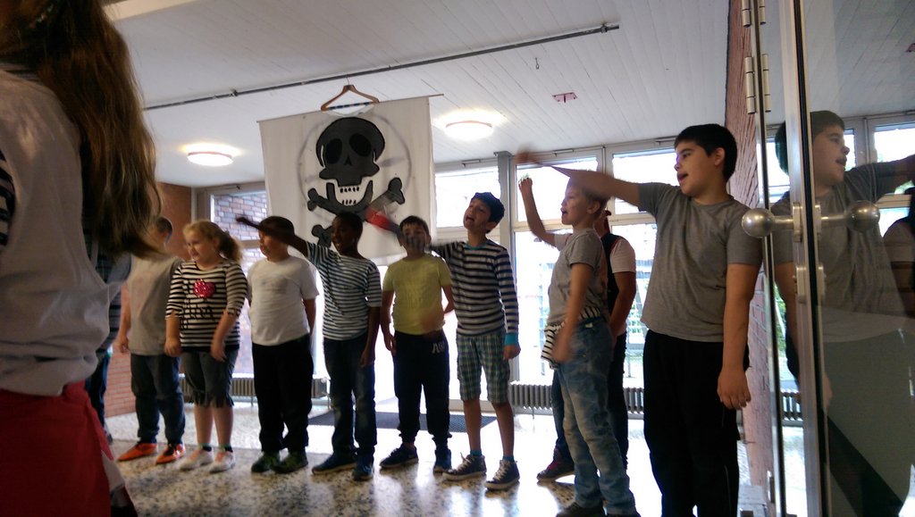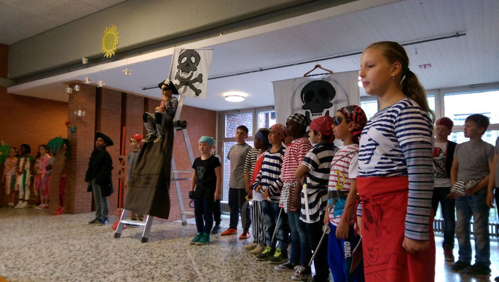 Am 1. September wurden die neuen Erstklässler und Vorschüler am Kroonhorst eingeschult. Alle Kinder waren sehr gespannt und wussten nicht, was sie erwarten würde. Mit ihren neuen Schulranzen und Schultüten saßen sie in der ersten Reihe und warteten, dass es endlich losgeht! Nach der Begrüßung durch Herrn Ernst führten wir Viertklässler unser Musical, „Die Buchstabenpiraten“ auf. Die Kinder haben gelacht und sich amüsiert. Auch die Eltern waren begeistert. Wir haben viel Applaus bekommen.