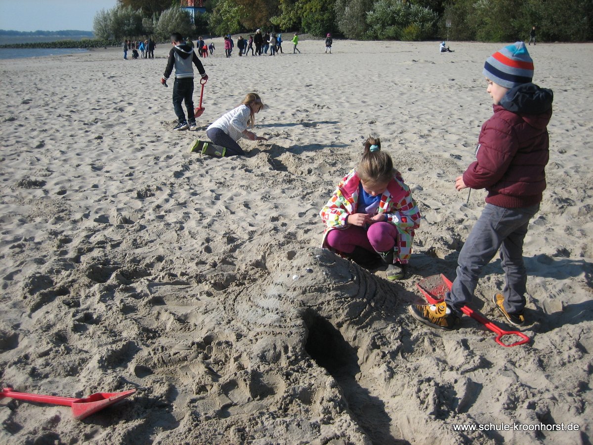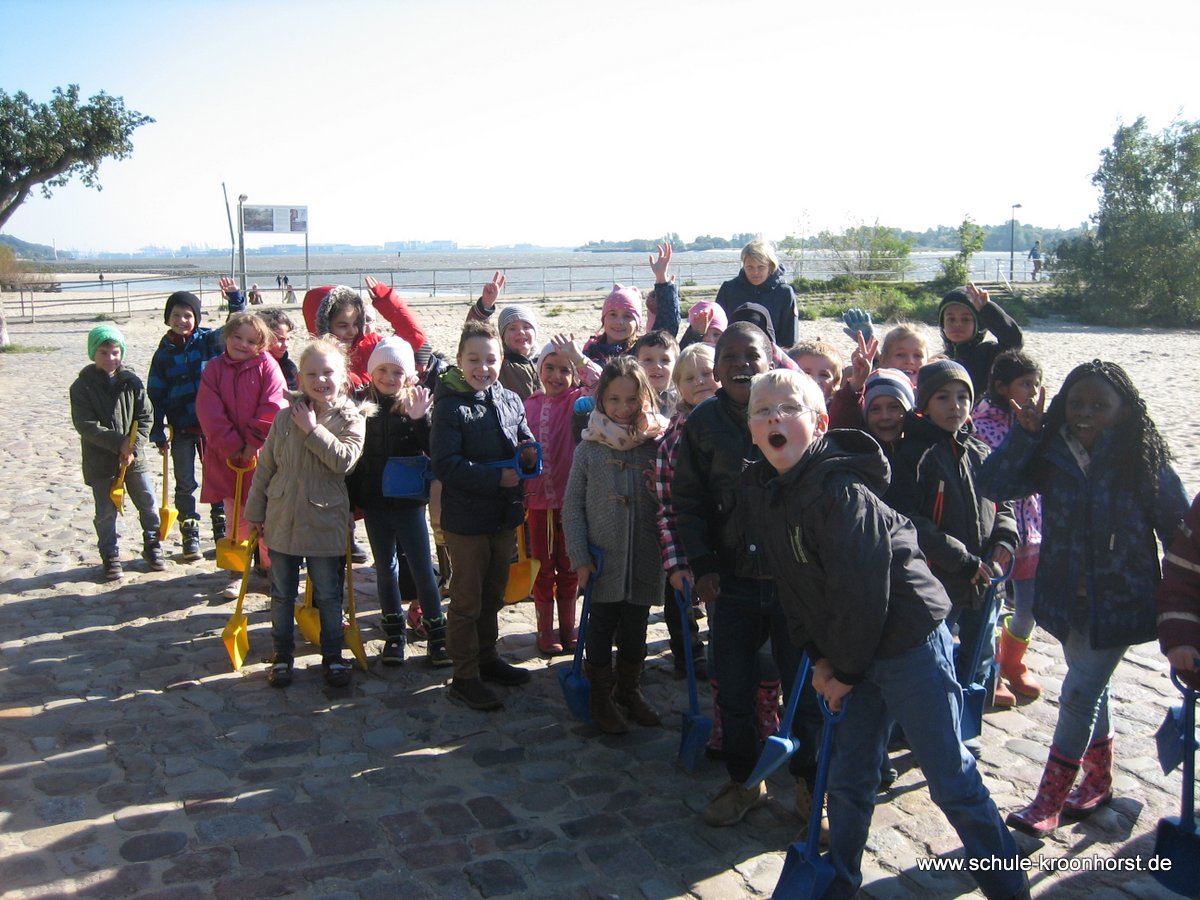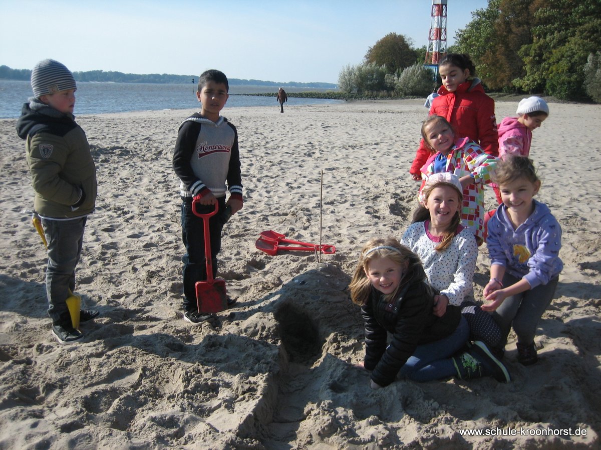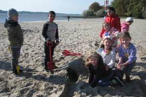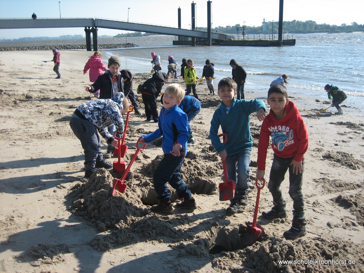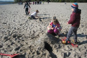 Trotz der plötzlich einsetzenden Kälte haben wir viel Spaß, schließlich gibt es Winterjacken, Mützen, Handschuhe und vor allem: Gummistiefel!!! Denn die sind für das Buddeln am Elbstrand unbedingt nötig!