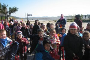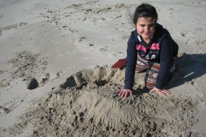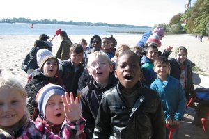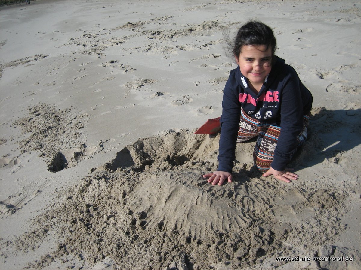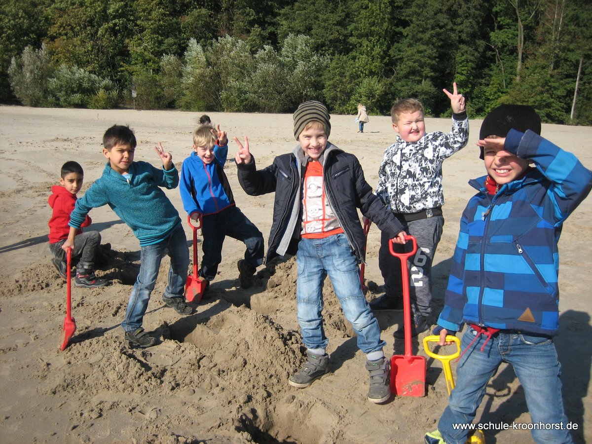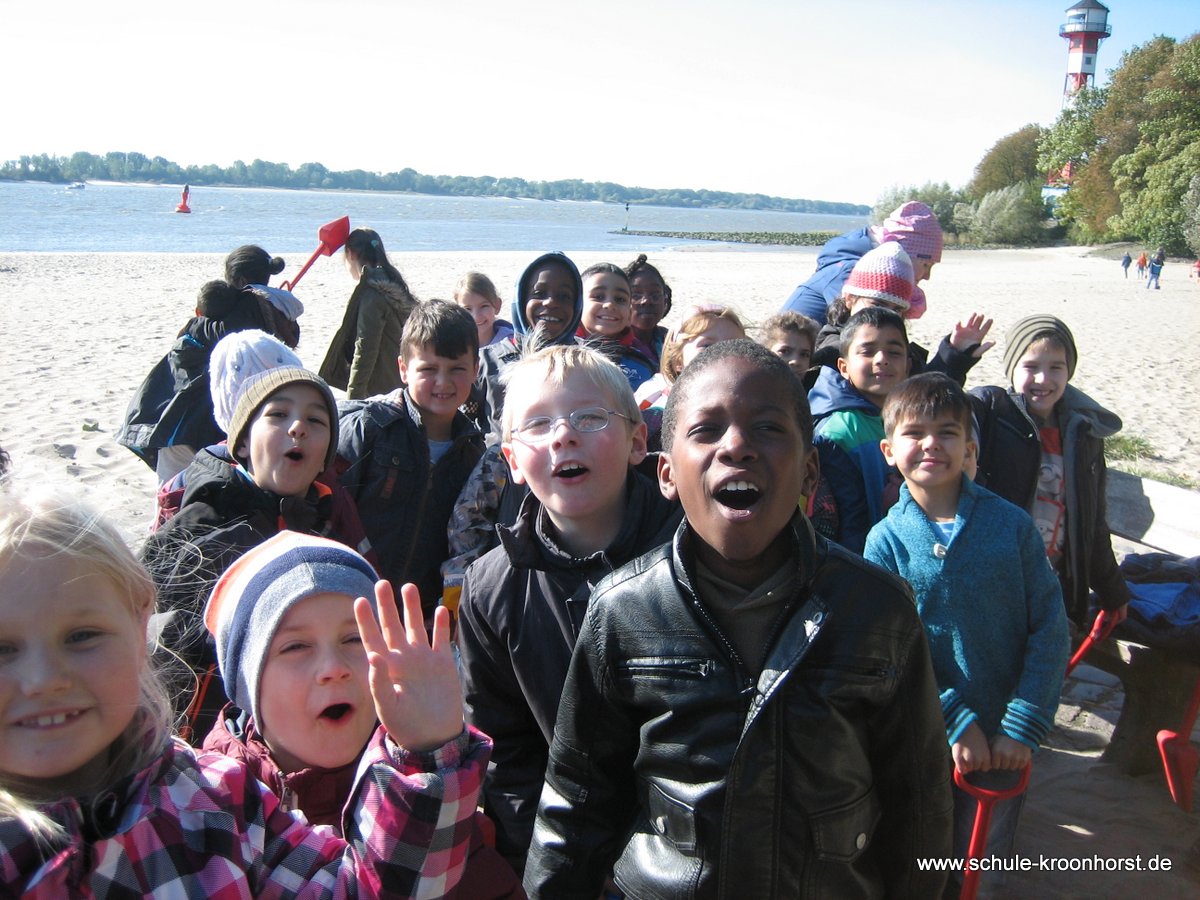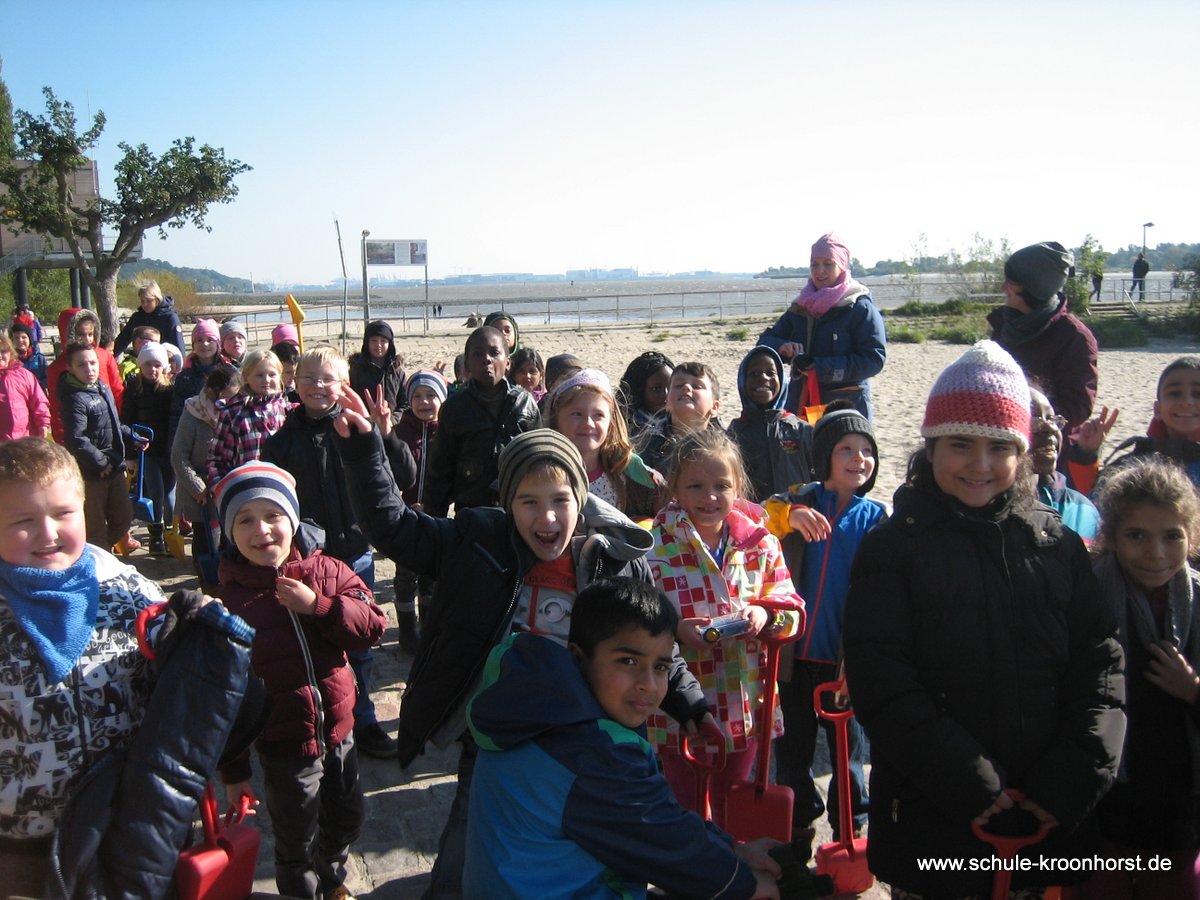 Trotz der plötzlich einsetzenden Kälte haben wir viel Spaß, schließlich gibt es Winterjacken, Mützen, Handschuhe und vor allem: Gummistiefel!!! Denn die sind für das Buddeln am Elbstrand unbedingt nötig!