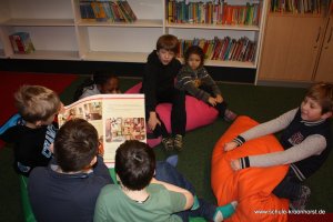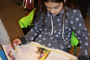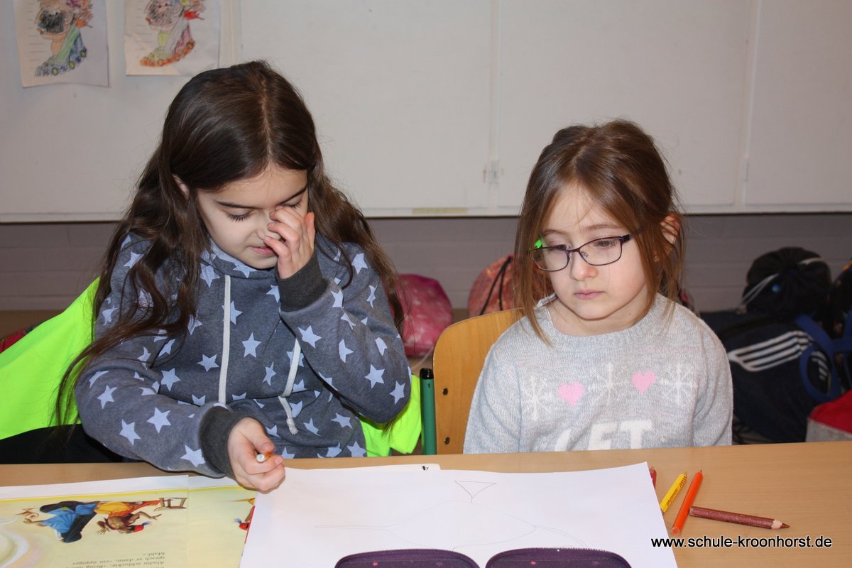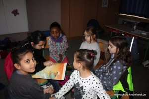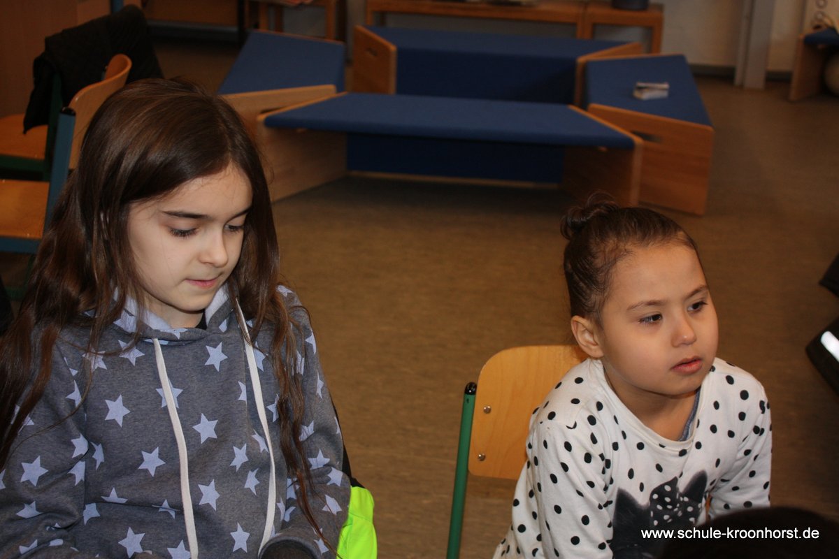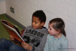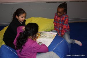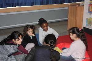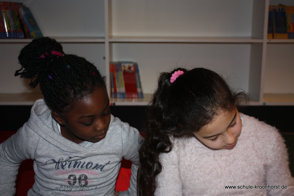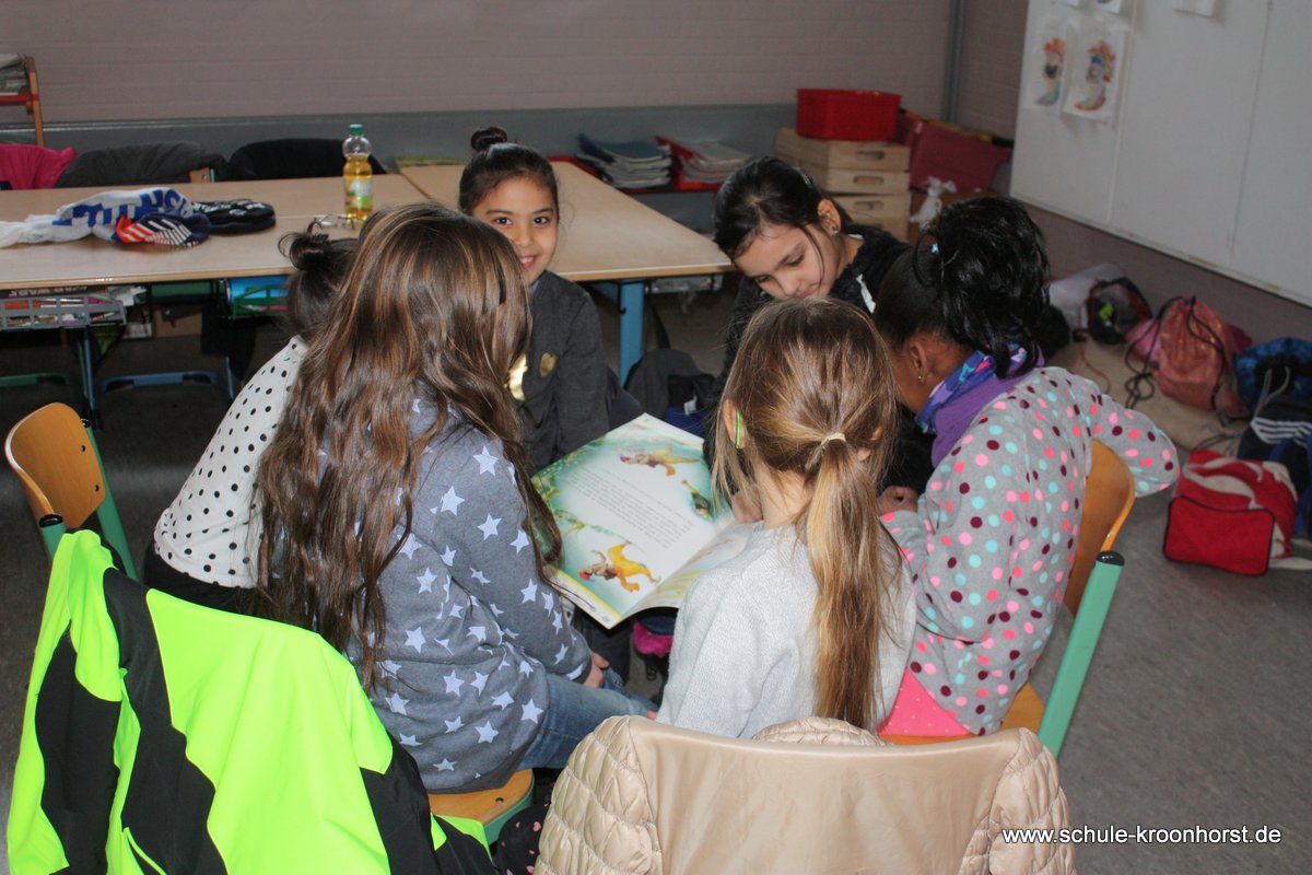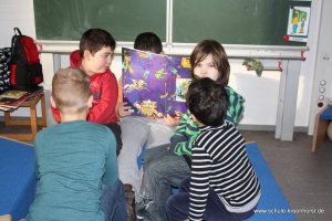 Die Vorschüler der Elefantenklasse besuchen ihre Paten in der 3b. Alle sind schon vorher sehr aufgeregt. Die „Elefanten“, weil sie sich auf ihre Paten freuen und die „Großen“ , weil sie Märchen vorlesen wollen und schon sehr lange dafür geübt haben.