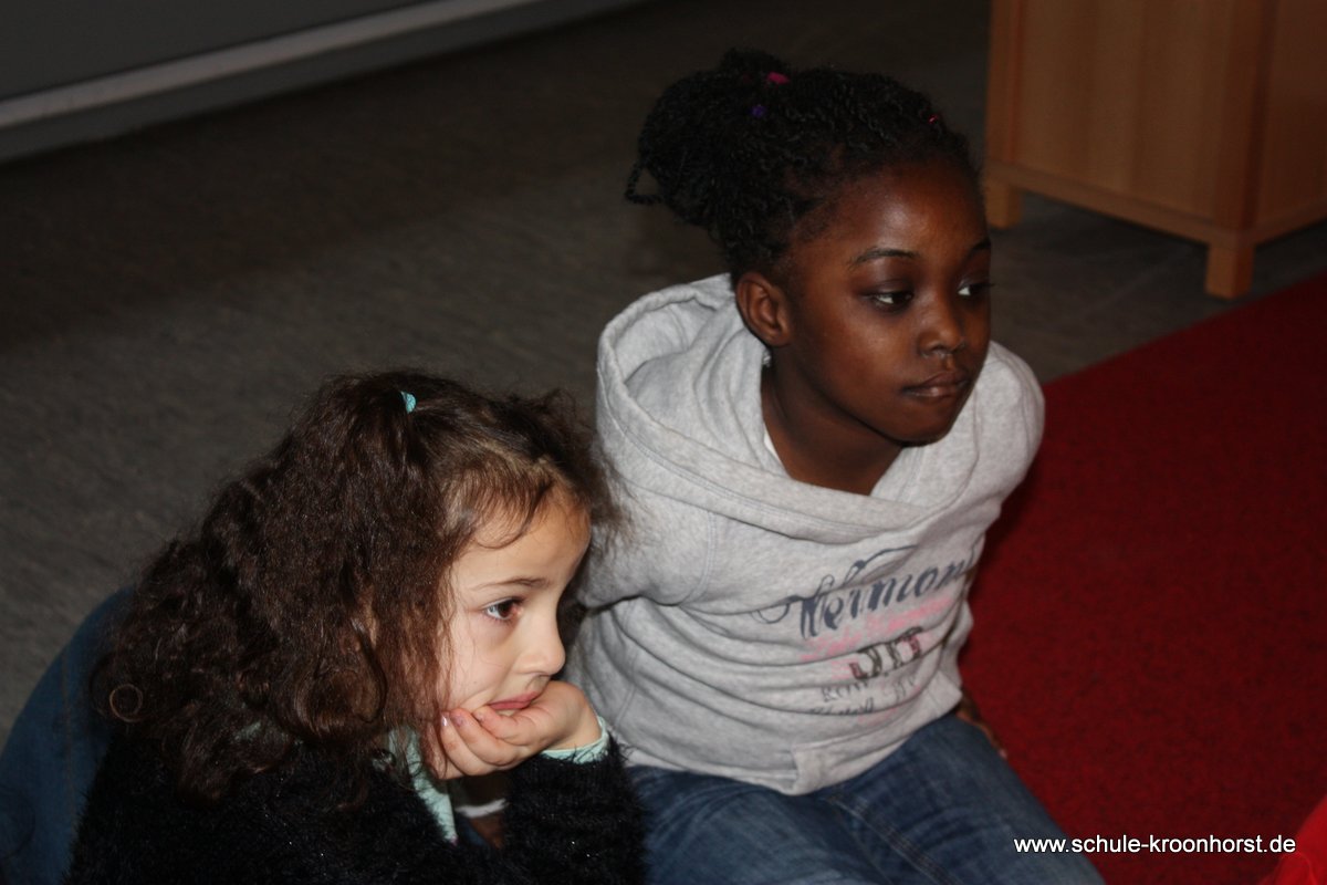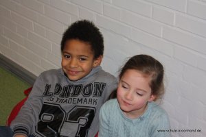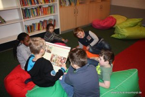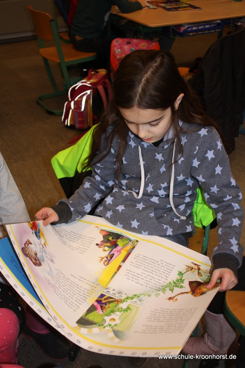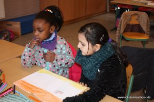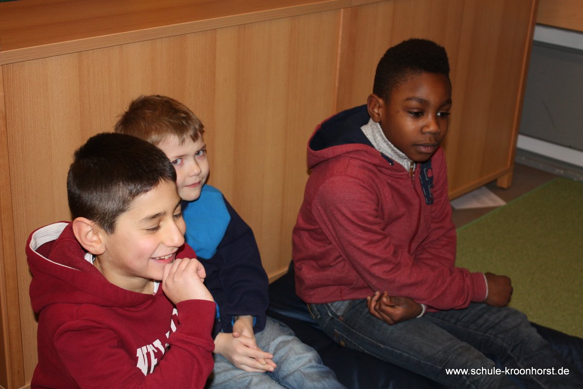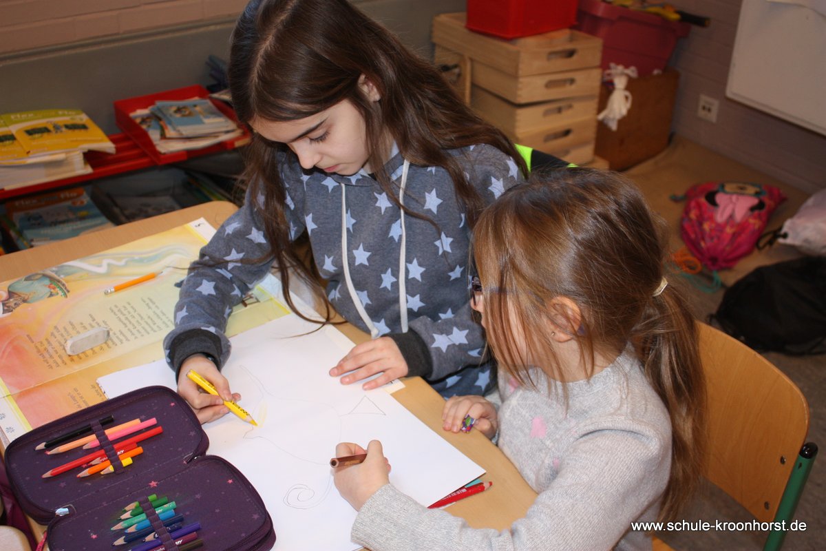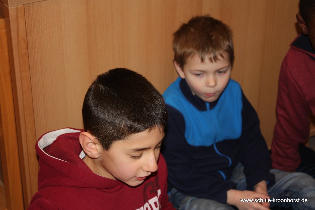 Die Vorschüler der Elefantenklasse besuchen ihre Paten in der 3b. Alle sind schon vorher sehr aufgeregt. Die „Elefanten“, weil sie sich auf ihre Paten freuen und die „Großen“ , weil sie Märchen vorlesen wollen und schon sehr lange dafür geübt haben.