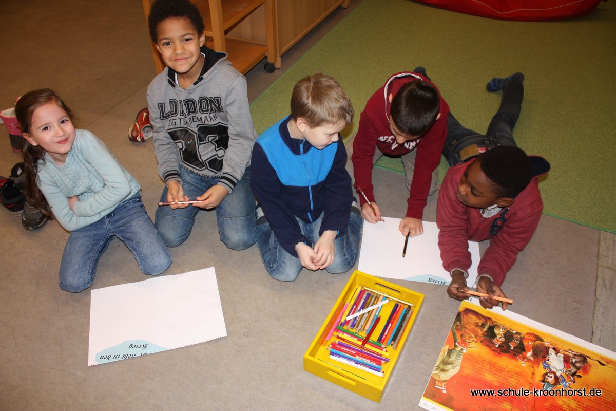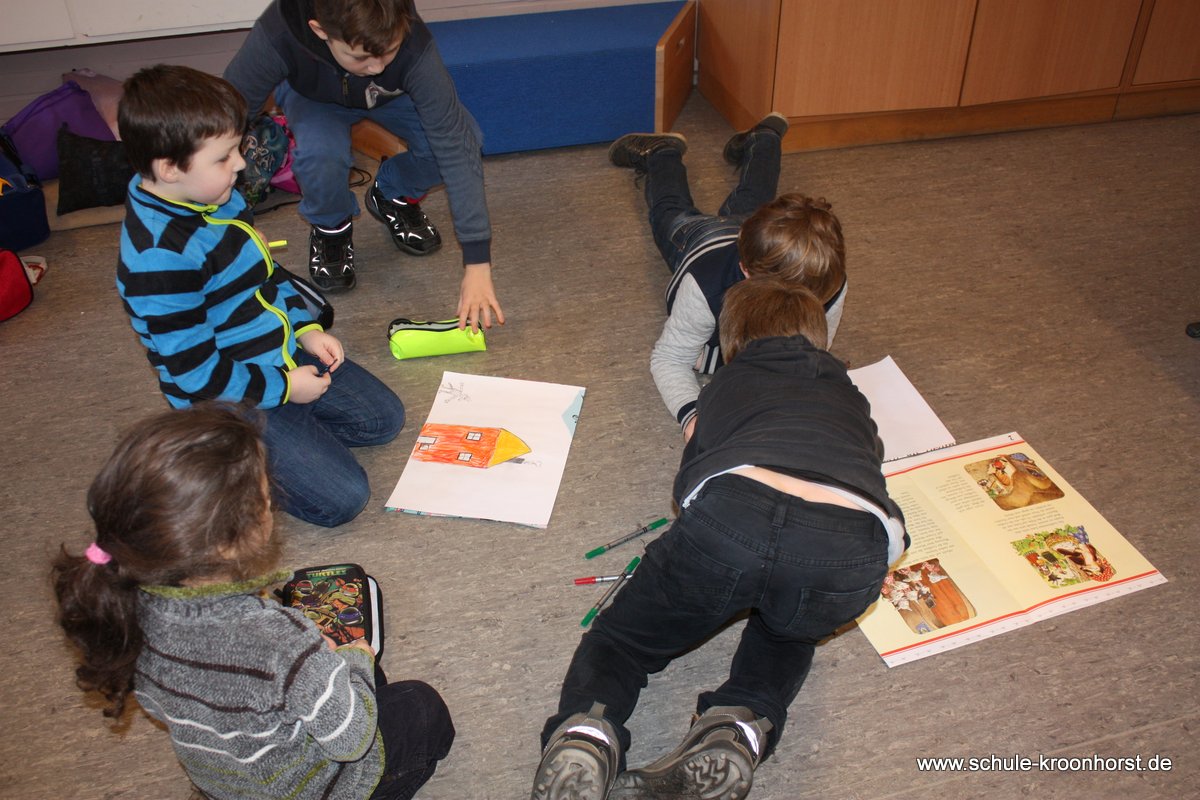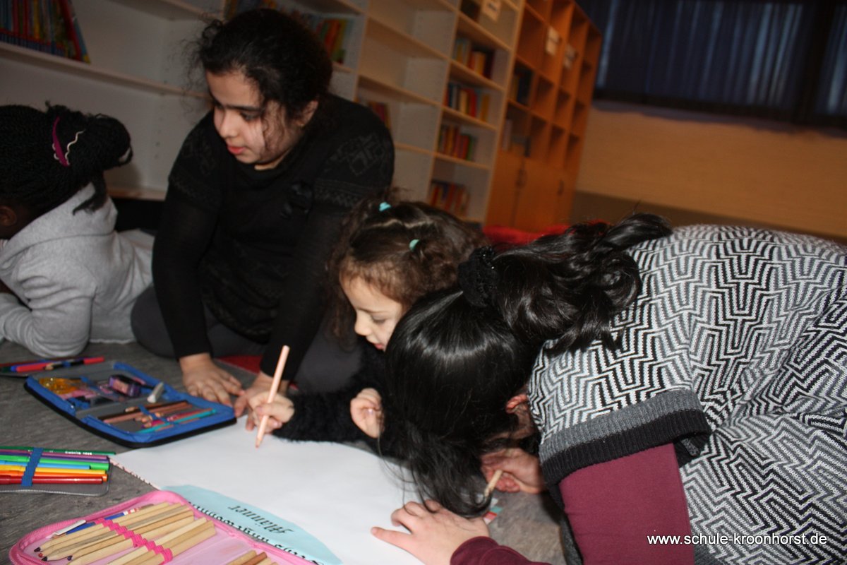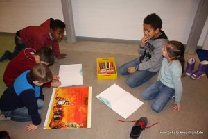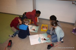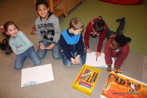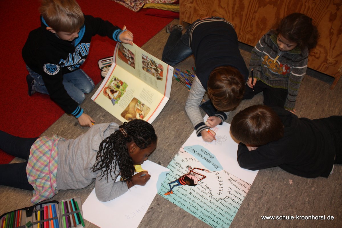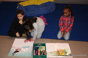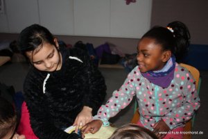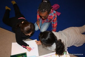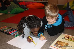 Nach der ersten wuseligen Begrüßung verteilen sich die Kinder in kleinen Gruppen im ganzen Gebäude und es erklingen die Märchen von Aladin, Dornröschen, der Hexe im Turm …. und noch einige mehr. Im Anschluss werden die Stifte ausgepackt und ein Bild zum Märchen entsteht.