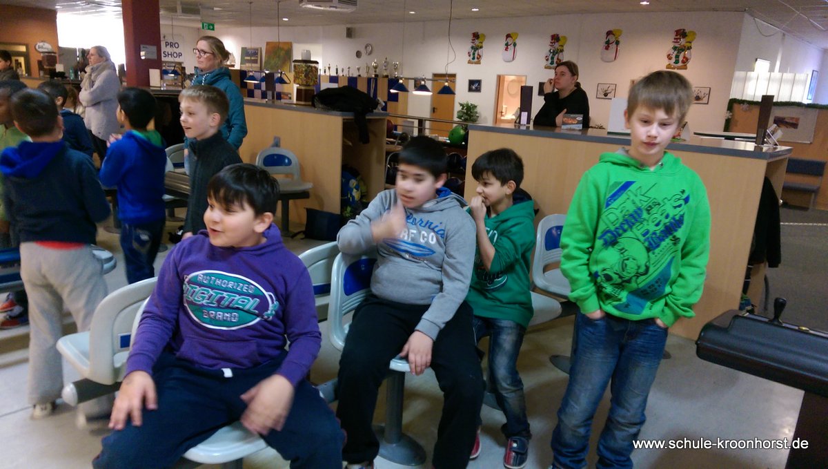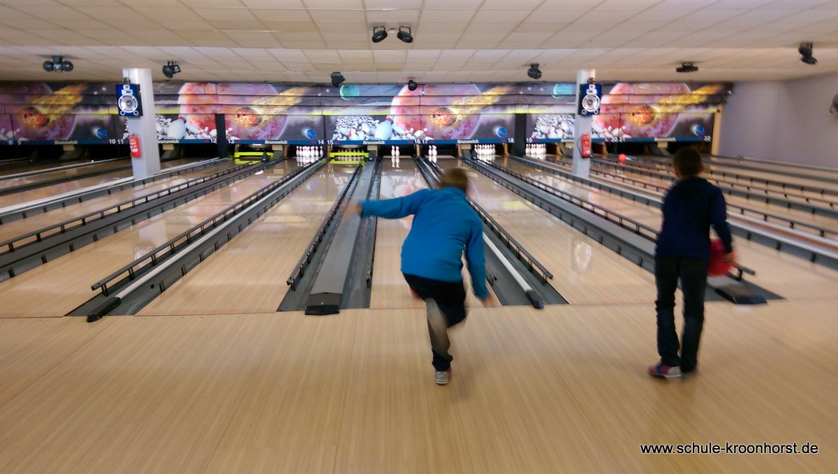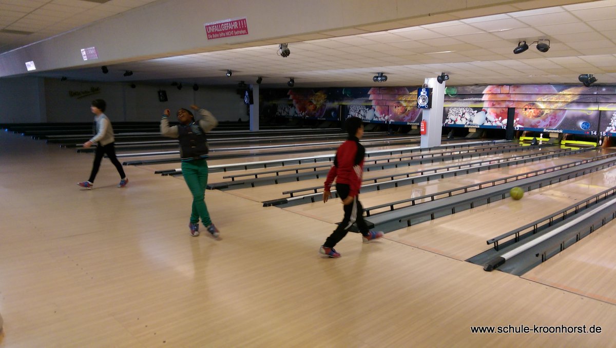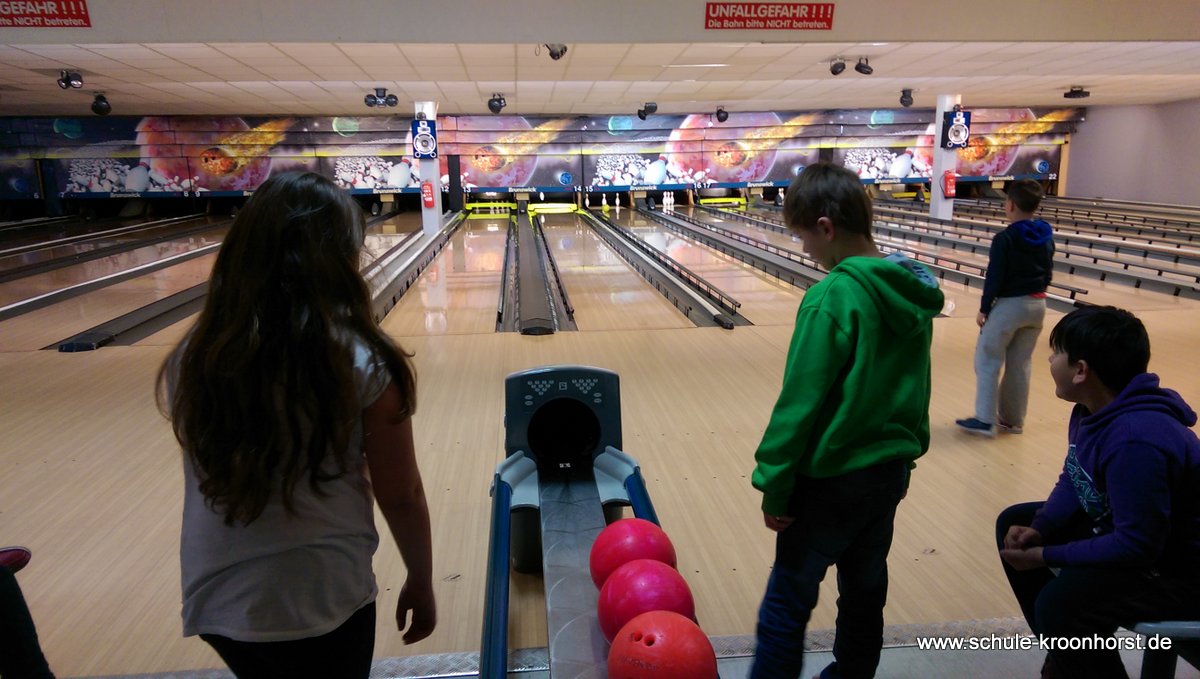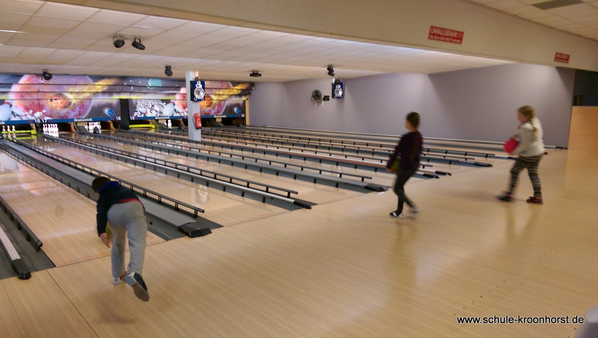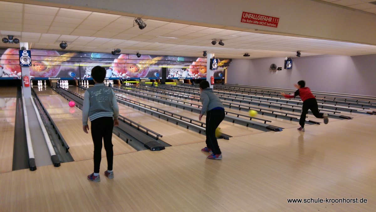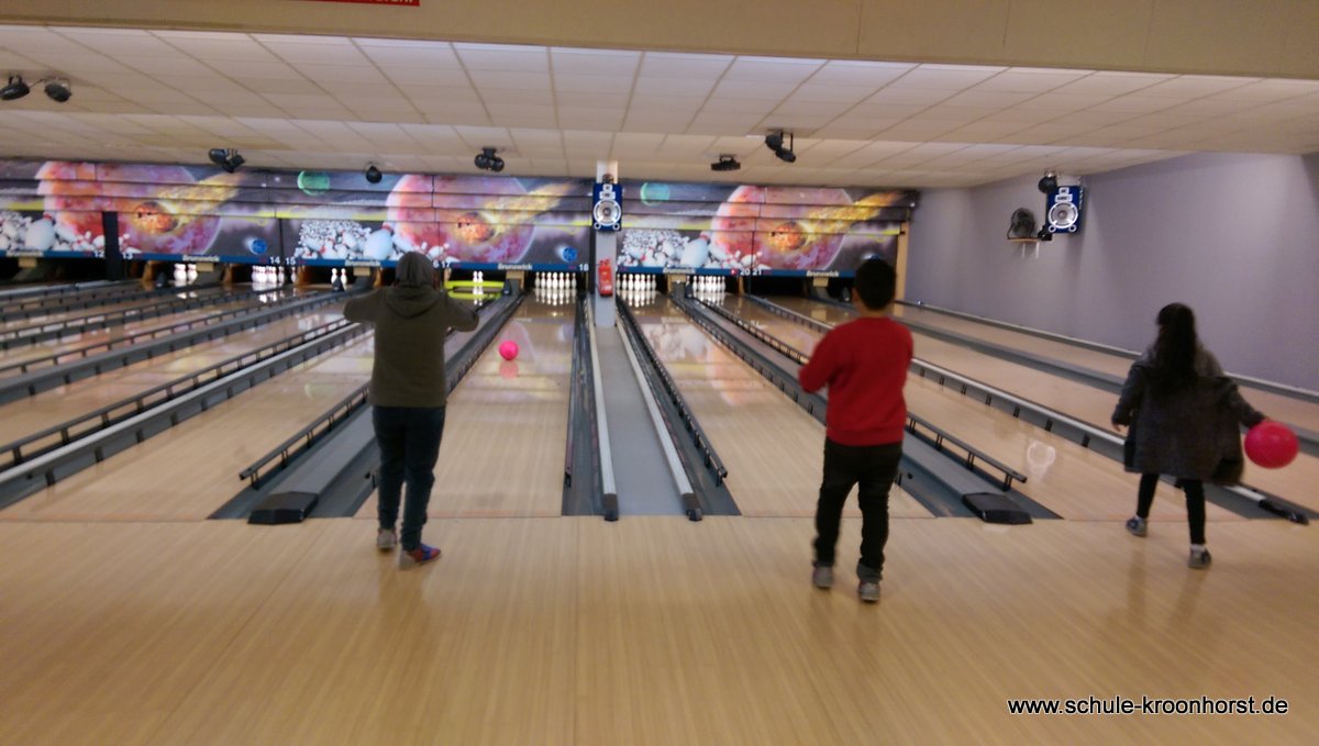 Am 17. Februar machten wir uns gemeinsam mit der 4b auf zur Bowlinghalle in Osdorf. Da die Bowlingbahn direkt gegenüber der Schule Barlsheide liegt, gingen wir bei strahlendem Sonnenschein und klirrender Kälte zu Fuß dorthin.