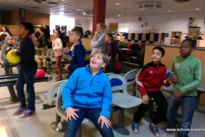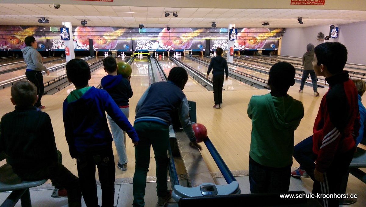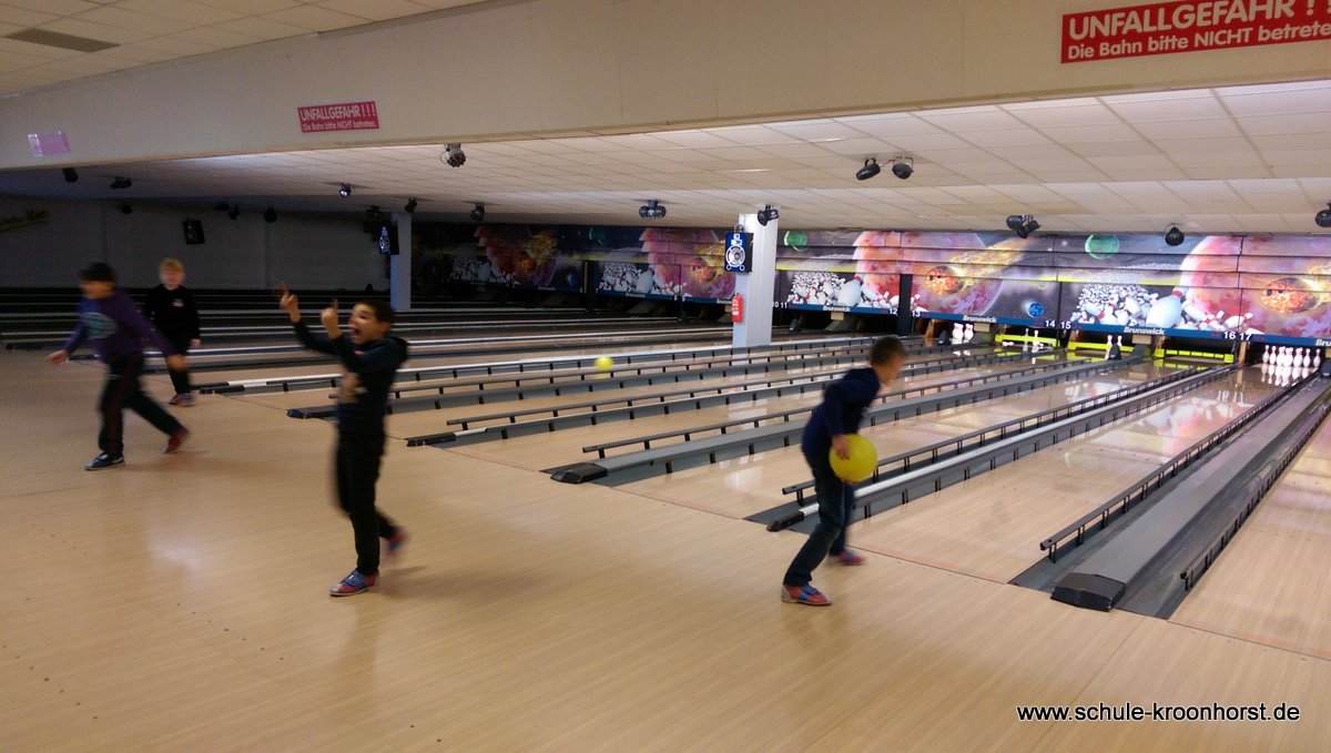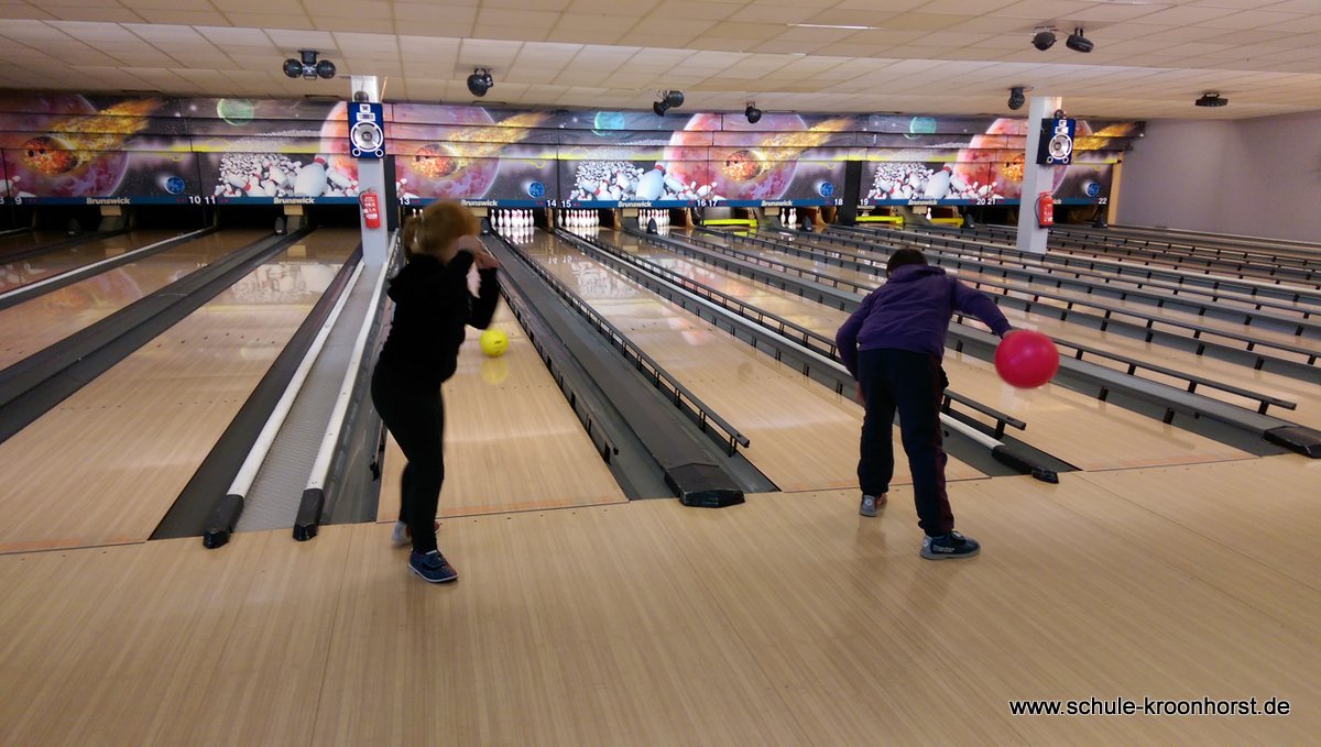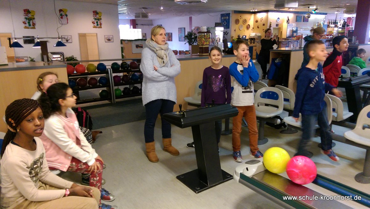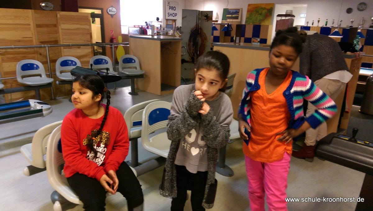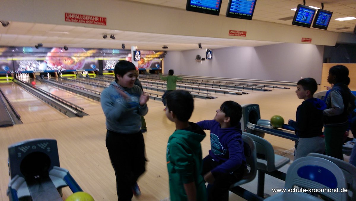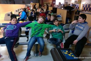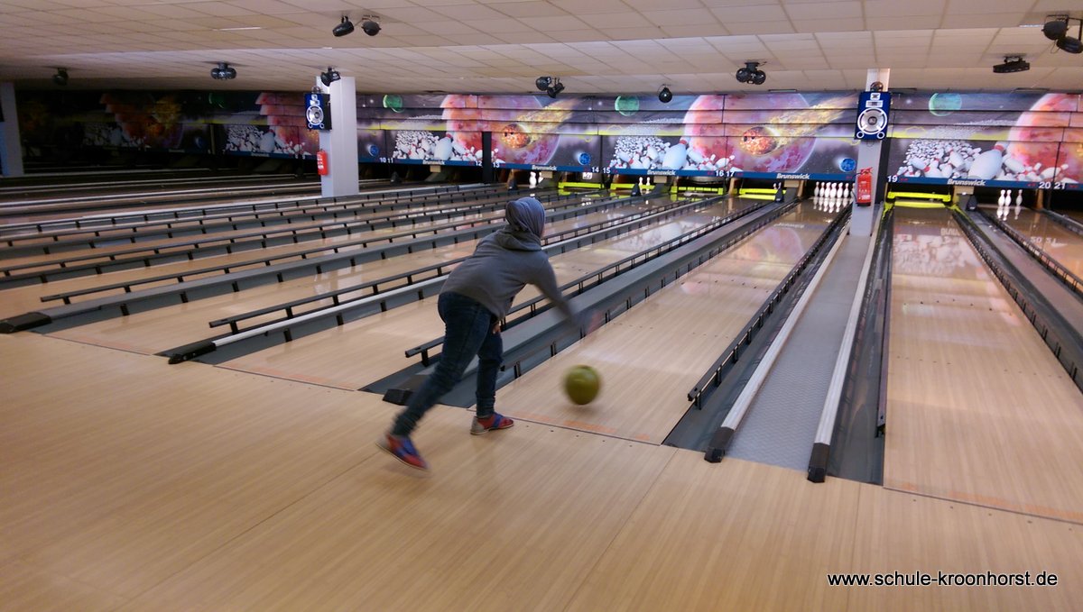 Am 17. Februar machten wir uns gemeinsam mit der 4b auf zur Bowlinghalle in Osdorf. Da die Bowlingbahn direkt gegenüber der Schule Barlsheide liegt, gingen wir bei strahlendem Sonnenschein und klirrender Kälte zu Fuß dorthin.