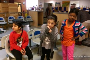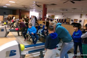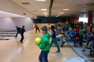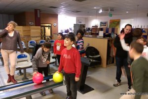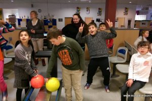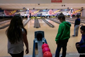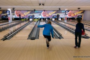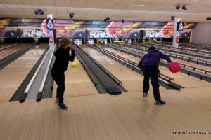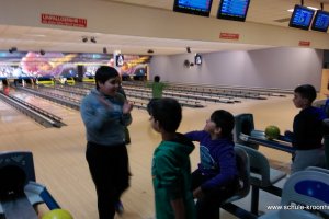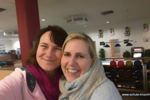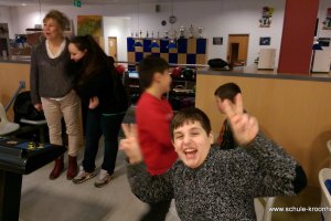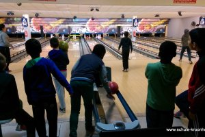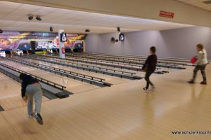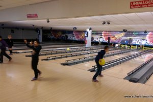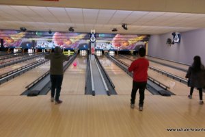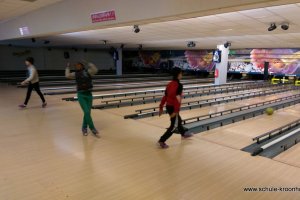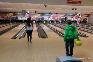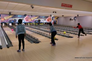 Wir hatten vorher in der Schule bereits Vierergruppen gebildet, in denen wir spielen wollten. Gesagt, getan! Nach einer kurzen Einführung (in den Leise-Fuchs-Bowling-Griff) ging es auch schon mit viel Schwung los! Jeder spielte zwei Runden (außer Viki, die mit Halsschmerzen nach Hause gehen musste…).