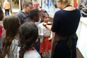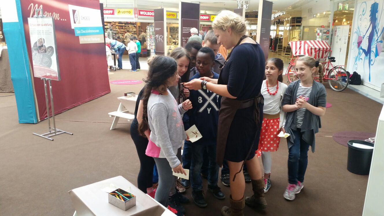Die Kakao-Experten von Hamburgs Schokoladenmuseum machten Station im Eidelstedt-Center und nahmen die kleinen Leckermäulchen der 3a mit auf eine Genuss-Reise durch die süße Welt der Schokolade. Dabei waren alle Sinne gefragt und das Probieren war ausdrücklich erwünscht! Der Weg führte von der Kakaobohne zur feinsten Schokolade. Die Kinder erfuhren, was Wurfbrecher mit der Schokolade zu tun haben. An historischen Originalmaschinen konnten sie hautnah sehen, wie das süße Gold hergestellt wird und dann erstellten sie sogar selbst ihre persönliche Lieblings-Tafel. Das war super lecker.
