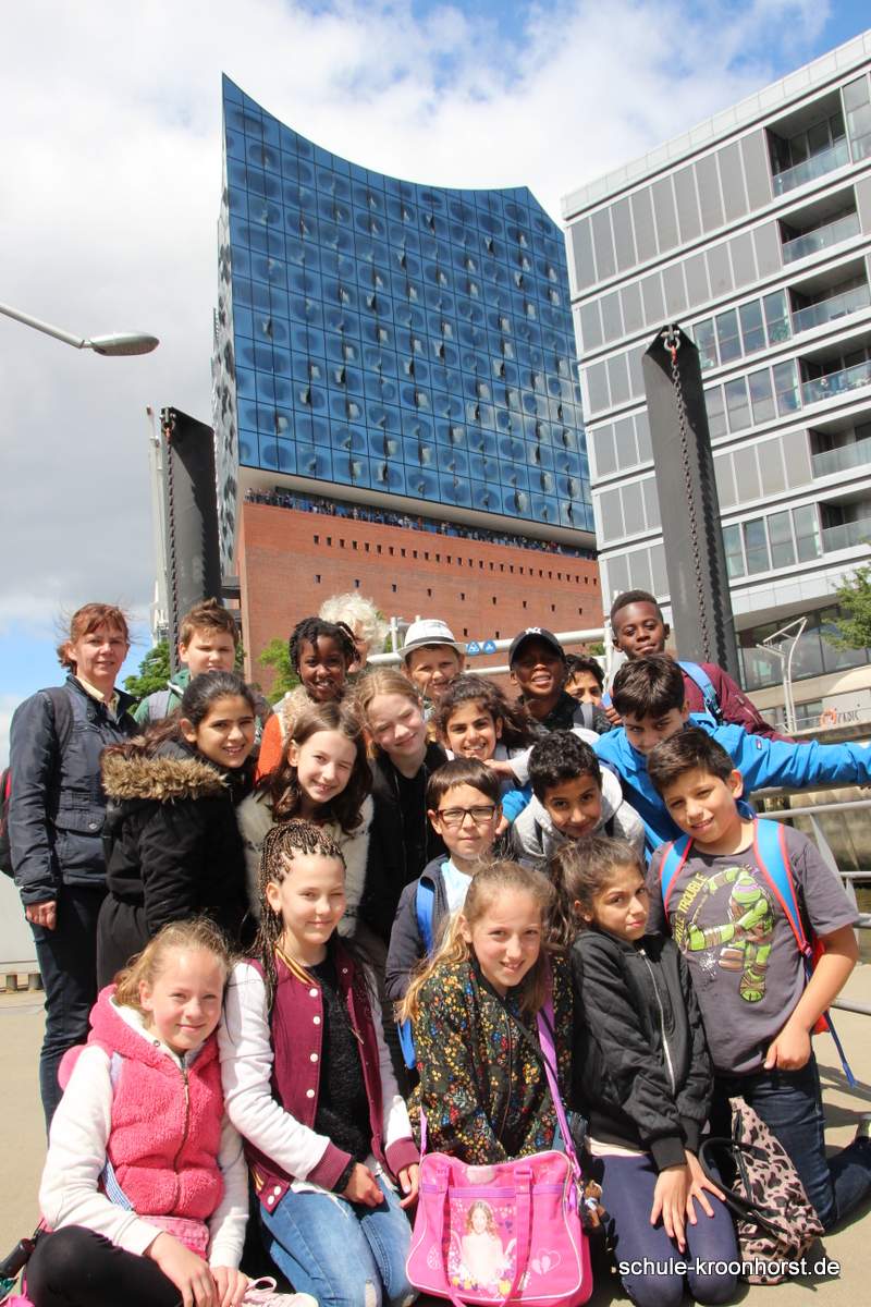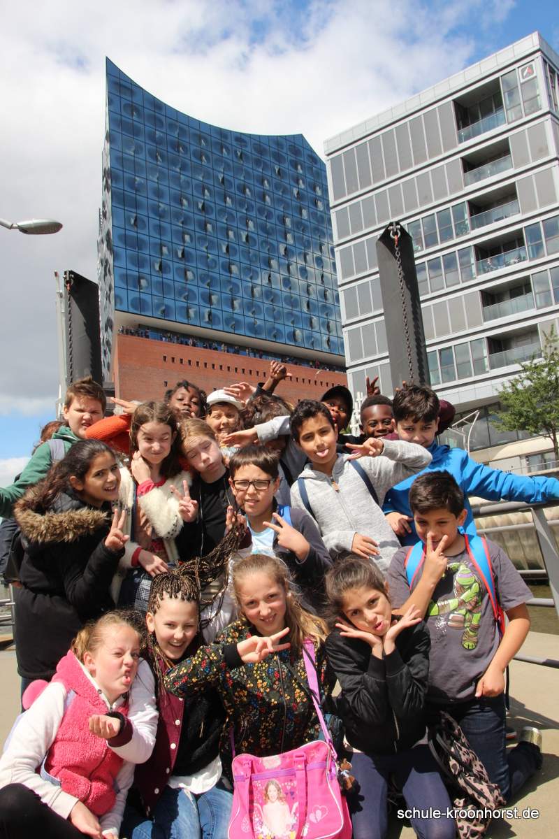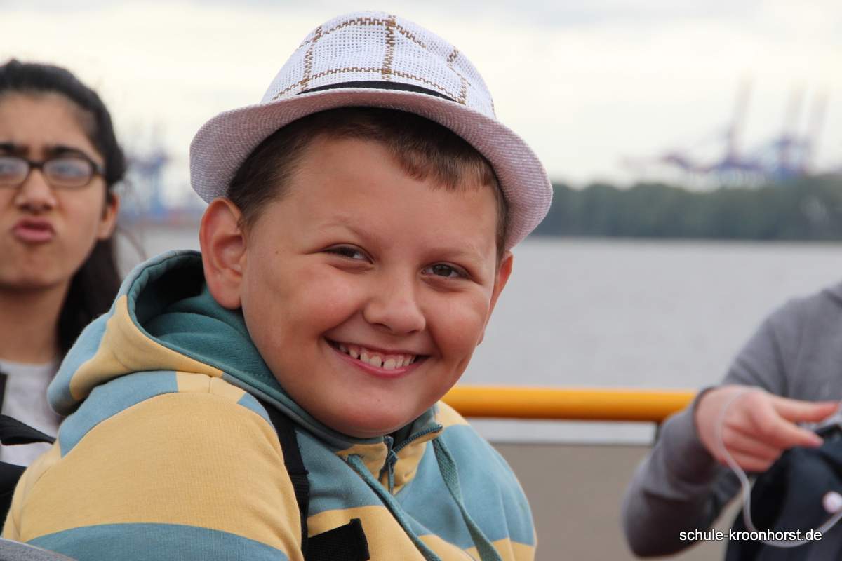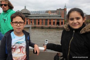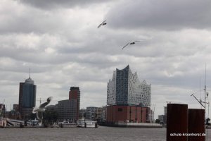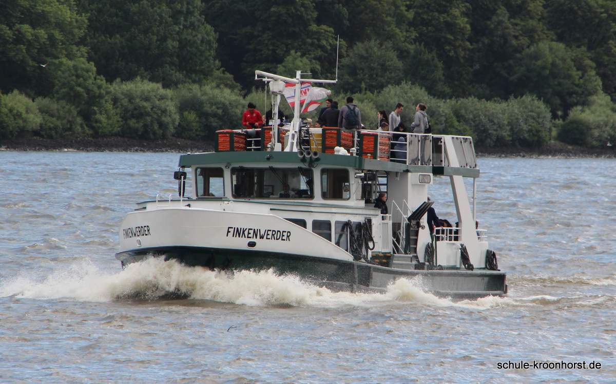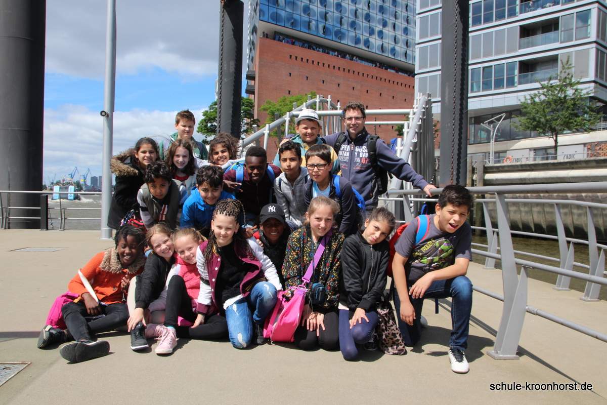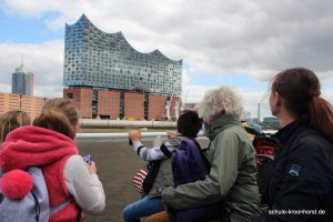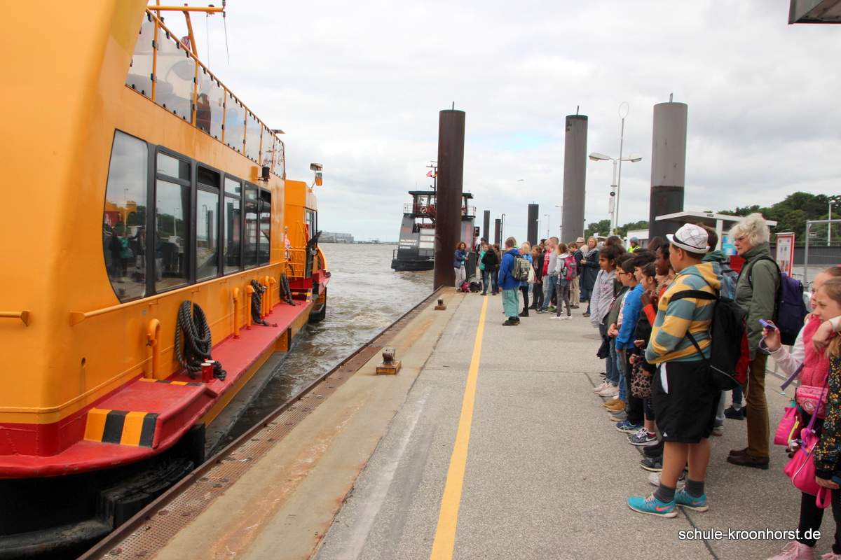 (13.07.2017) Die Klasse 4a erkundet Hamburg mit Bus, Bahn und Schiff. Start ist die Schule Kroonhorst im Osdorfer Born. Mit dem Bus Linie 21 geht's nach Teufelsbrück an die Elbe. Dort steigen wir in die HADAG Fähre 64 nach Finkenwerder. Hier müssen wir raus und weiter geht's mit der HADAG Linie 62 Richtung St. Pauli Landungsbrücken. Wir sehen viel Schiffsverkehr, Trockendocks mit zu reparierenden Schiffen, den Bagger "Alexander von Humboldt", die "Stettin" - einen Eisbrecher und natürlich die Elbphilharmonie. Es ist also viel los auf der Elbe. Das Wetter spielt mit und alle haben gute Laune.