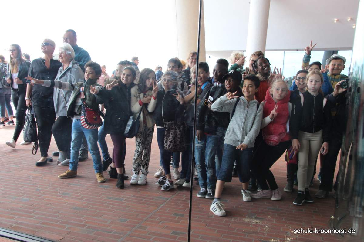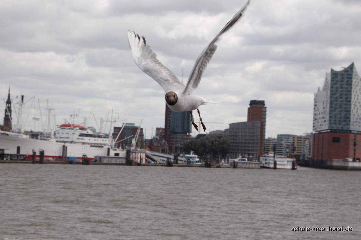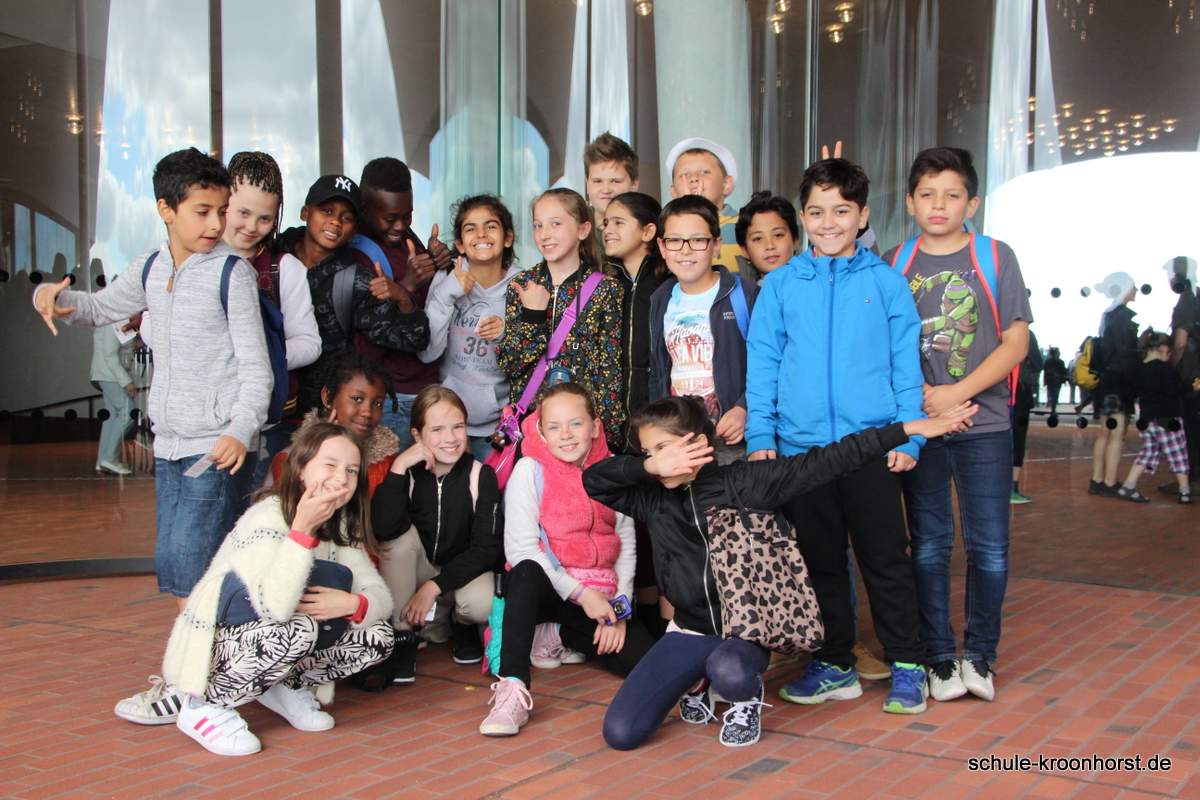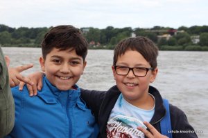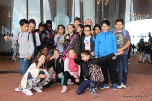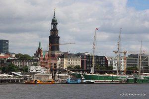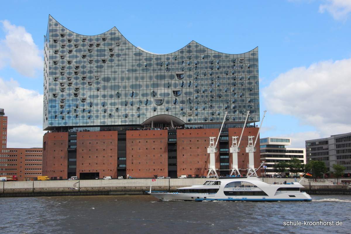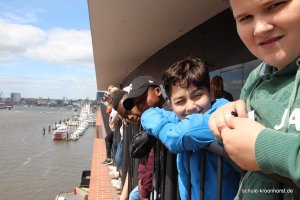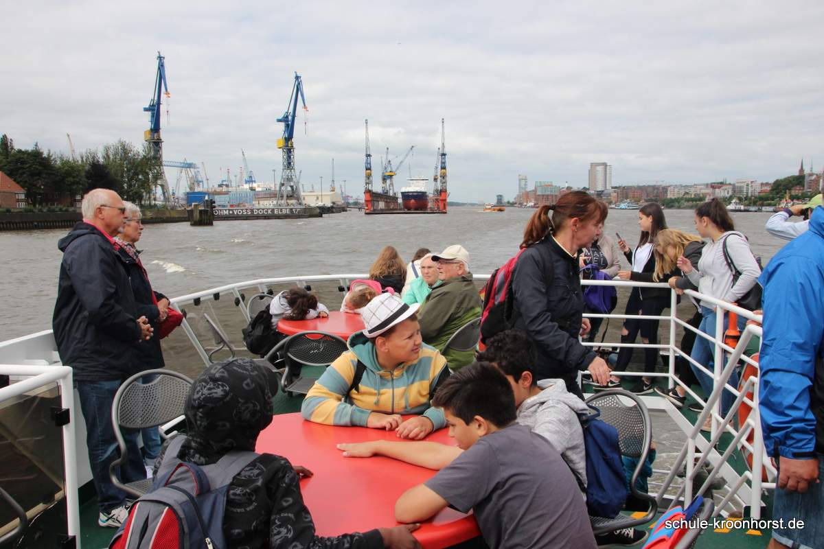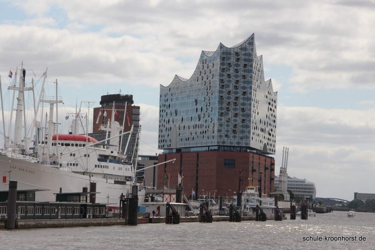 (13.07.2017) Die Klasse 4a erkundet Hamburg mit Bus, Bahn und Schiff. Start ist die Schule Kroonhorst im Osdorfer Born. Mit dem Bus Linie 21 geht's nach Teufelsbrück an die Elbe. Dort steigen wir in die HADAG Fähre 64 nach Finkenwerder. Hier müssen wir raus und weiter geht's mit der HADAG Linie 62 Richtung St. Pauli Landungsbrücken. Wir sehen viel Schiffsverkehr, Trockendocks mit zu reparierenden Schiffen, den Bagger "Alexander von Humboldt", die "Stettin" - einen Eisbrecher und natürlich die Elbphilharmonie. Es ist also viel los auf der Elbe. Das Wetter spielt mit und alle haben gute Laune.