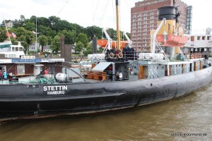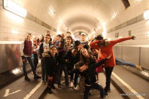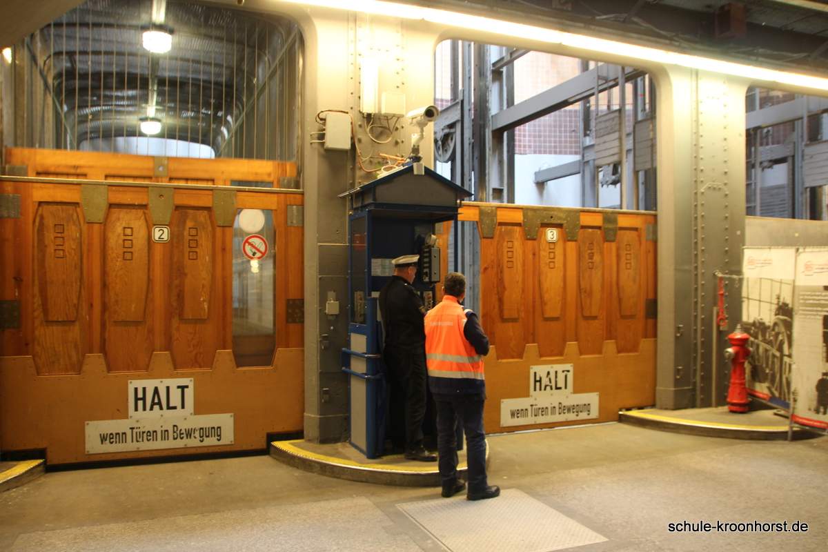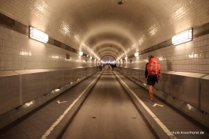 An den Landungsbrücken steigen wir aus und tauchen ein in das Hamburg von vor rund 100 Jahren. Damals war der Elbtunnel eine wichtige Möglichkeit , um in die Werft zu kommen. Heute fährt nur hin und wider ein Auto durch.