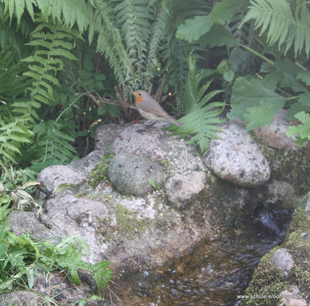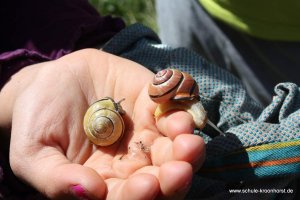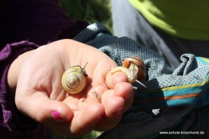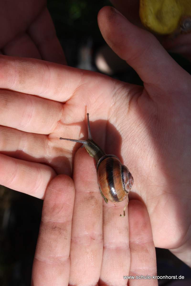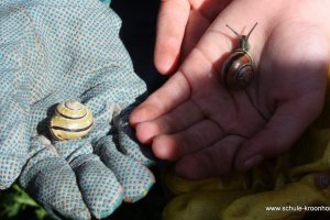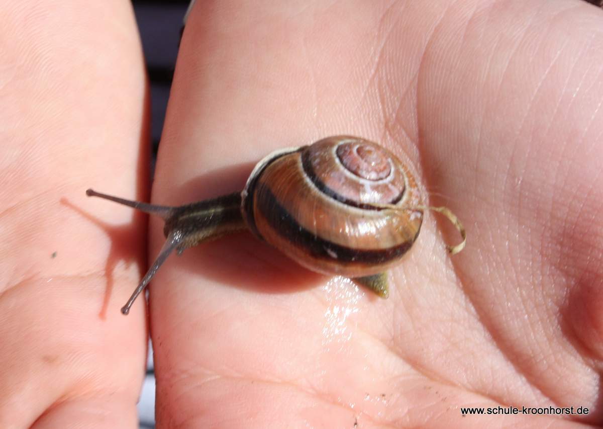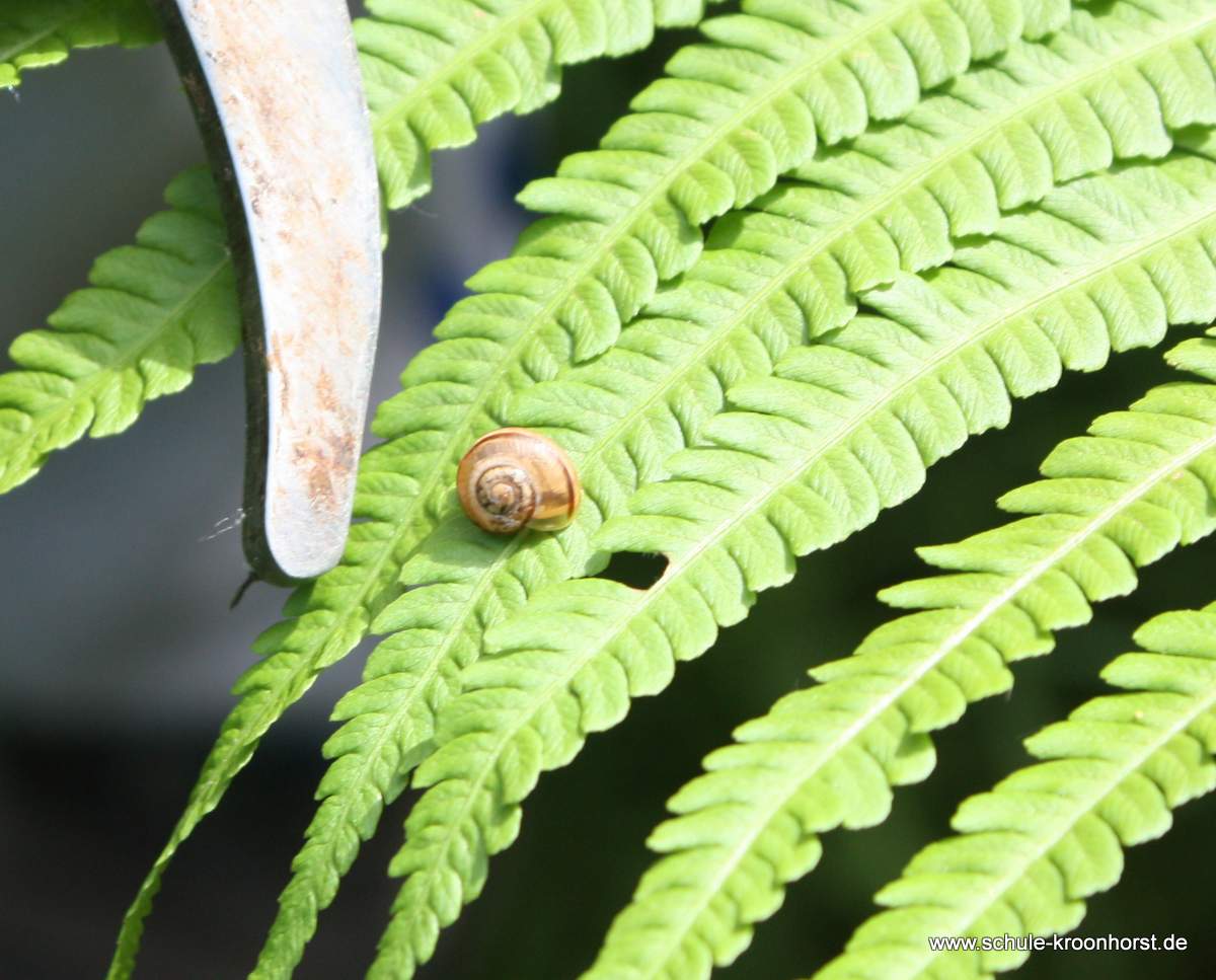 Auf den Beeten am Schulteich wuchert weiter das Unkraut, aber Einiges haben die Kinder schon entfernt. Dabei tauchten viele Schnecken auf. Schön, oder? Weitere Tiere lassen sich trotz Arbeit sehen : Am „Bachlauf“ badete ein Rotkehlchen. Eine Kröte haben wir aus dem Pumphaus befreit. Die jungen Meisen fiepsen in den Rosensträuchern. Ein schönes Biotop unser Schulteich!