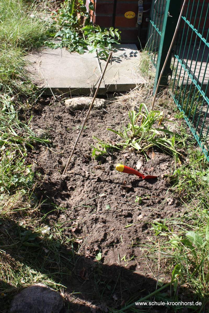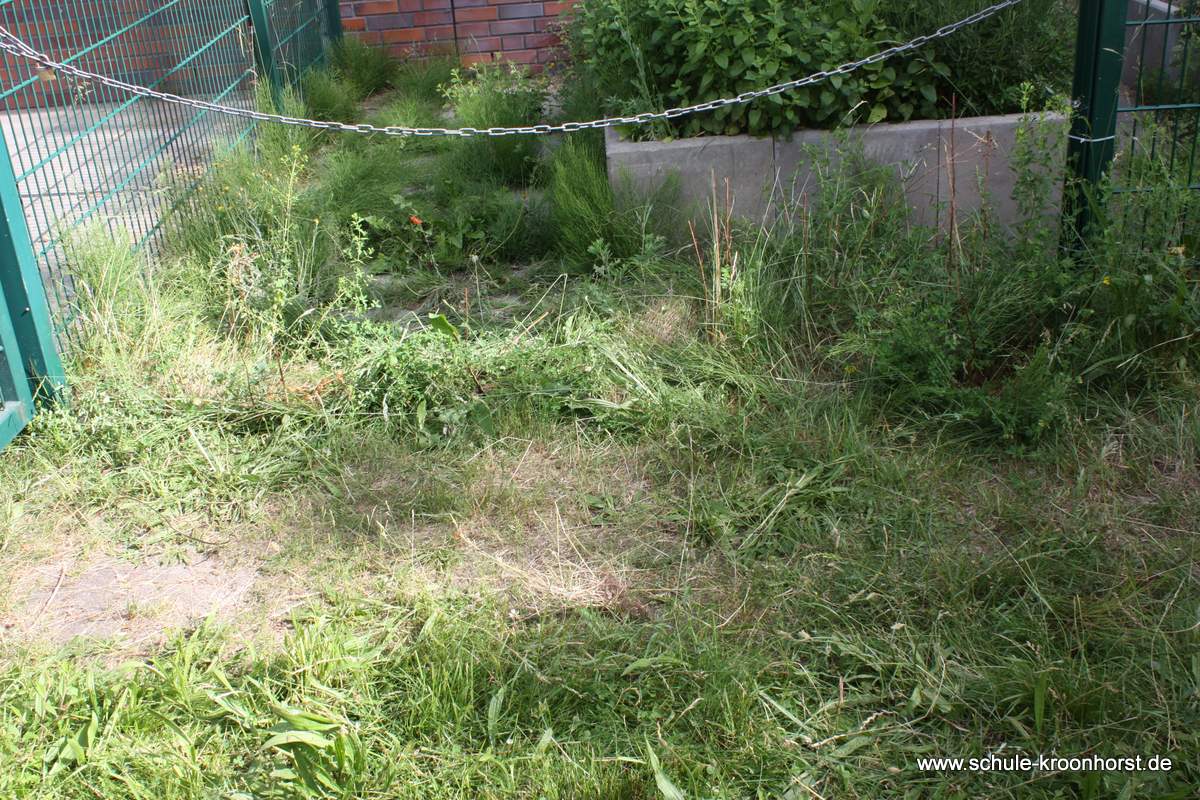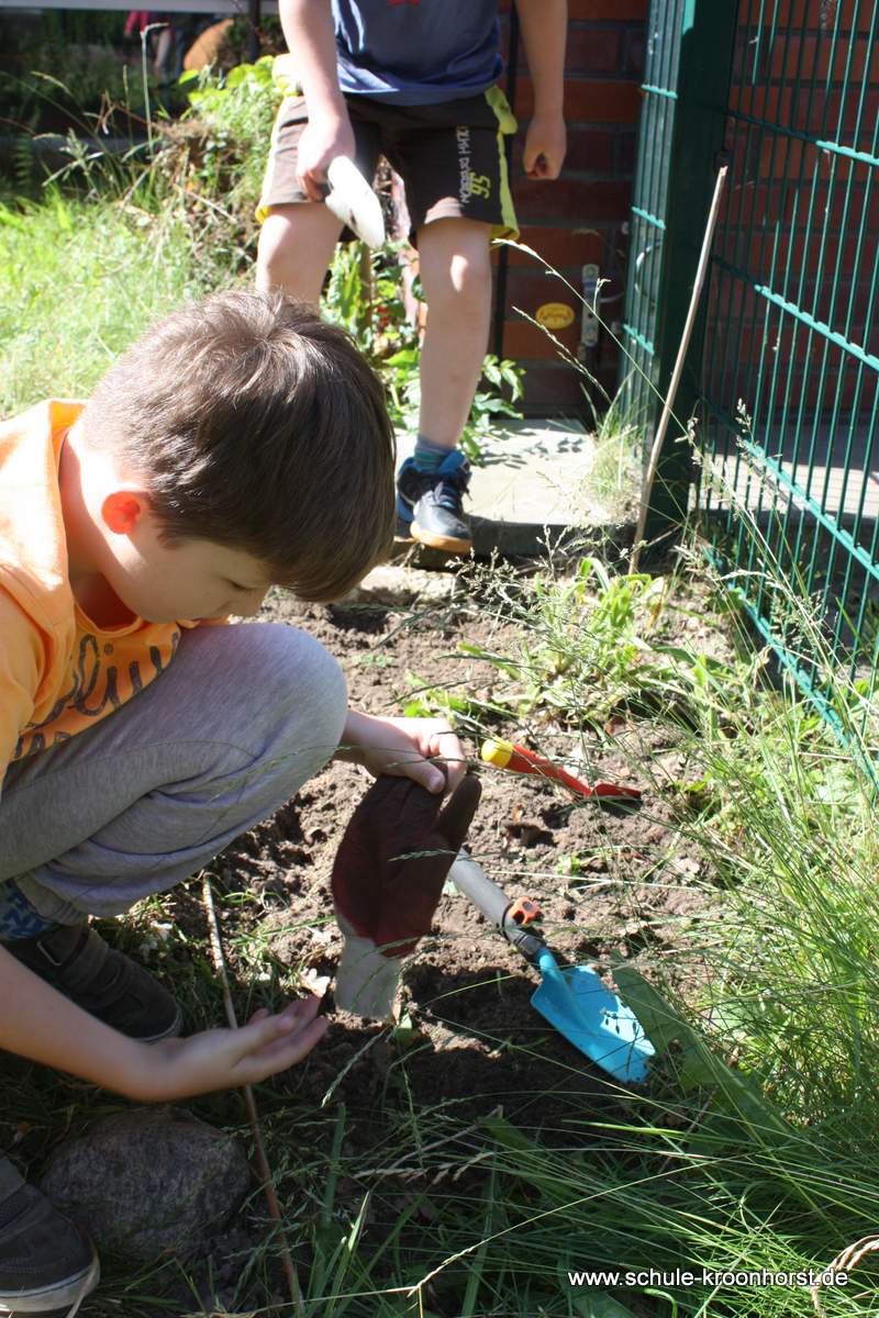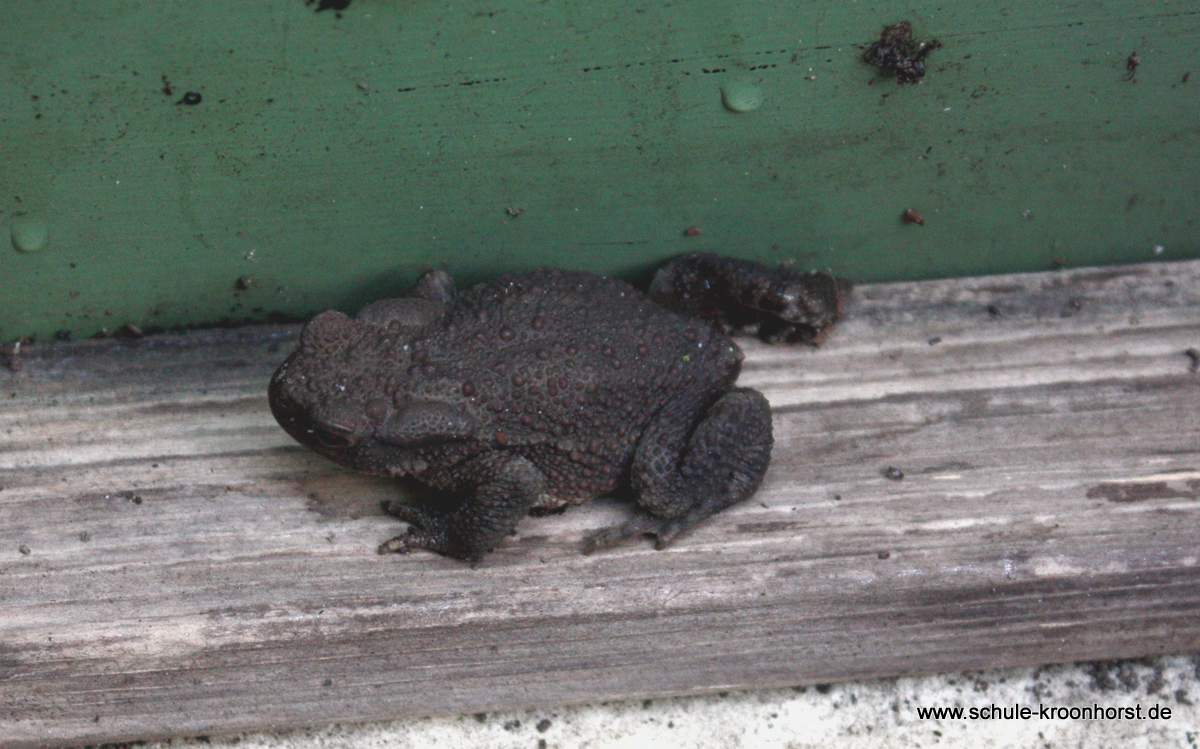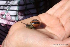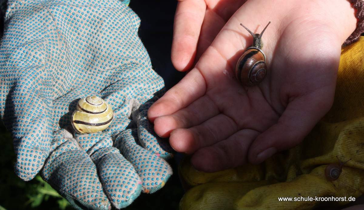 Auf den Beeten am Schulteich wuchert weiter das Unkraut, aber Einiges haben die Kinder schon entfernt. Dabei tauchten viele Schnecken auf. Schön, oder? Weitere Tiere lassen sich trotz Arbeit sehen : Am „Bachlauf“ badete ein Rotkehlchen. Eine Kröte haben wir aus dem Pumphaus befreit. Die jungen Meisen fiepsen in den Rosensträuchern. Ein schönes Biotop unser Schulteich!