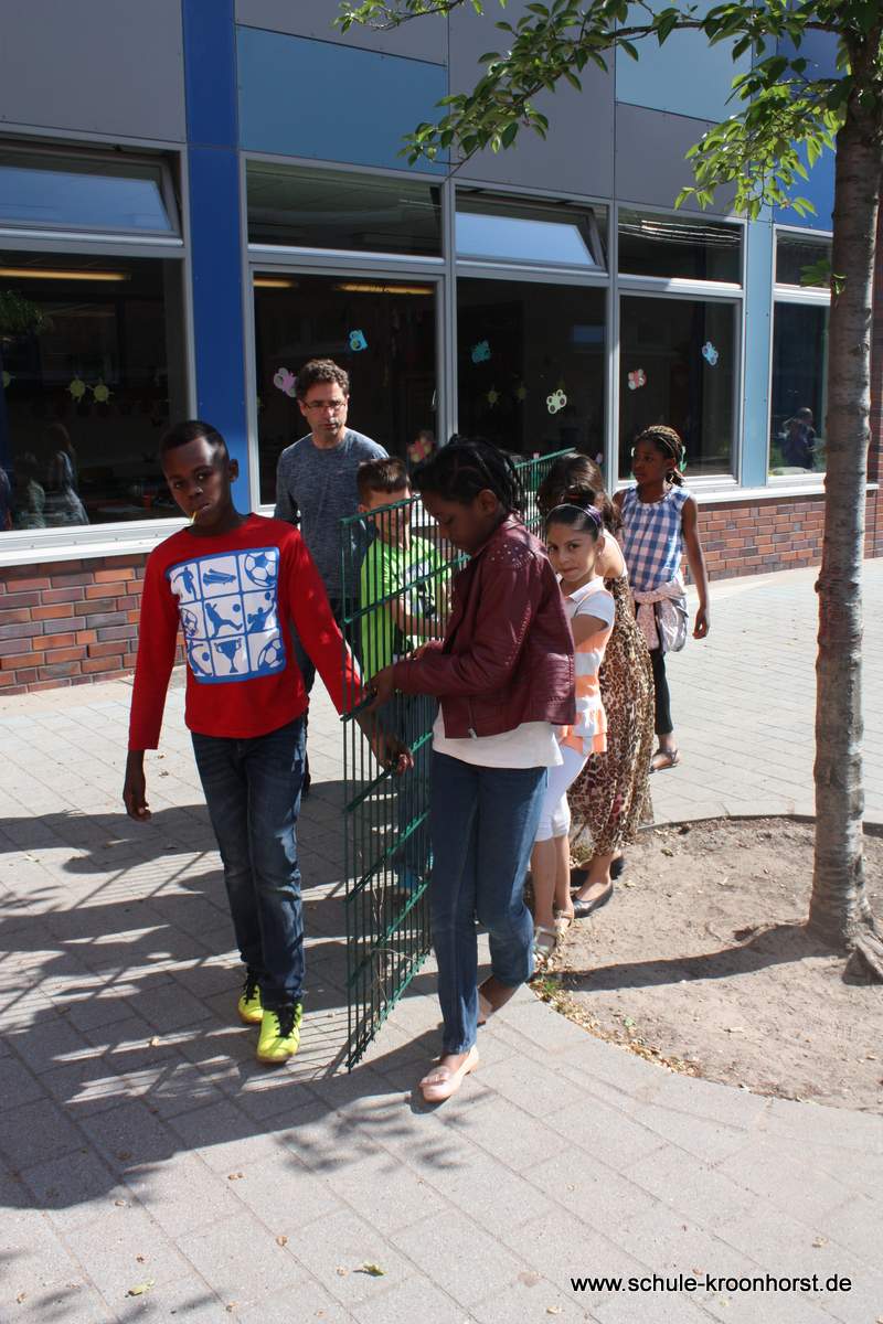 Das war eine anstrengende Woche! Das Zaunelement ist abgebaut, so dass der Zugang vom Schulteich zum Schulgarten endlich möglich ist. „Danke allen Trägern!!“ Ist ganz schön schwer so ein Zaunteil.