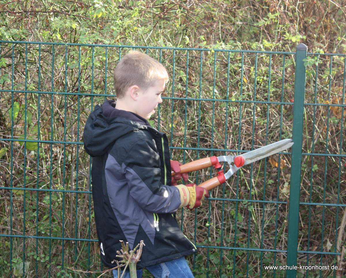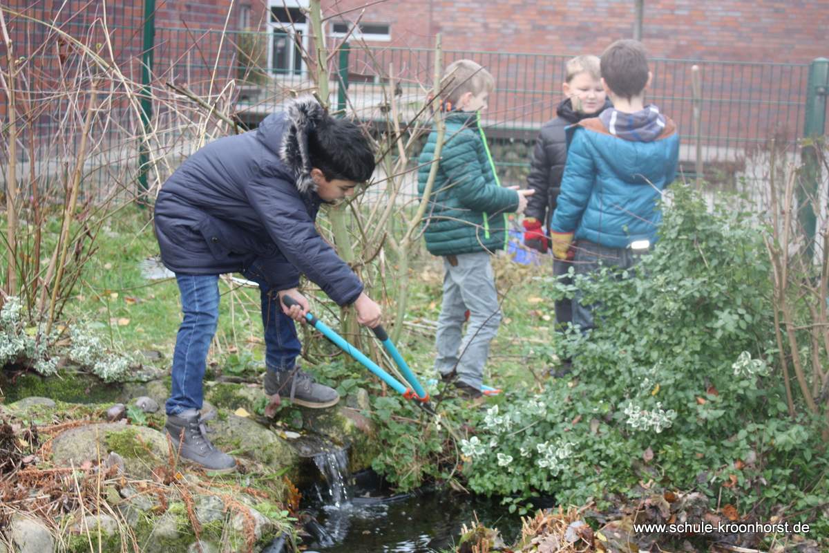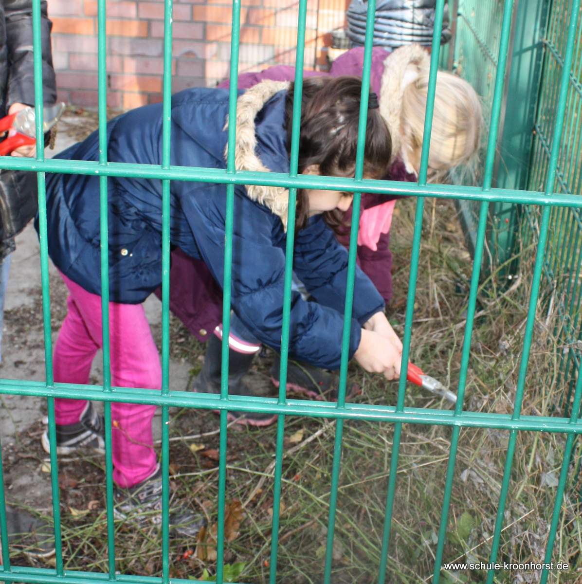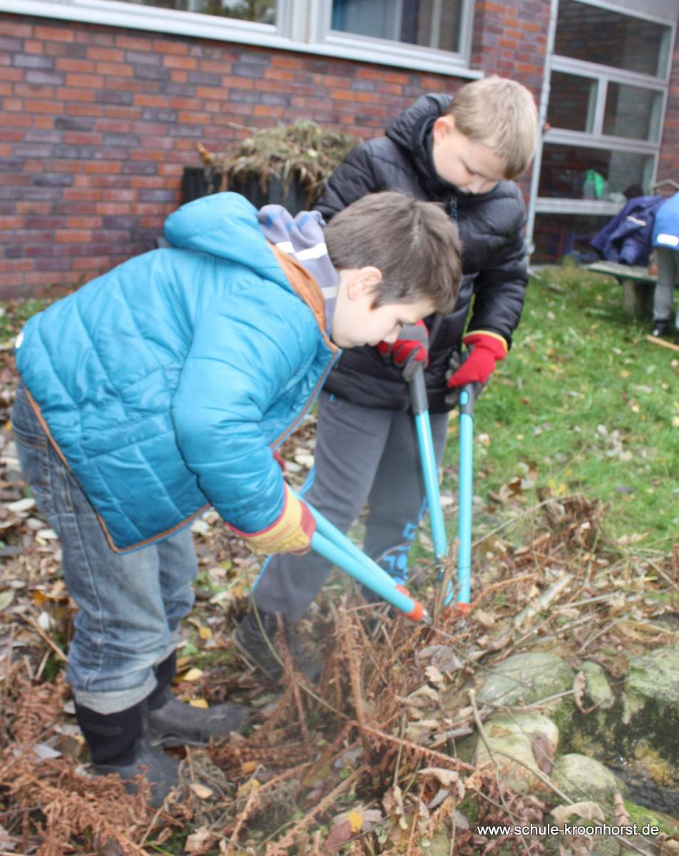 Am Montag vor den Herbstferien haben alle Kinder fleißig das Schilf und einige kleine Bäume zurückgeschnitten. Trotz Regen waren alle sehr motiviert und wir haben viel geschafft. Am Montag nach den Ferien war das Wetter auch nicht viel besser. Wir haben das Unkraut im Schulgarten entfernt und die Steinplatten von Unkraut freigemacht.