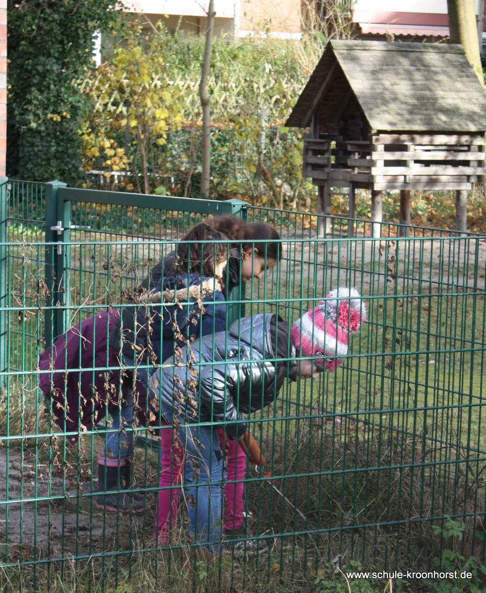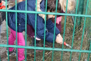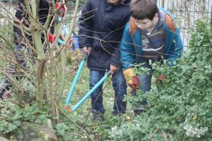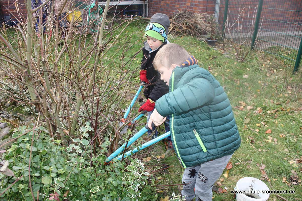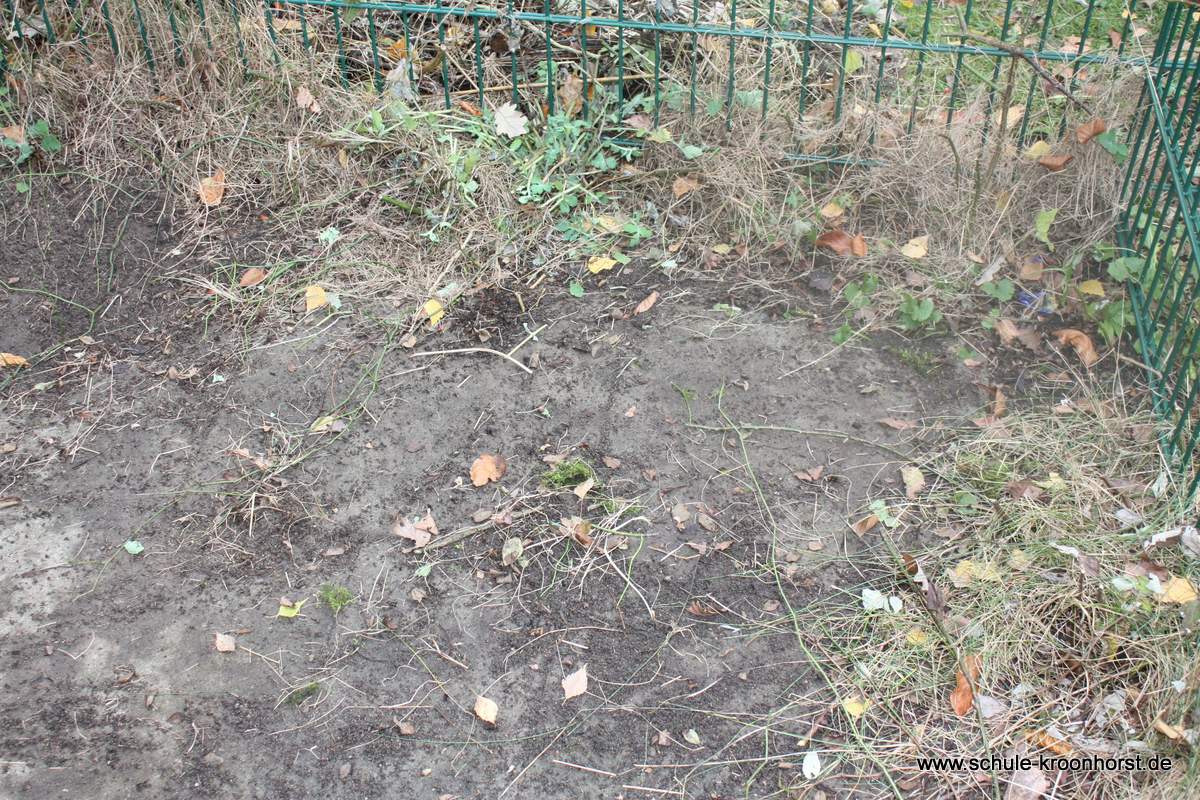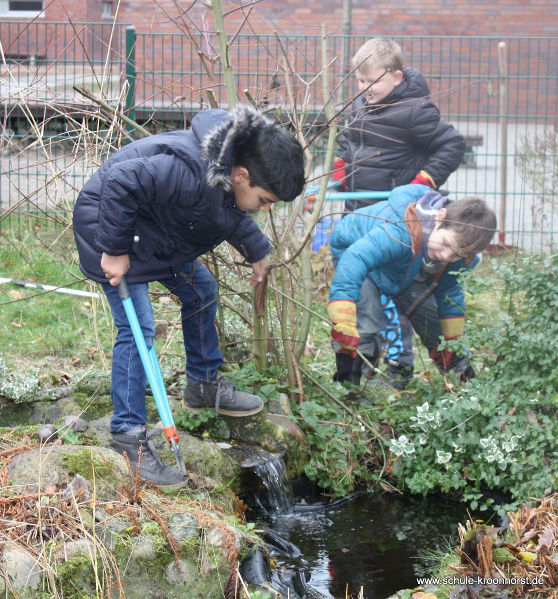 Am Montag vor den Herbstferien haben alle Kinder fleißig das Schilf und einige kleine Bäume zurückgeschnitten. Trotz Regen waren alle sehr motiviert und wir haben viel geschafft. Am Montag nach den Ferien war das Wetter auch nicht viel besser. Wir haben das Unkraut im Schulgarten entfernt und die Steinplatten von Unkraut freigemacht.