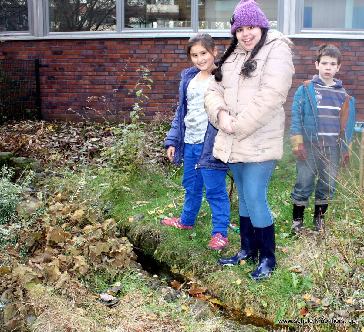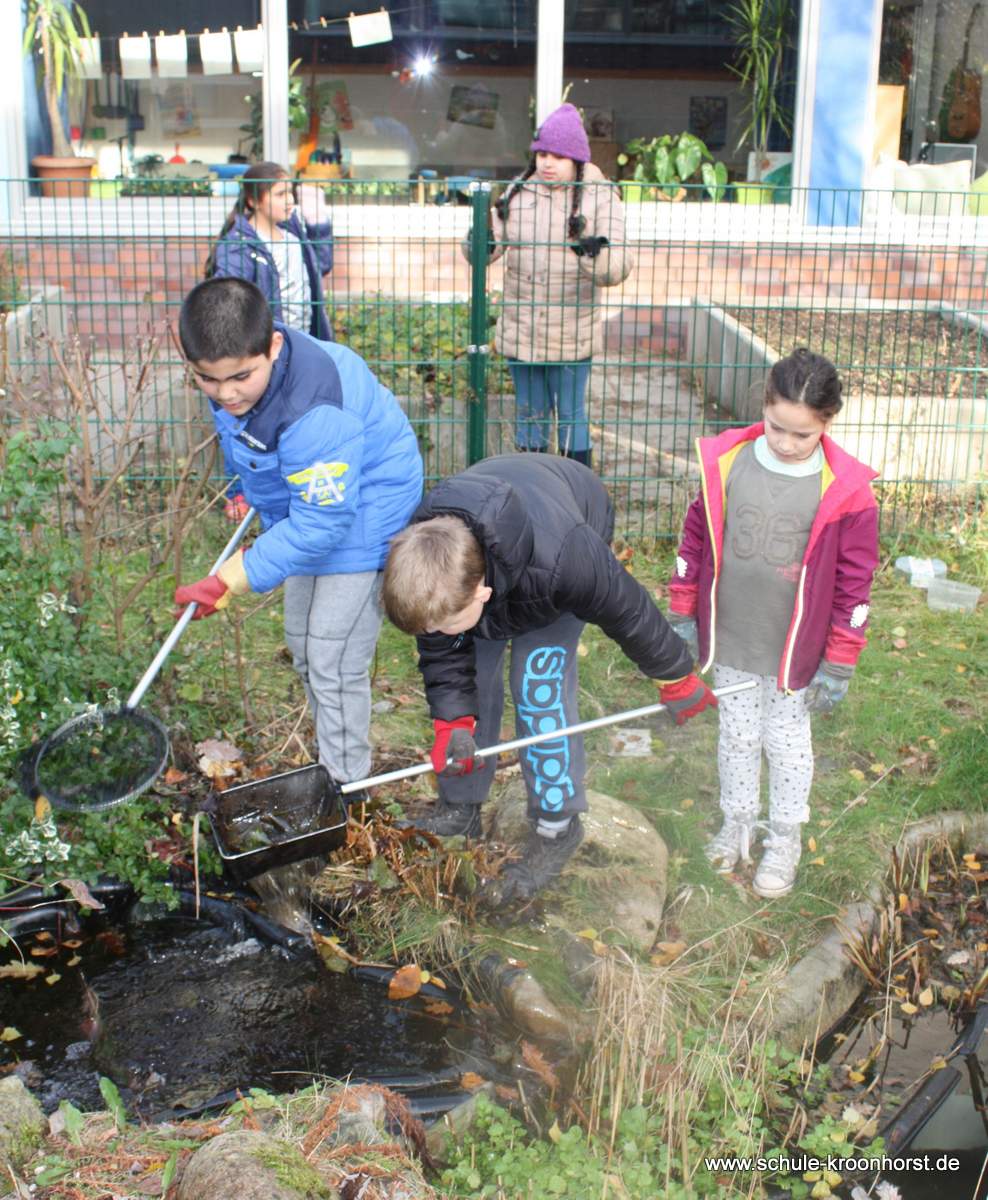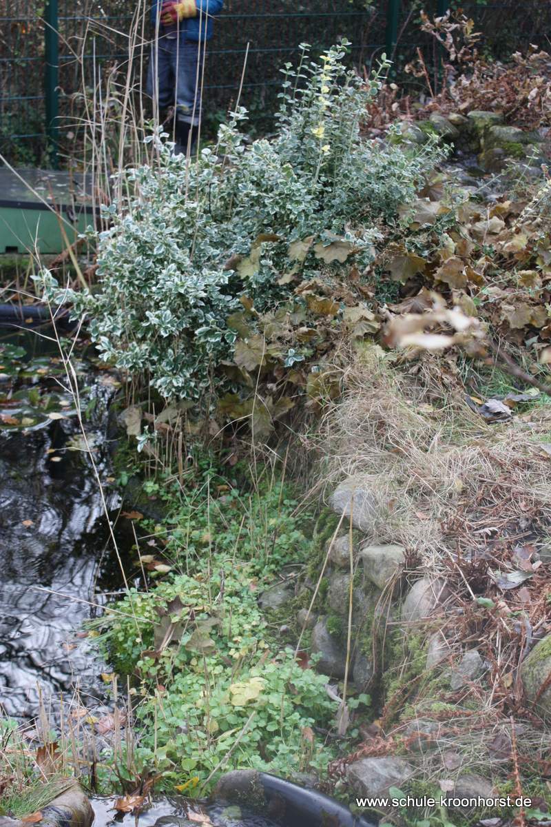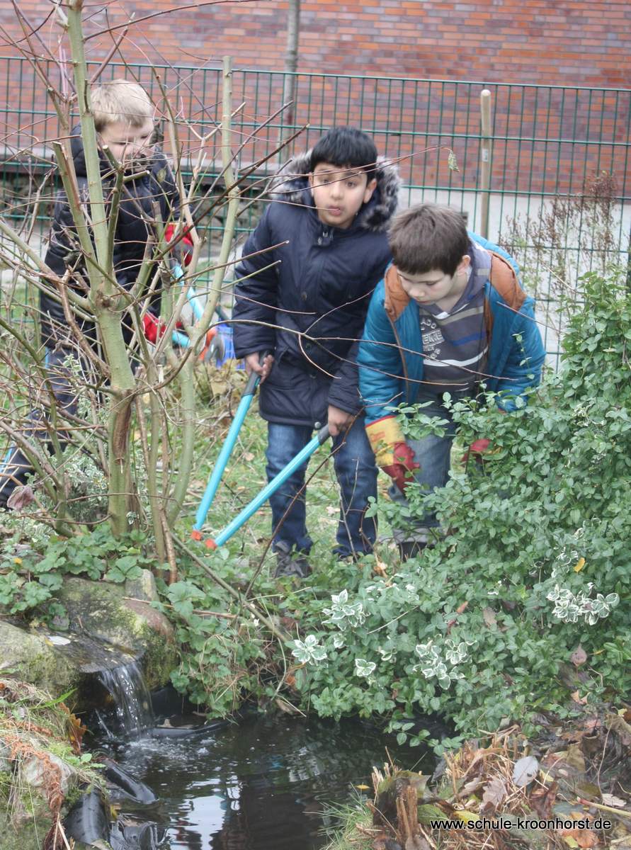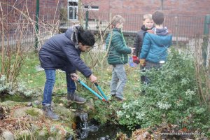 Liva : Am Schulteich haben wir Pflanzen mit Dornen abgeschnitten und ich habe mich geschnitten. Wir haben auch Algen aus dem Teich geholt.