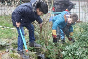 Ronja : Mir gefällt der Kurs, weil ich alles verstehe. Wir haben Schlingpflanzen entfernt und mit dem Rechen gearbeitet. Heute war der Teich zugefrohren.
