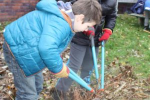 Nora und Zainab : Wir haben mit der Gartenschere Äste abgeschnitten und haben gehächselt. Das hat Spaß gemacht!
