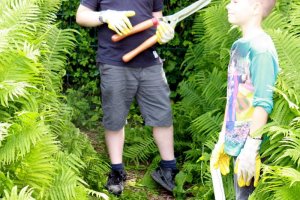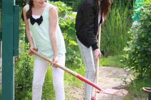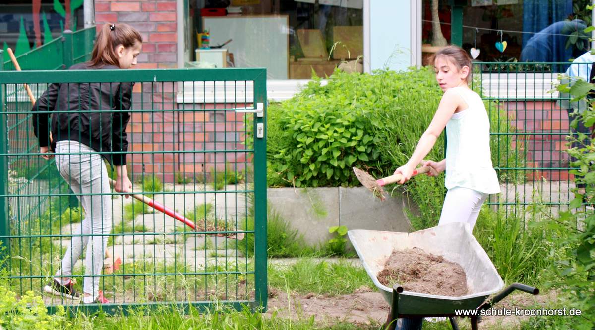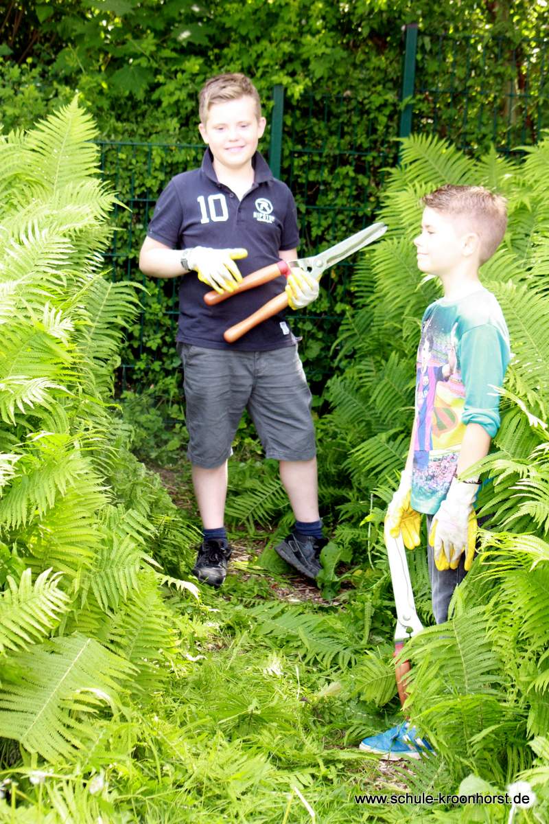 Theresa und Halima kämpfen mit dem Löwenzahn und versuchen den Weg unkrautfrei zu bekommen. Dominik und Konstantin haben die Beerenfrücht vom Unkraut befreit. Prima!! Alle anderen Kinder haben im Schulgarten die Schachtelhalme entfernt. Das ist lästiges Unkraut mit sehr langen Wurzeln.