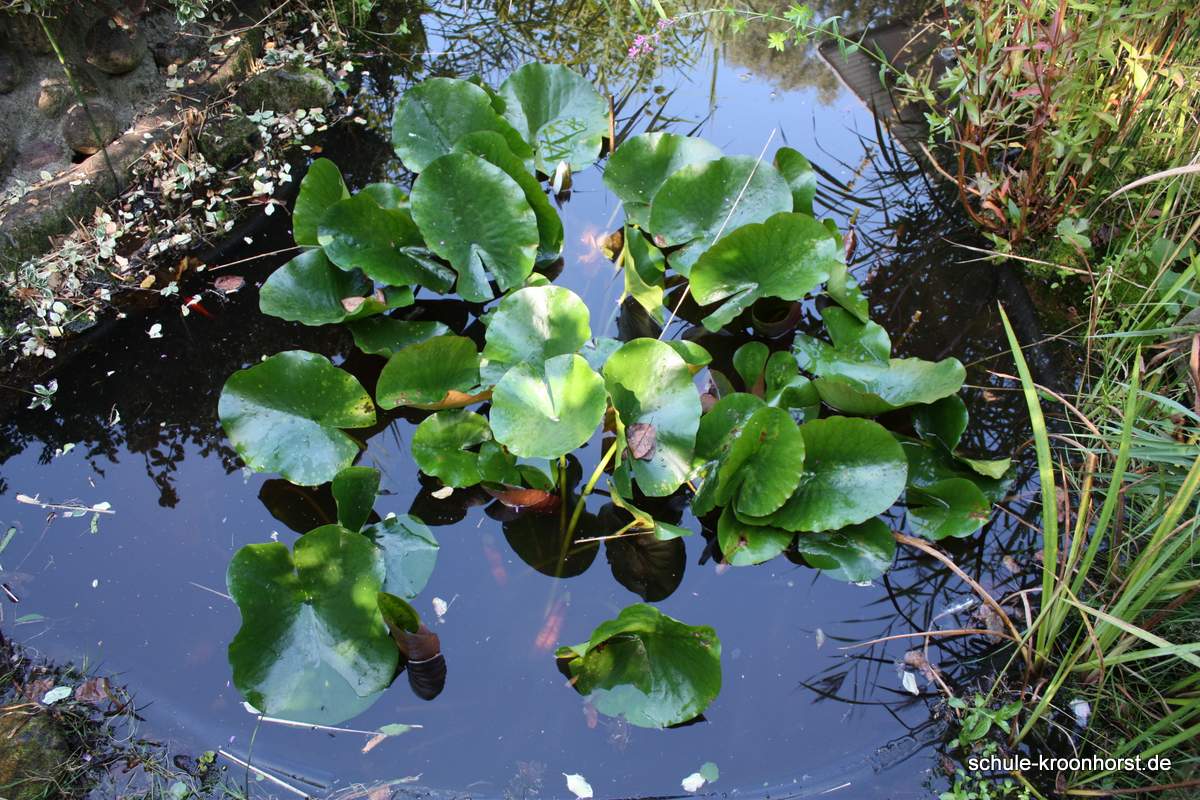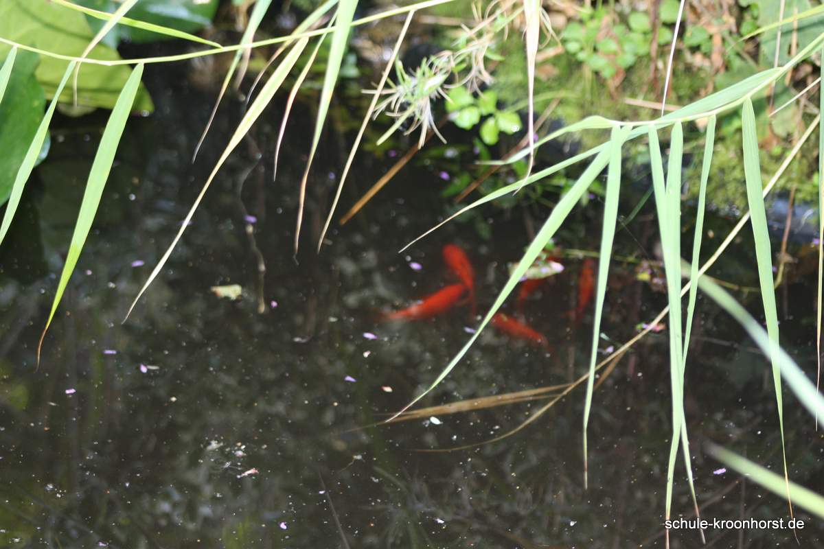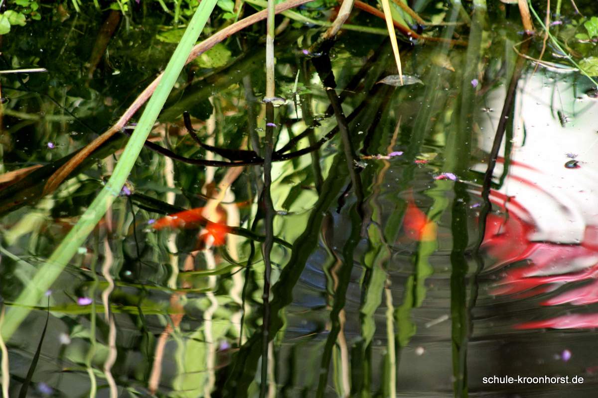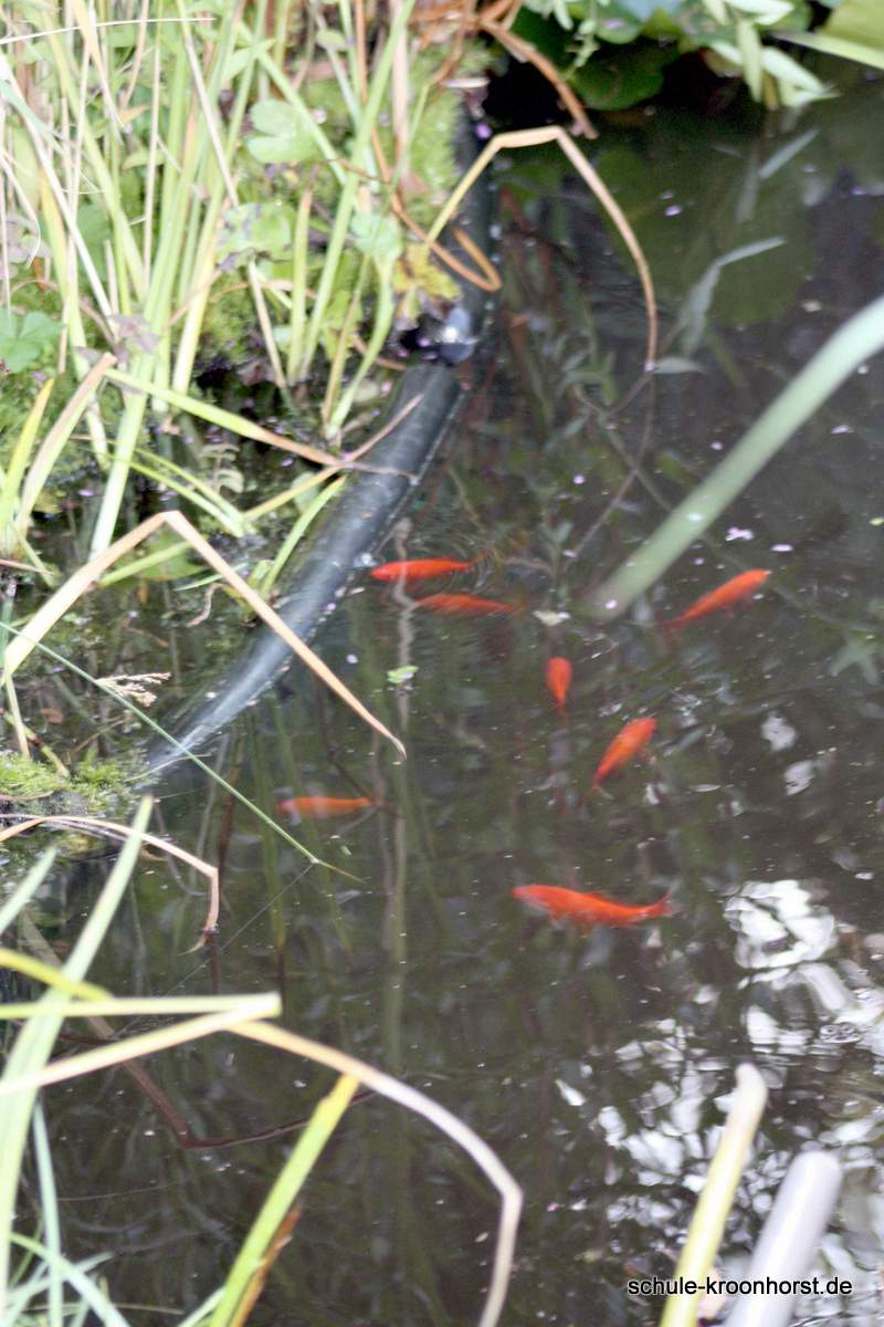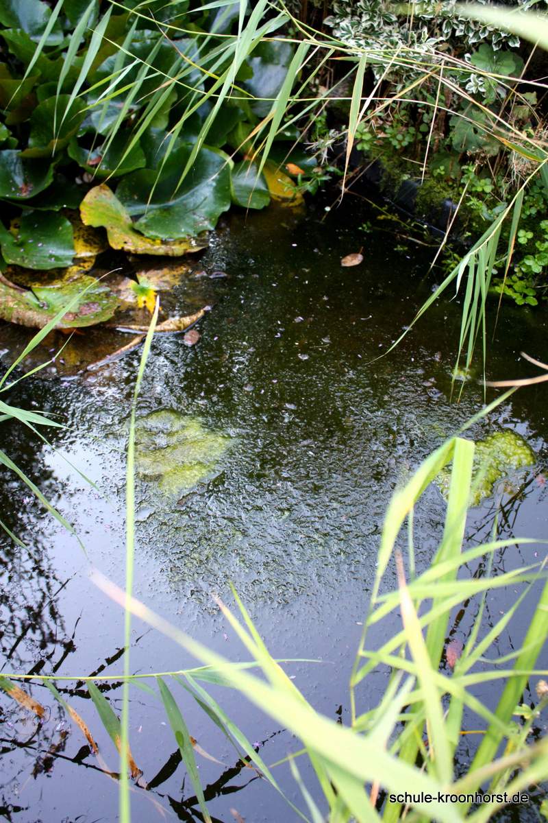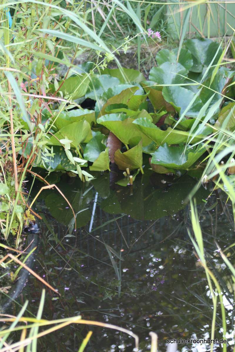Da der Schulteichkurs erst am 11.09. beginnt, habe ich Hand angelegt. Zunächst musste das Schilf abgeschnitten werden, damit ich an den Teich komme. Die Algen haben sich derartig vermehrt  – also erstmal kiloweise Algen herausfischen. Und wie man sieht – die Fische sagen DANKE! Auch die Seerose hat sich über den halben Teich ausgebreitet. Den Berg Seerosenblätter seht Ihr auf einem der Fotos. Plötzlich lassen sich auch dieFrösche wieder blicken. Nun noch den Uferbereich lichten und Wasser in den Teich fließen lassen. Die Filter der Pumpe sind gereinigt, aber leider funktioniert die Pumpe zur Zeit noch nicht. Unser Hausmeister tut, was er kann. Danke!