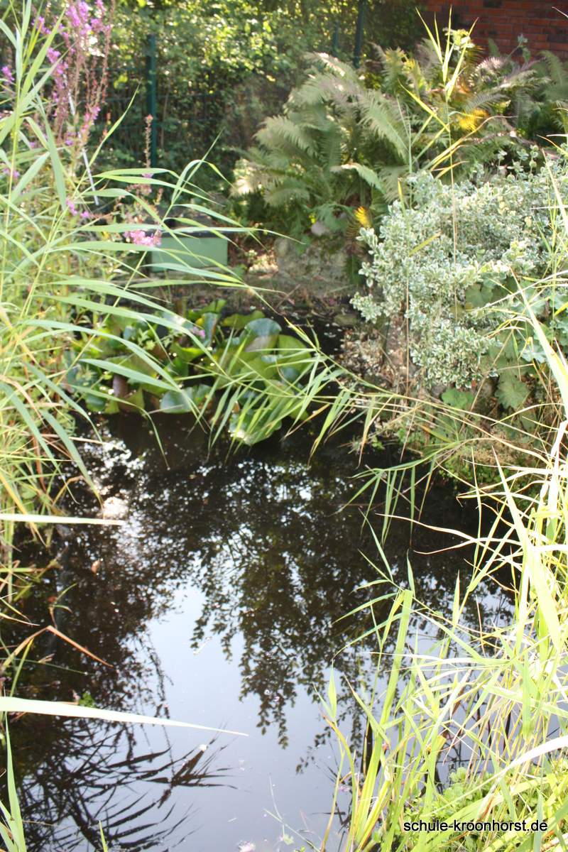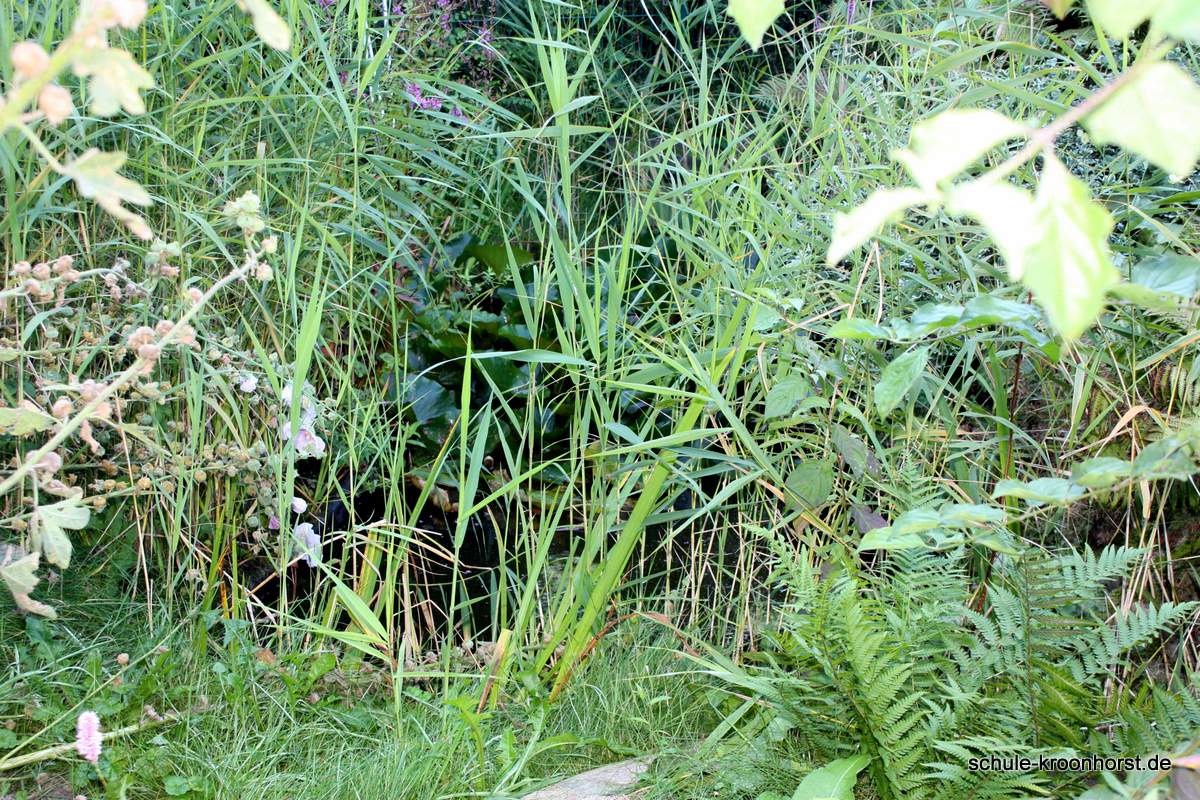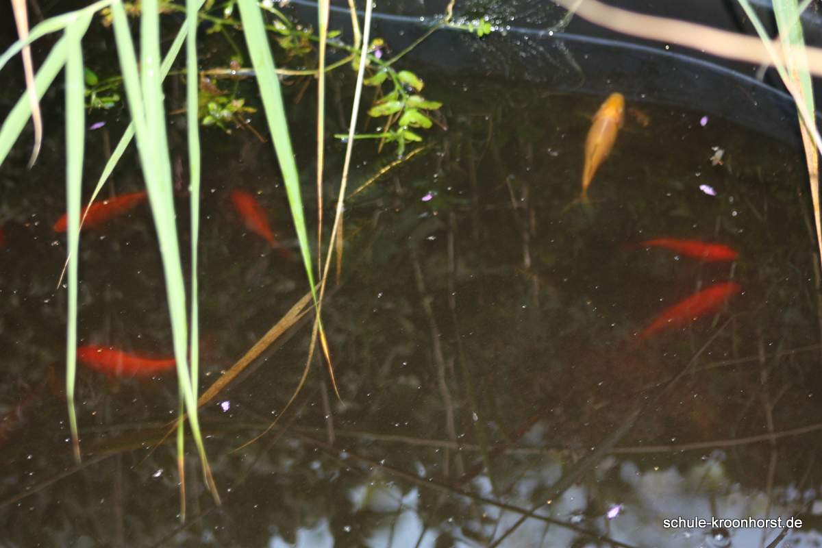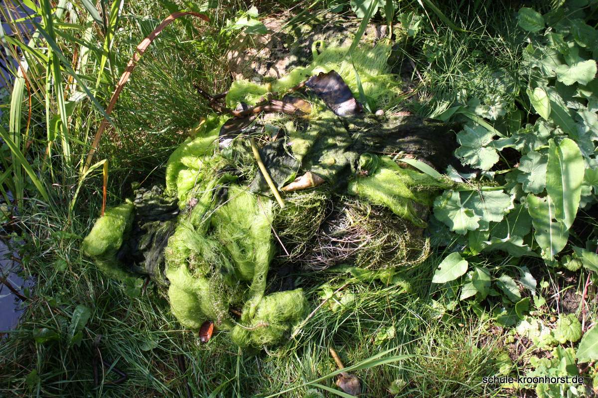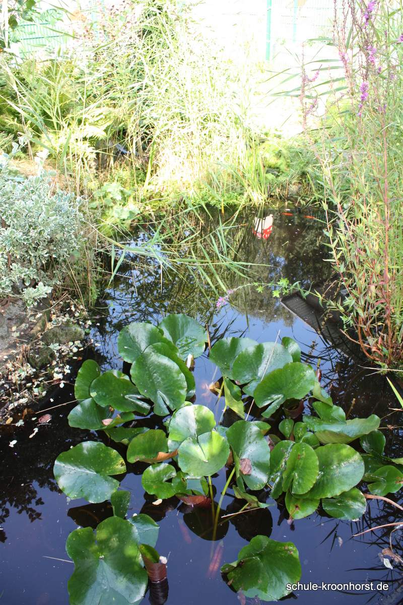 Da der Schulteichkurs erst am 11.09. beginnt, habe ich Hand angelegt. Zunächst musste das Schilf abgeschnitten werden, damit ich an den Teich komme. Die Algen haben sich derartig vermehrt  – also erstmal kiloweise Algen herausfischen. Und wie man sieht – die Fische sagen DANKE! Auch die Seerose hat sich über den halben Teich ausgebreitet. Den Berg Seerosenblätter seht Ihr auf einem der Fotos. Plötzlich lassen sich auch dieFrösche wieder blicken. Nun noch den Uferbereich lichten und Wasser in den Teich fließen lassen. Die Filter der Pumpe sind gereinigt, aber leider funktioniert die Pumpe zur Zeit noch nicht. Unser Hausmeister tut, was er kann. Danke!