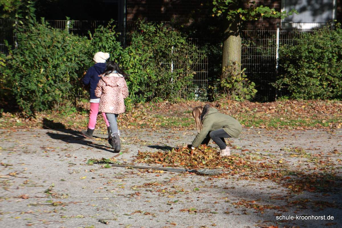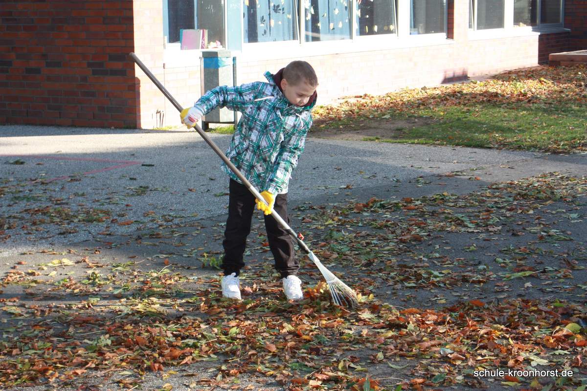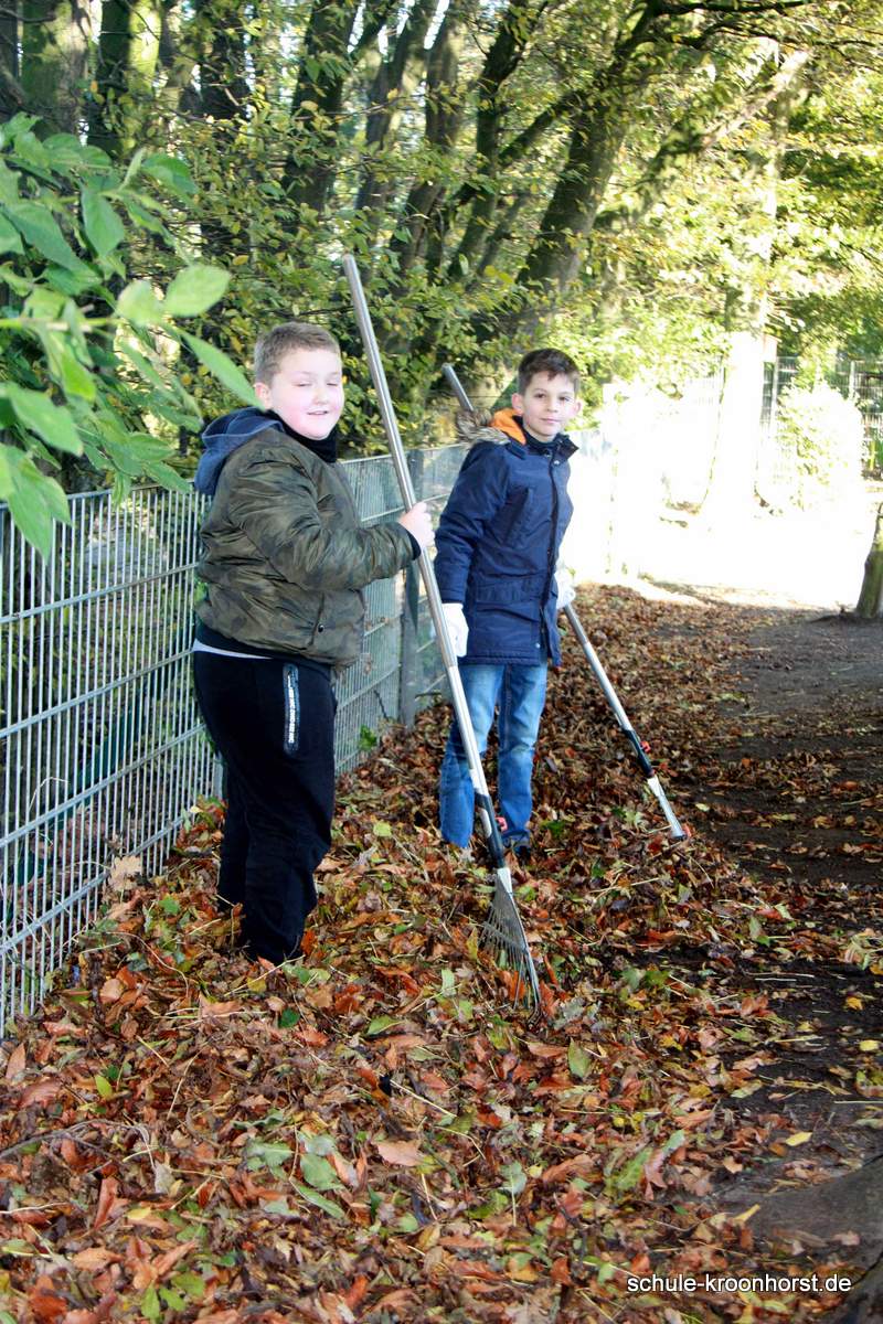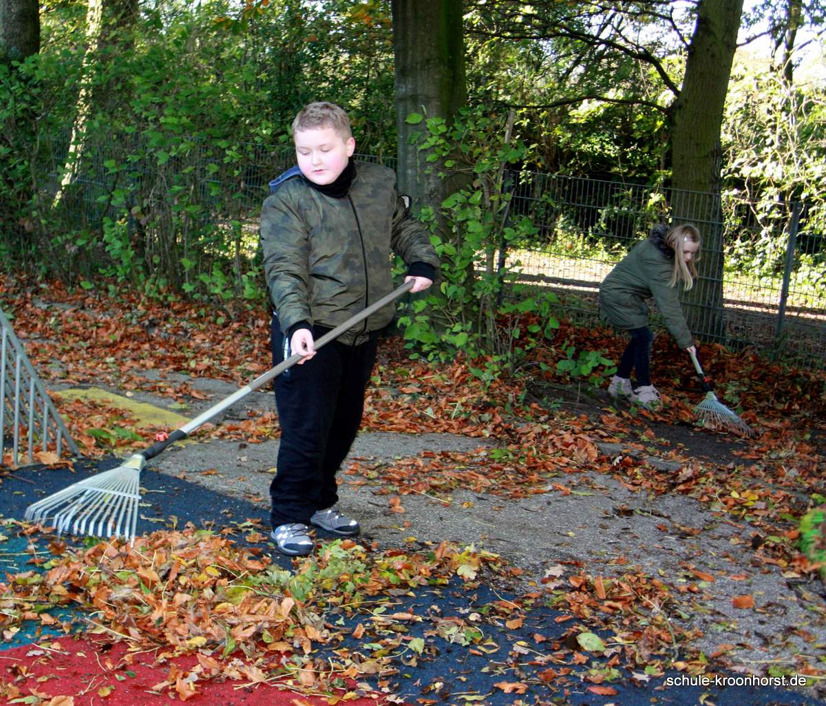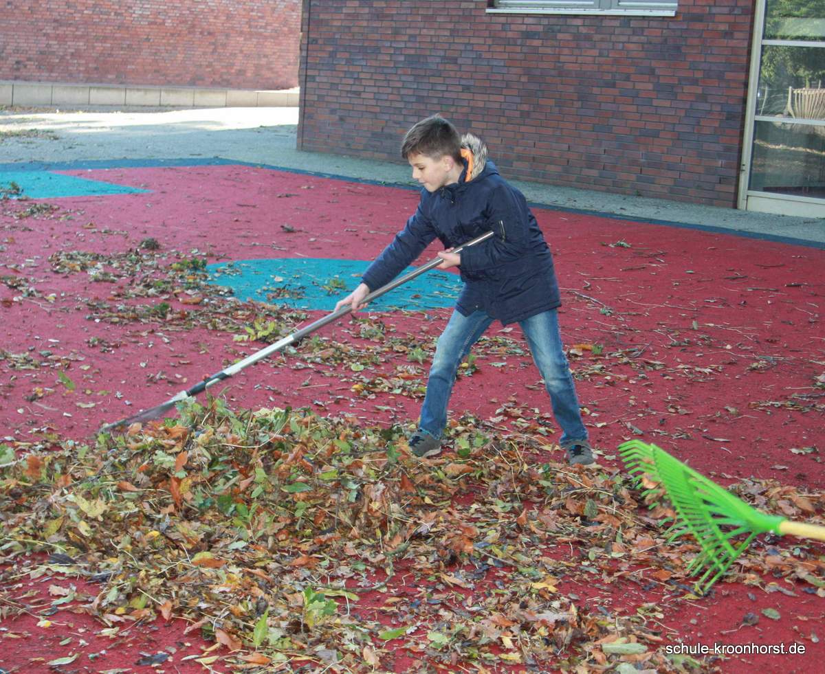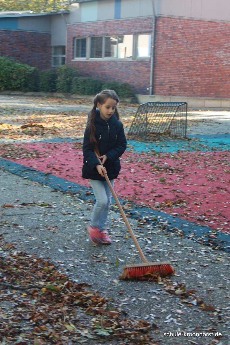 Also hieß es für uns, den Fußballplatz und den Schulhof vom Laub befreien. Das war harte Arbeit, hat aber auch Spaß gebracht und … man sieht den Erfolg! Die Fußballspieler werden es euch danken.