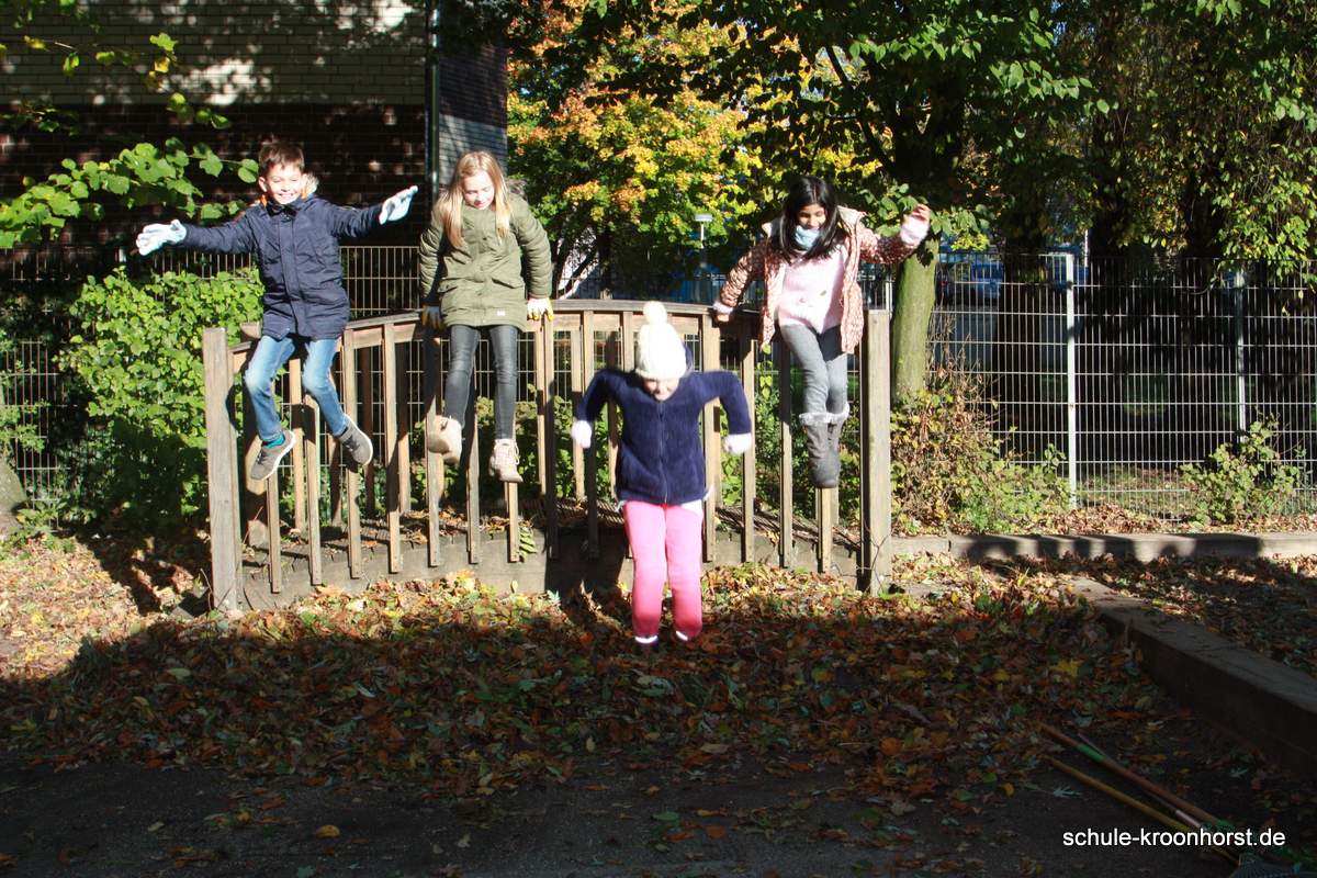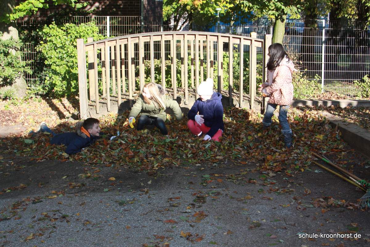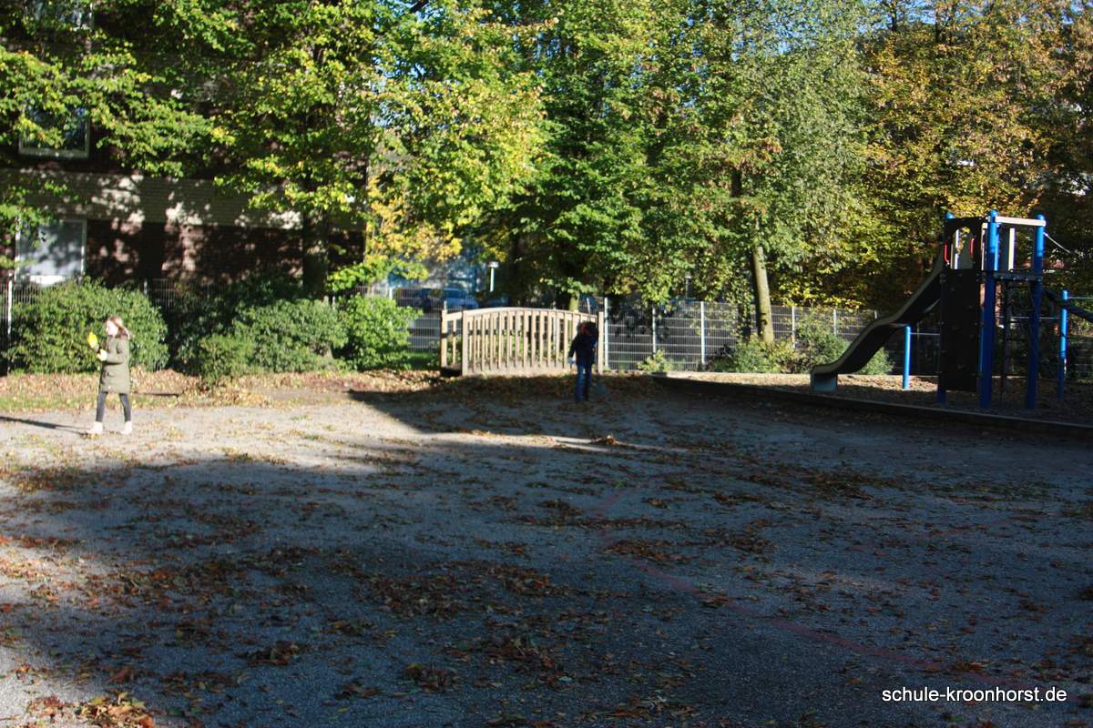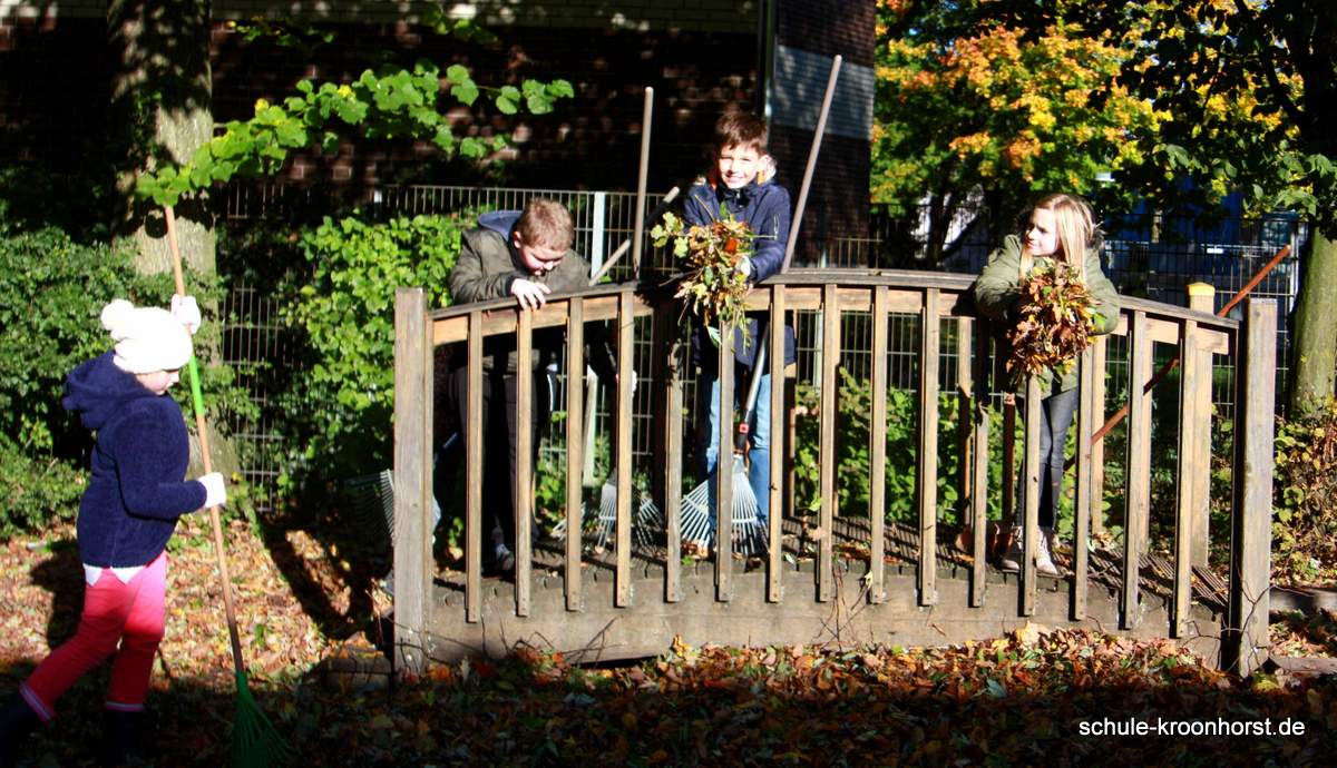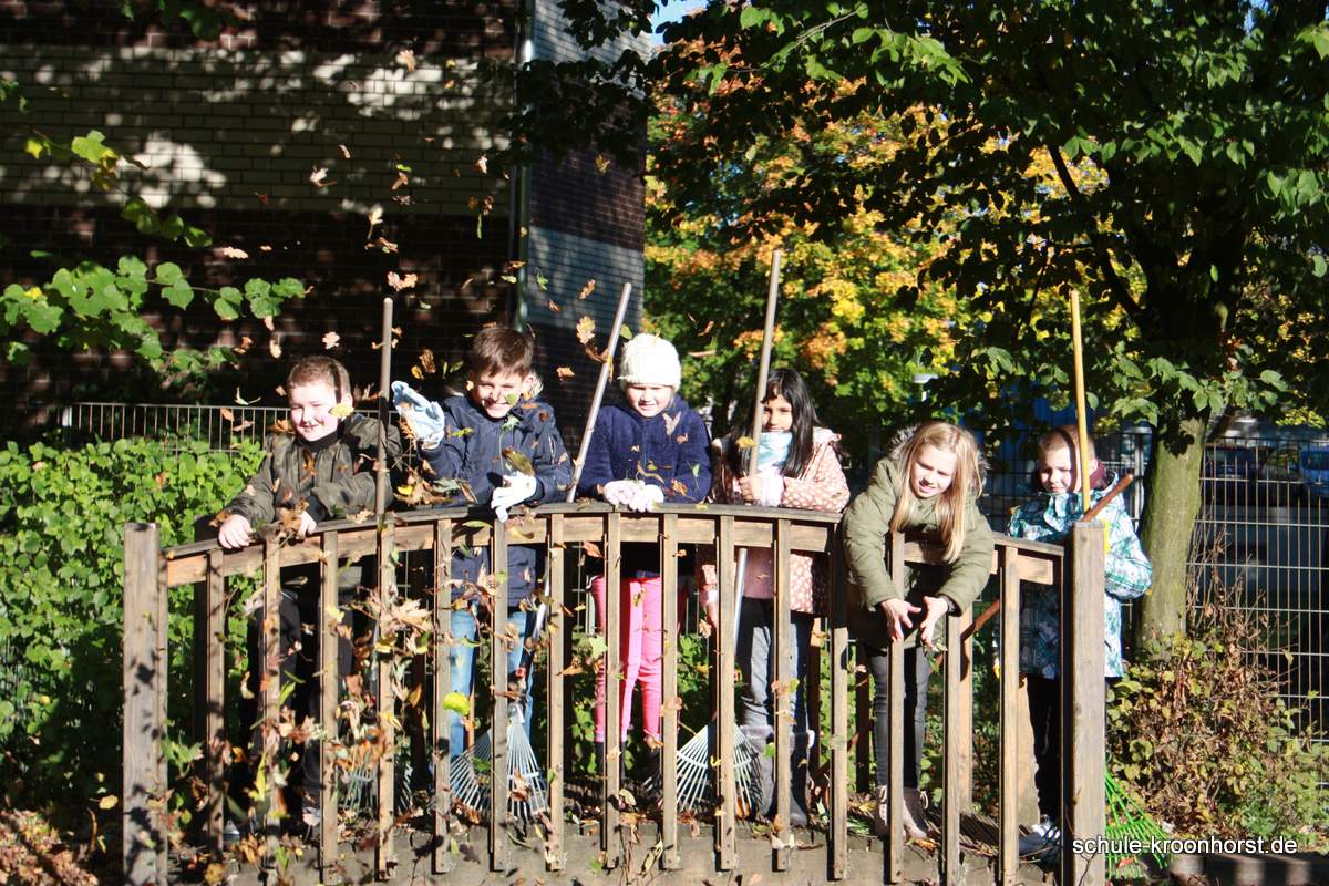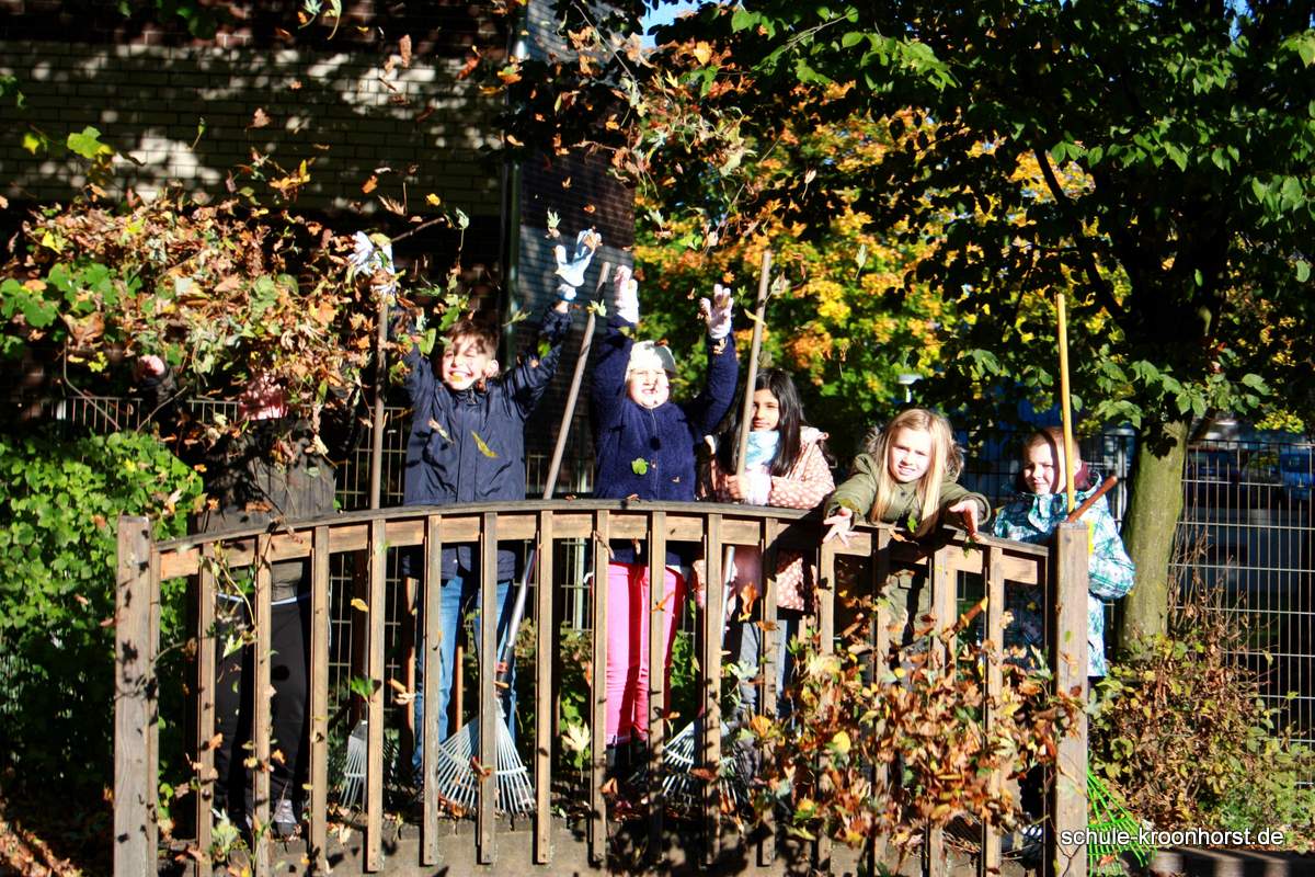 Also hieß es für uns, den Fußballplatz und den Schulhof vom Laub befreien. Das war harte Arbeit, hat aber auch Spaß gebracht und … man sieht den Erfolg! Die Fußballspieler werden es euch danken.