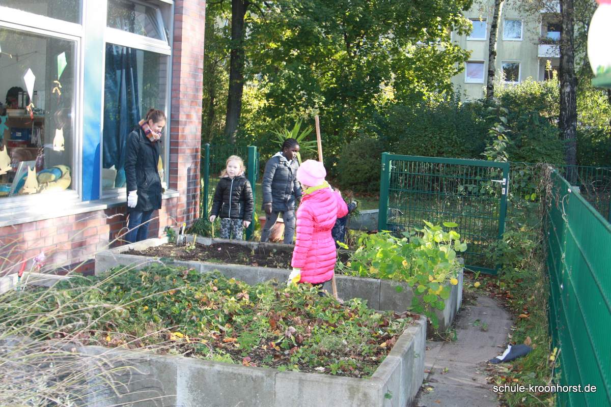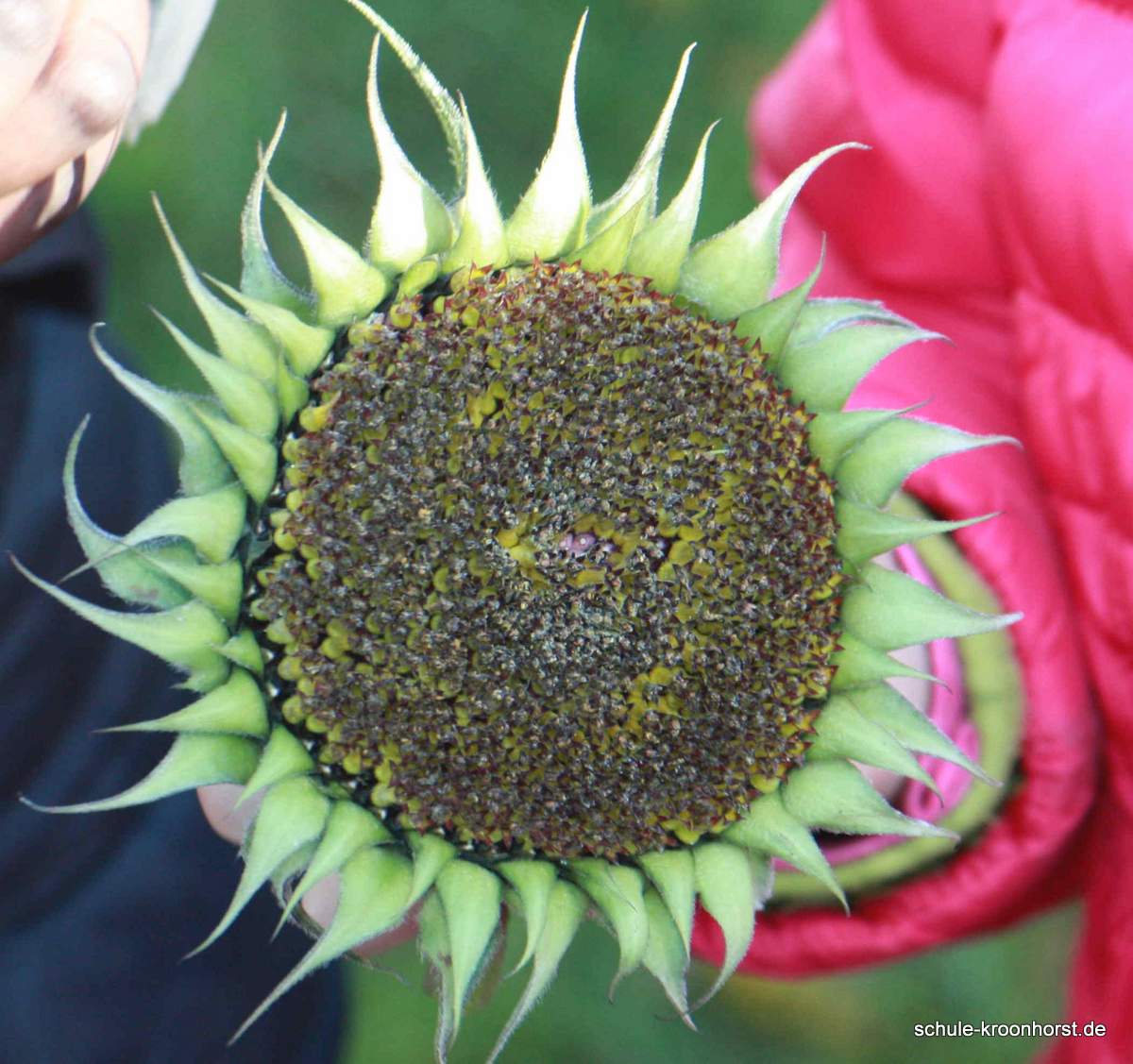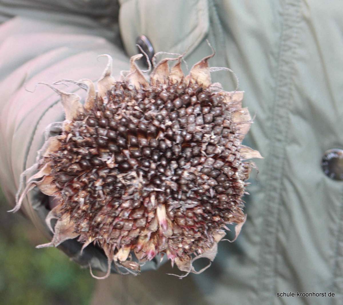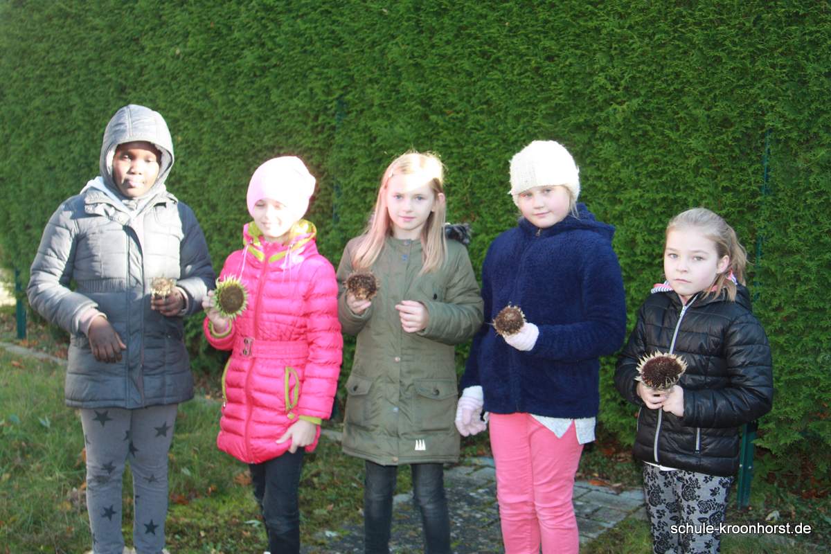 Auch im Schulgarten hat sich einiges getan. Sie Sonnenblumen mussten mit den Astscheren  heruntergeschnitten werden. So dick waren die Stiele. Die Sonnenblumen wurden geerntet und an die fleißigen Gärtner verteilt (zum Zeigen in den Klassen und zum Probieren!!) Beim Zurückschneiden haben wir schon einen Frühblüher entdeckt – eine Hyazinthe. Verrücktes Klima!!