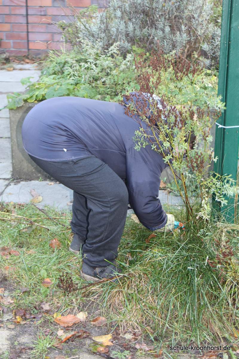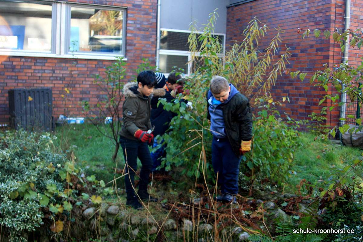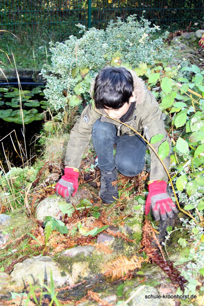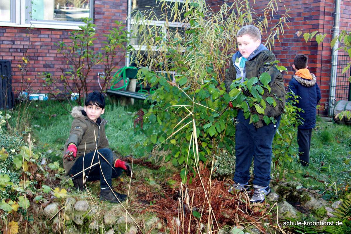 Lisa und Isabella haben waghalsig im Sumpfgebiet die Pflanzen zurückgeschnitten. Und das war ganz schön kalt!! Amir und Arthur haben das verwelkte Farnkraut entfernt und die Wasserrinne freigemacht. (Die Pumpe funktioniert aber noch nicht!). Bedri und Gast Sinan haben die Weiden und andere Sträucher zurückgeschnitten.