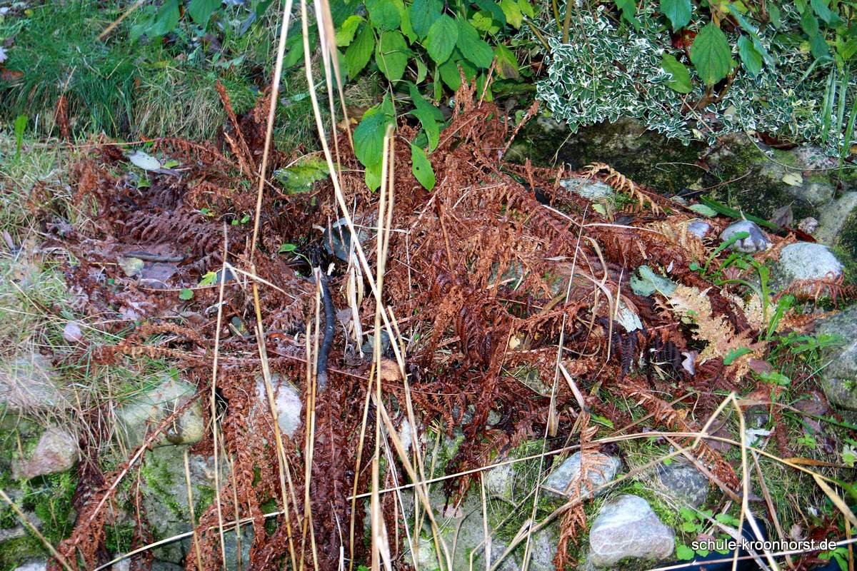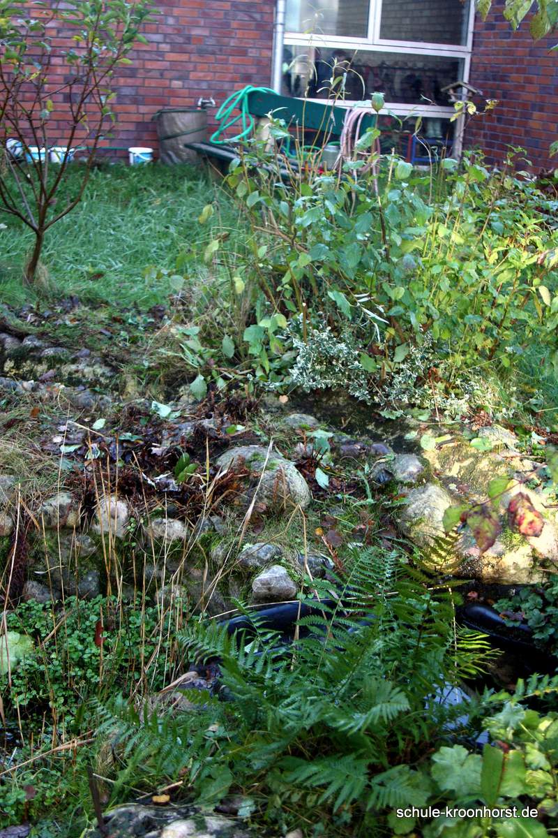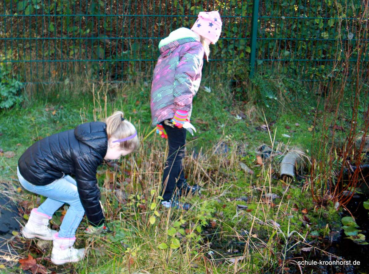 Lisa und Isabella haben waghalsig im Sumpfgebiet die Pflanzen zurückgeschnitten. Und das war ganz schön kalt!! Amir und Arthur haben das verwelkte Farnkraut entfernt und die Wasserrinne freigemacht. (Die Pumpe funktioniert aber noch nicht!). Bedri und Gast Sinan haben die Weiden und andere Sträucher zurückgeschnitten.