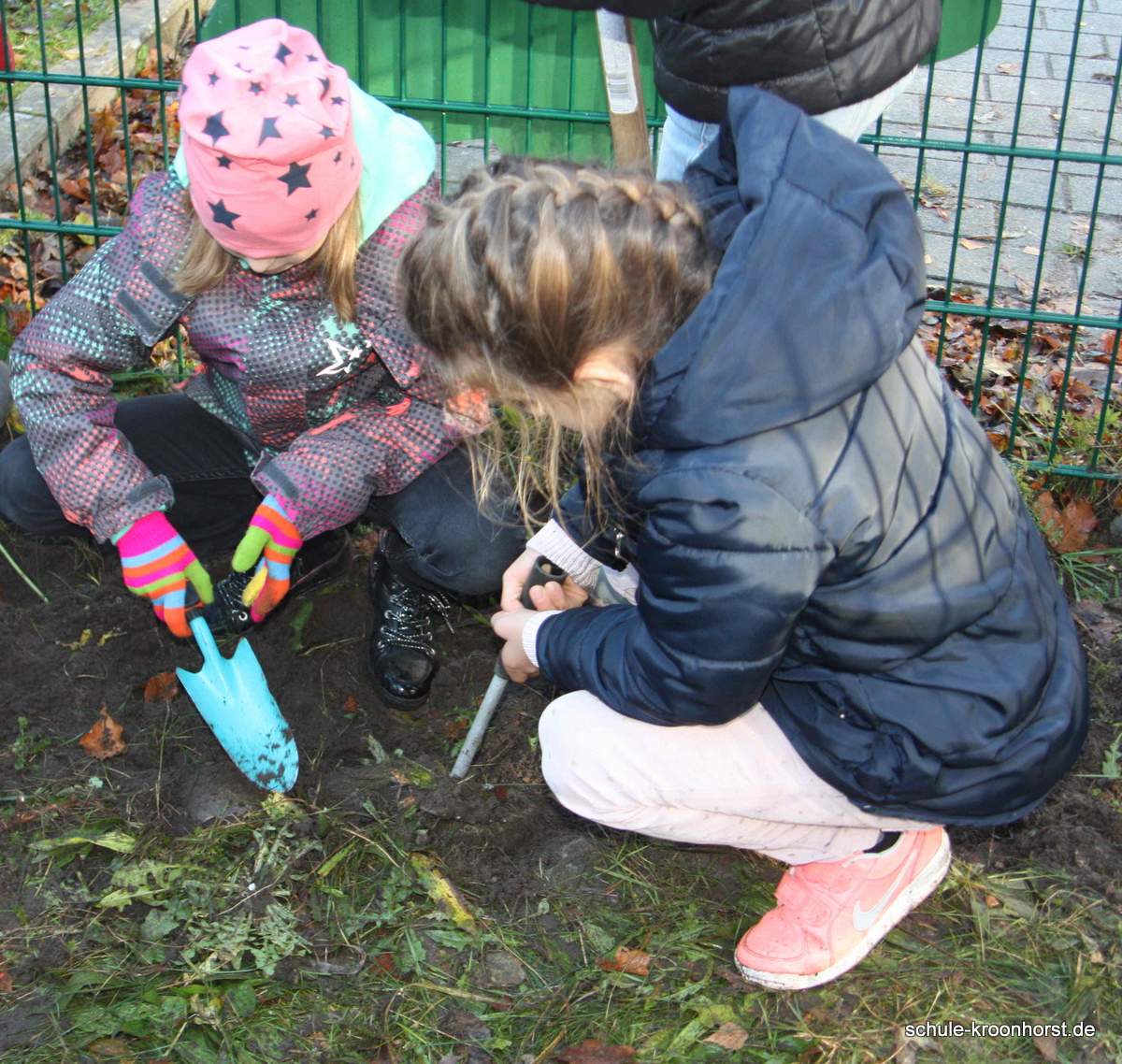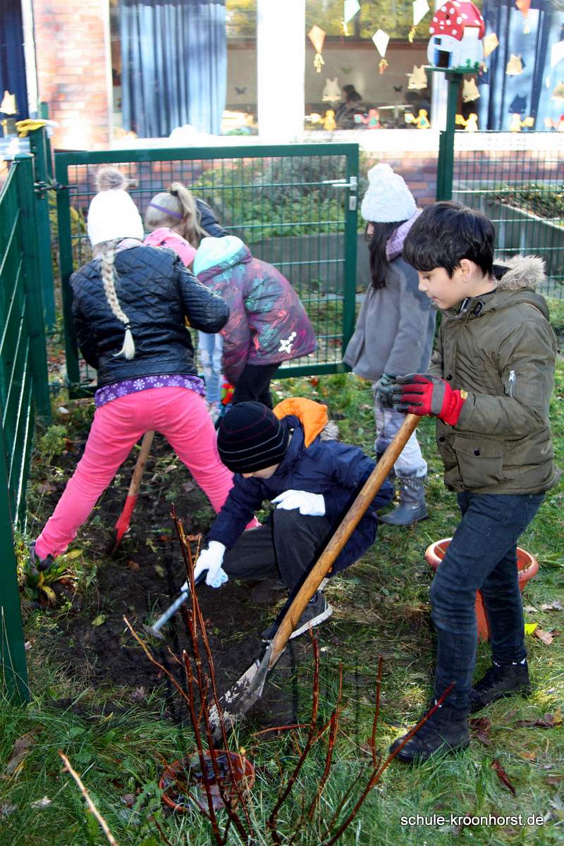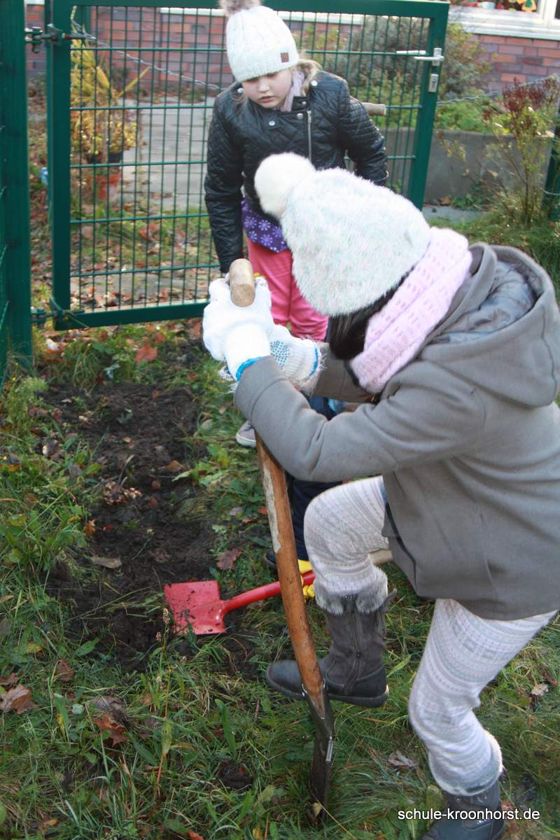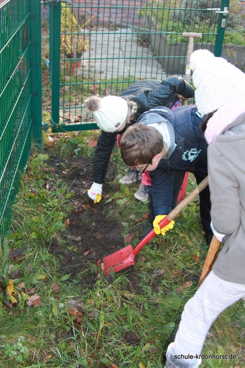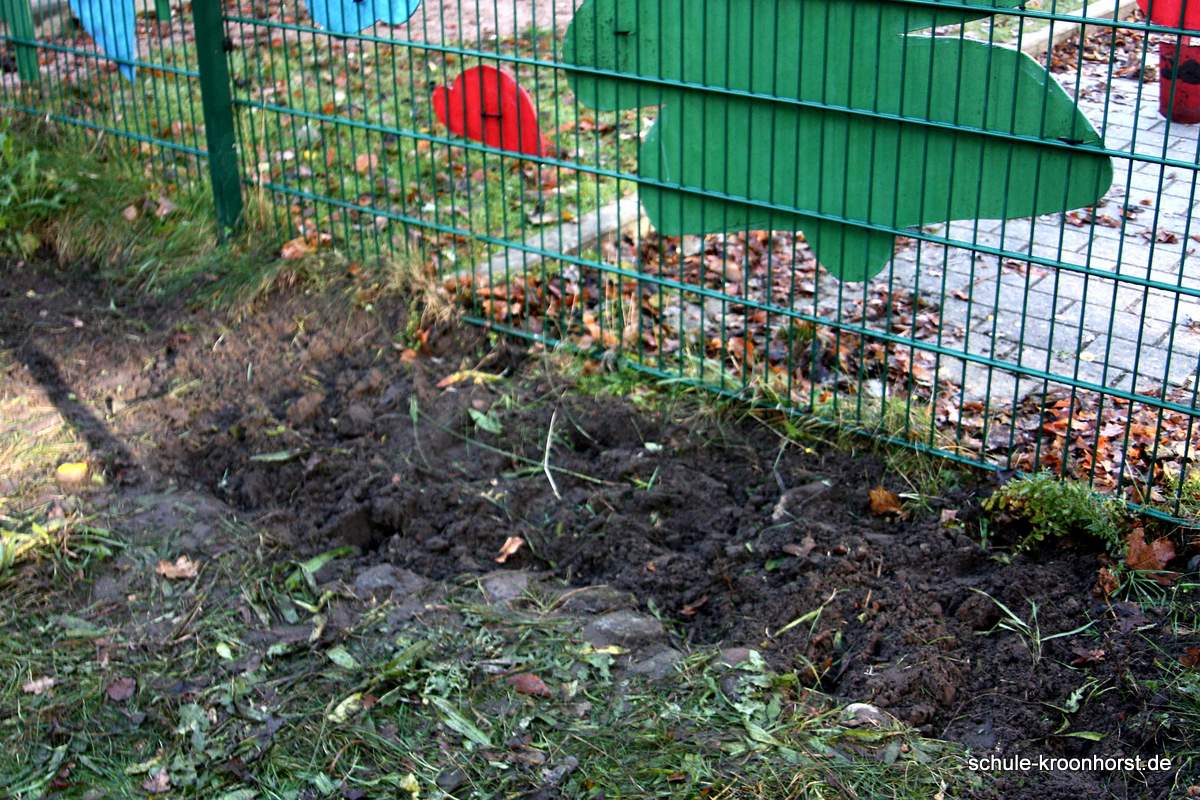 Bei herrlichem Herbstwetter – strahlender Sonnenschein, aber auch recht kalt - konnten wir endlich das vordere Beet am Zaun bearbeiten. Es musste das Unkraut entfernt und mit dem Spaten umgegraben werden. Die Frühlingsblumenzwiebeln haben wir vorsichtig aussortiert, damit wir sie nach dem Bearbeiten des Beetes wieder einpflanzen können. Es sah im Frühjahr schön aus mit den blühenden Hyazinthen, Tulpen, Narzissen und Krokussen.