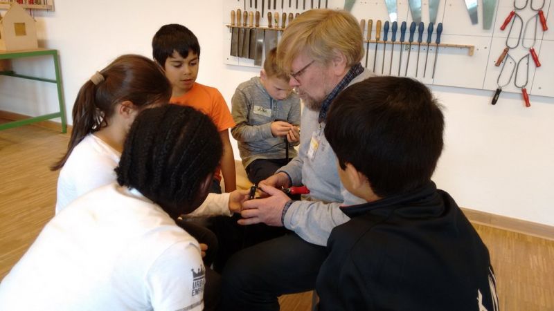 Interessierte Schülerinnen und Schüler lernen spielerisch den Umgang mit Säge, Feile oder Bohrer.